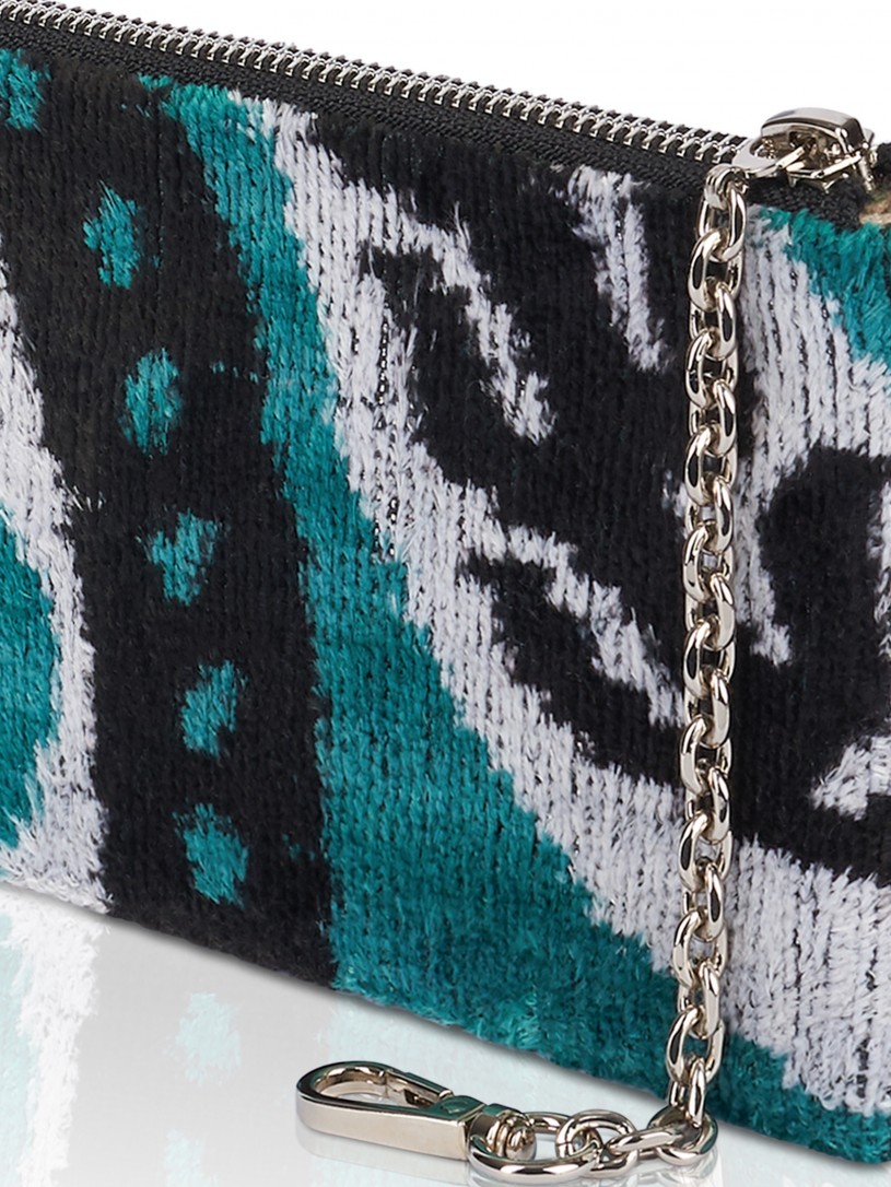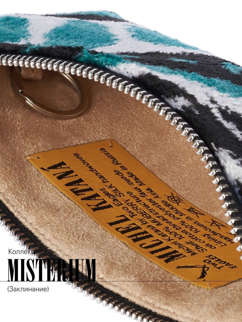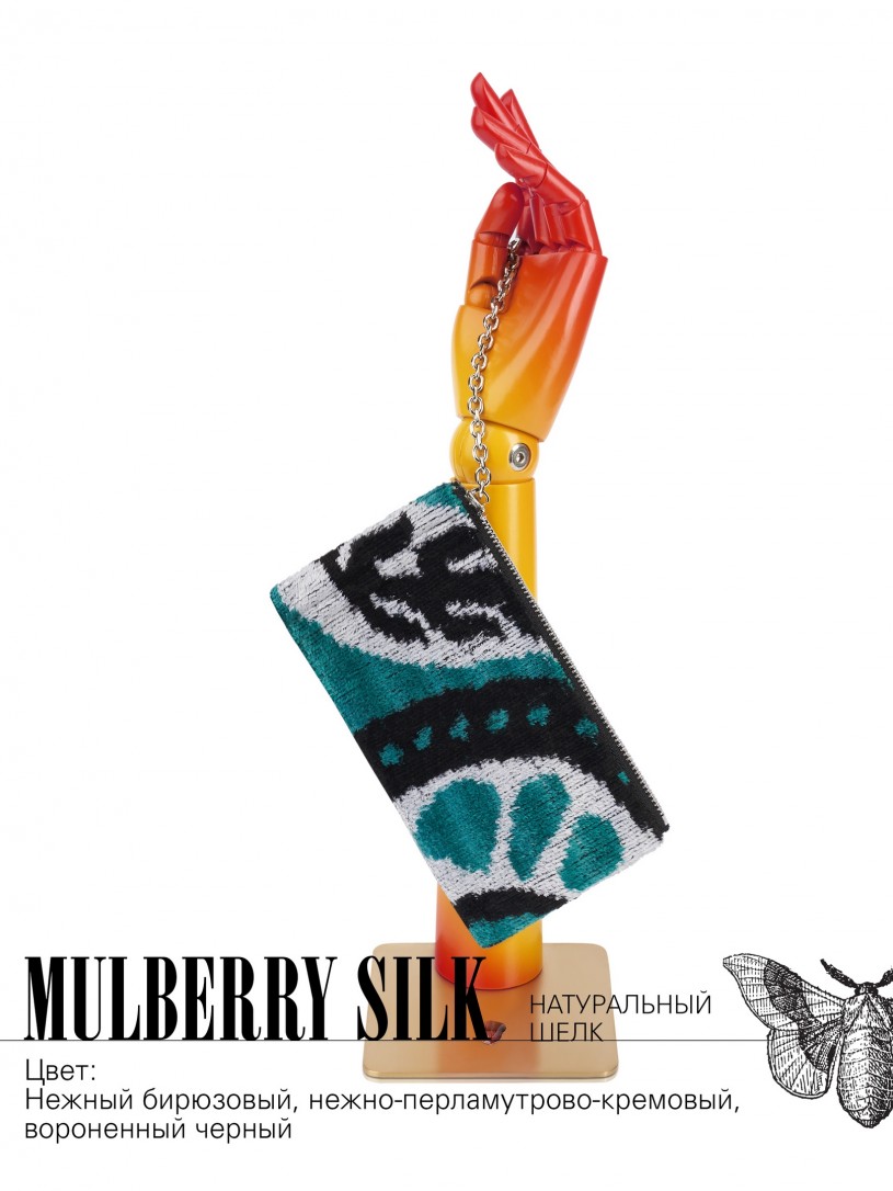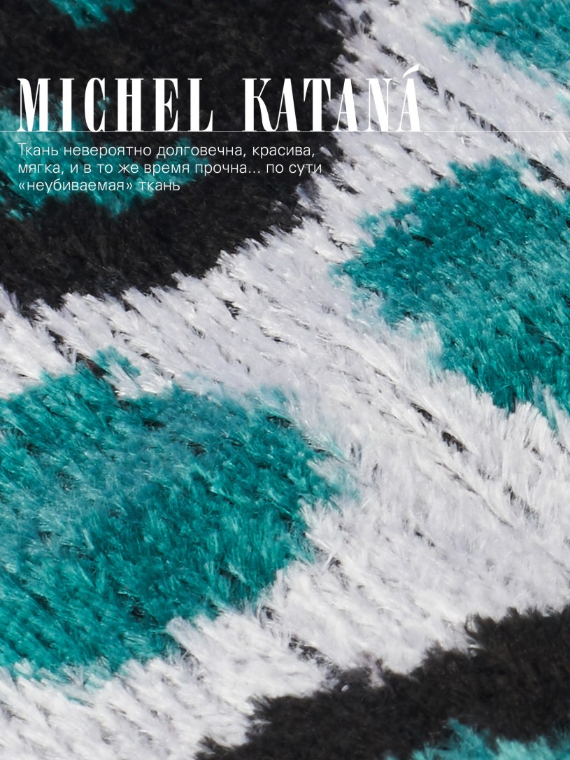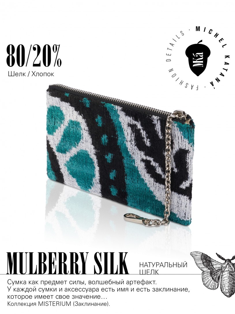 Натуральный шелк, сотканная вручную по традиционной и аутентичной технологии ручного ткачества в Ферганской долине Узбекистана (Маргилан) ткань Бахмаль. Из нитей шелка окрашенных также вручную натуральными красителями. Ткут ее именно крафтово, в домашних условиях на традиционных крафтовых ткацких станках. Нити шелка вотканы в структуру из нитей хлопка, в весовых пропорциях приблизительно 80/20% Шелк/Хлопок. Ткань невероятно долговечна, красива, мягка, и в то же время прочна... по сути "неубиваемая" ткань. Именно на перекрестке этого традиционного характерного, и эстетики дизайнерского восприятия от Michel Kataná и появилась эта коллекция сумок и аксессуаров к ним, на дальнейший пошив которых уходит еще не менее 72 часов работы мастеров для каждой.