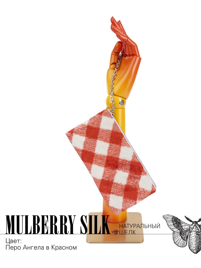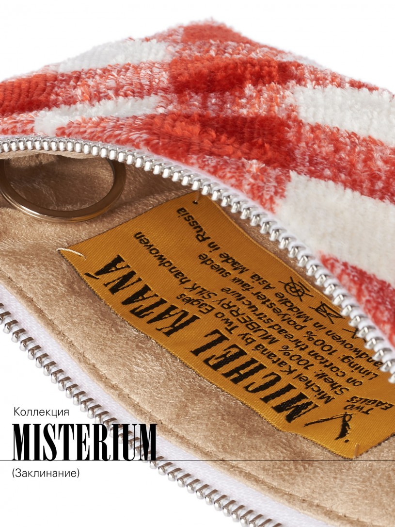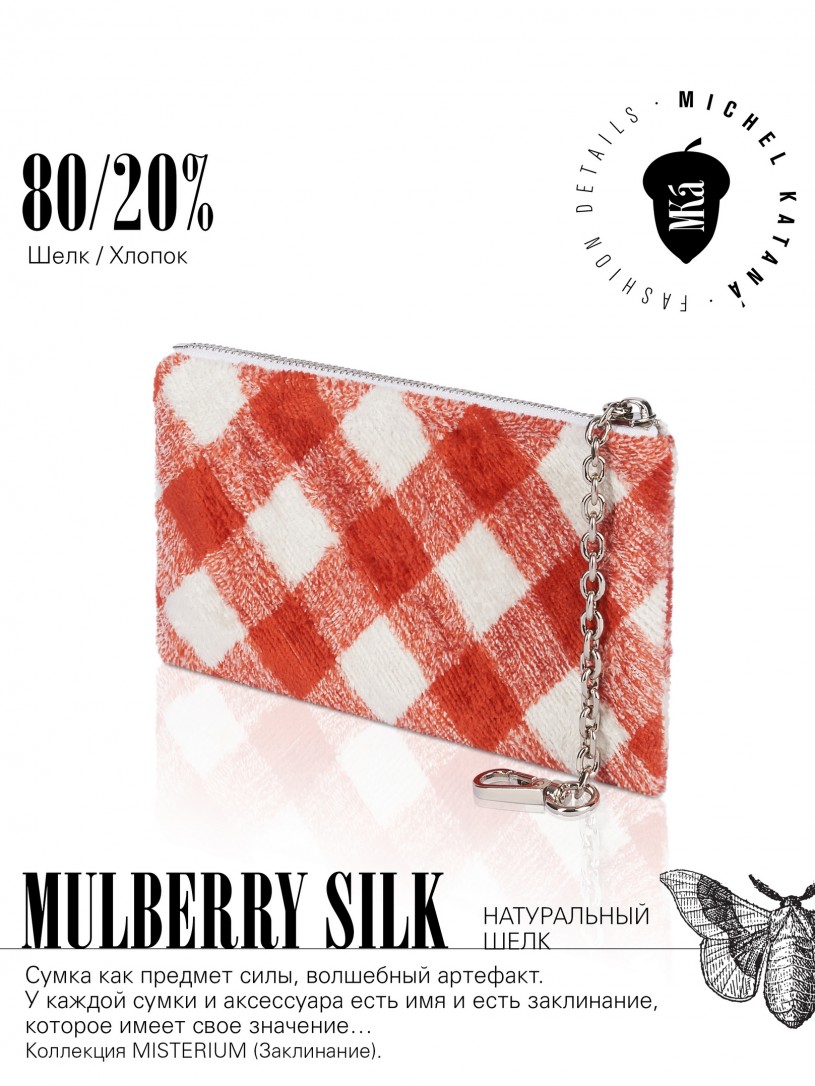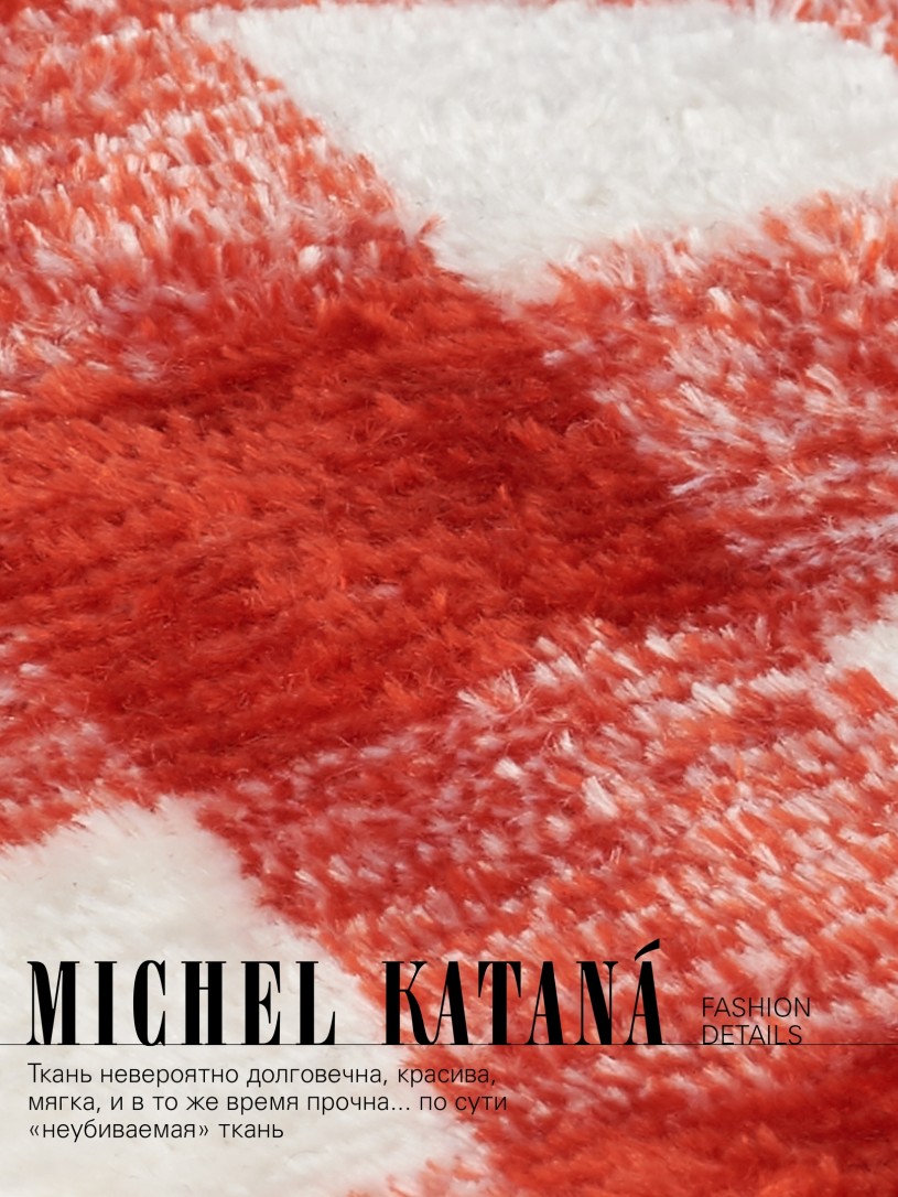 Натуральный шелк, сотканная вручную по традиционной и аутентичной технологии ручного ткачества в Ферганской долине Узбекистана (Маргилан) ткань Бахмаль. Из нитей шелка окрашенных также вручную натуральными красителями. Ткут ее именно крафтово, в домашних условиях на традиционных крафтовых ткацких станках. Нити шелка вотканы в структуру из нитей хлопка, в весовых пропорциях приблизительно 80/20% Шелк/Хлопок. Ткань невероятно долговечна, красива, мягка, и в то же время прочна... по сути "неубиваемая" ткань. Именно на перекрестке этого традиционного характерного, и эстетики дизайнерского восприятия от Michel Kataná и появилась эта коллекция сумок и аксессуаров к ним, на дальнейший пошив которых уходит еще не менее 72 часов работы мастеров для каждой.