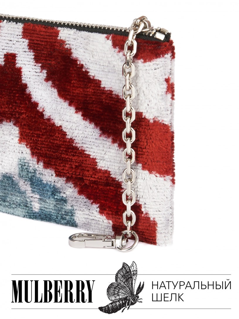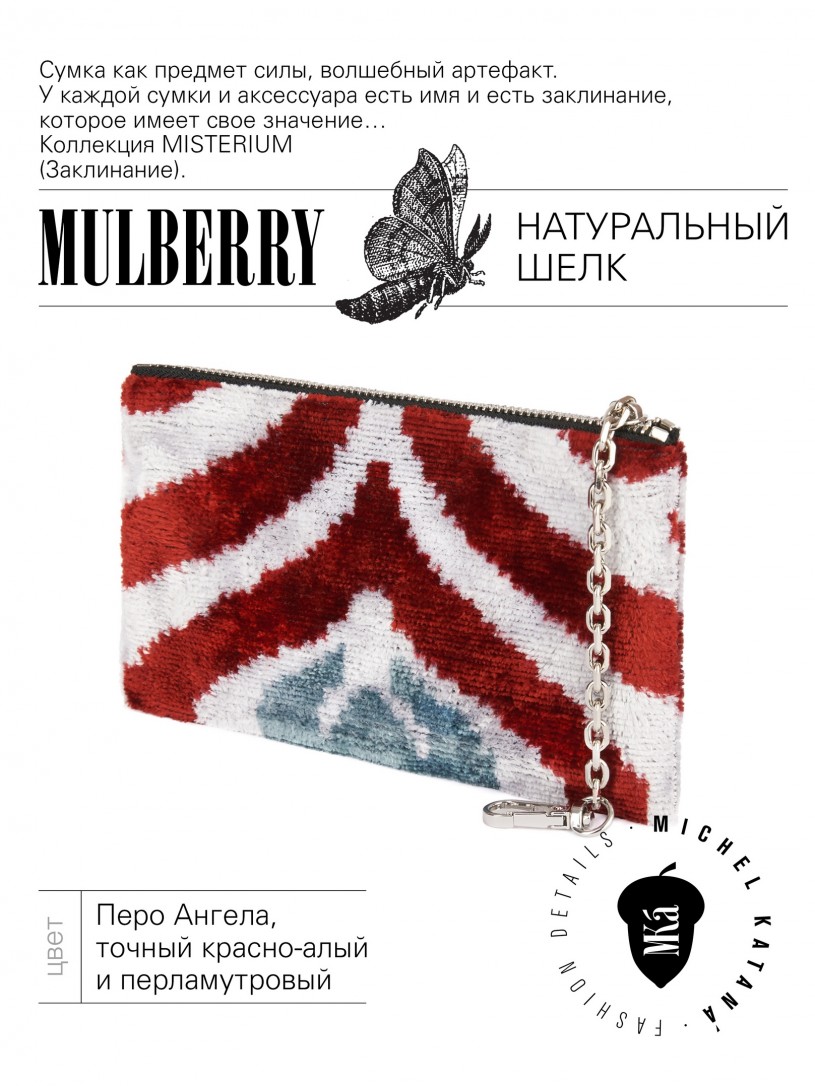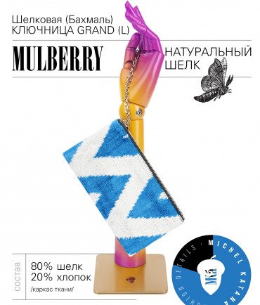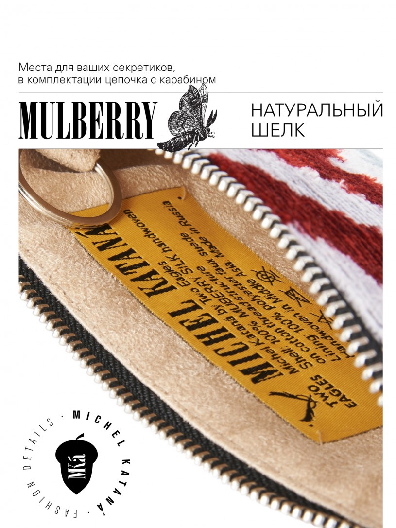 Натуральный шелк, сотканная вручную по традиционной и аутентичной технологии ручного ткачества в Ферганской долине Узбекистана (Маргилан) ткань Бахмаль. Из нитей шелка окрашенных также вручную натуральными красителями. Ткут ее именно крафтово, в домашних условиях на традиционных крафтовых ткацких станках. Нити шелка вотканы в структуру из нитей хлопка, в весовых пропорциях приблизительно 80/20% Шелк/Хлопок. Ткань невероятно долговечна, красива, мягка, и в то же время прочна... по сути "неубиваемая" ткань. Именно на перекрестке этого традиционного характерного, и эстетики дизайнерского восприятия от Michel Kataná и появилась эта коллекция сумок и аксессуаров к ним, на дальнейший пошив которых уходит еще не менее 72 часов работы мастеров для каждой.