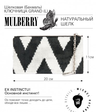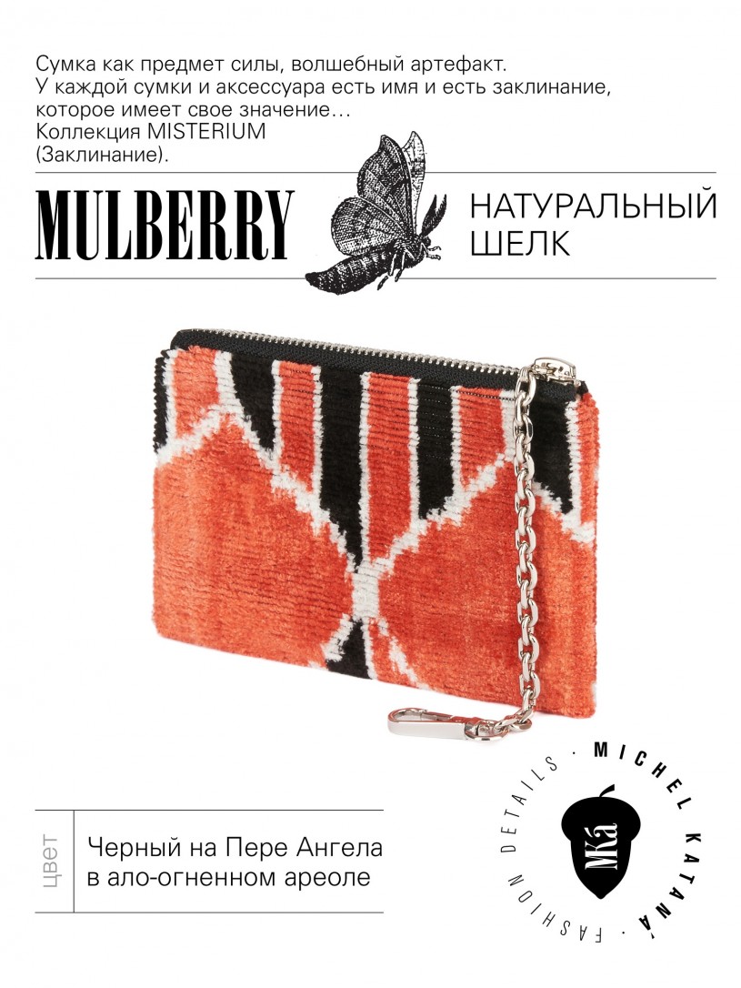 Натуральный шелк, сотканная вручную по традиционной и аутентичной технологии ручного ткачества в Ферганской долине Узбекистана (Маргилан) ткань Бахмаль. Из нитей шелка окрашенных также вручную натуральными красителями. Ткут ее именно крафтово, в домашних условиях на традиционных крафтовых ткацких станках. Нити шелка вотканы в структуру из нитей хлопка, в весовых пропорциях приблизительно 80/20% Шелк/Хлопок. Ткань невероятно долговечна, красива, мягка, и в то же время прочна... по сути "неубиваемая" ткань. Именно на перекрестке этого традиционного характерного, и эстетики дизайнерского восприятия от Michel Kataná и появилась эта коллекция сумок и аксессуаров к ним, на дальнейший пошив которых уходит еще не менее 72 часов работы мастеров для каждой.