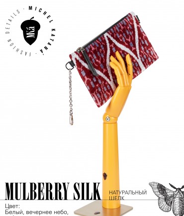 Натуральный шелк, сотканная вручную по традиционной и аутентичной технологии ручного ткачества в Ферганской долине Узбекистана (Маргилан) ткань Бахмаль. Из нитей шелка окрашенных также вручную натуральными красителями. Ткут ее именно крафтово, в домашних условиях на традиционных крафтовых ткацких станках. Нити шелка вотканы в структуру из нитей хлопка, в весовых пропорциях приблизительно 80/20% Шелк/Хлопок. Ткань невероятно долговечна, красива, мягка, и в то же время прочна... по сути "неубиваемая" ткань. Именно на перекрестке этого традиционного характерного, и эстетики дизайнерского восприятия от Michel Kataná и появилась эта коллекция сумок и аксессуаров к ним, на дальнейший пошив которых уходит еще не менее 72 часов работы мастеров для каждой.