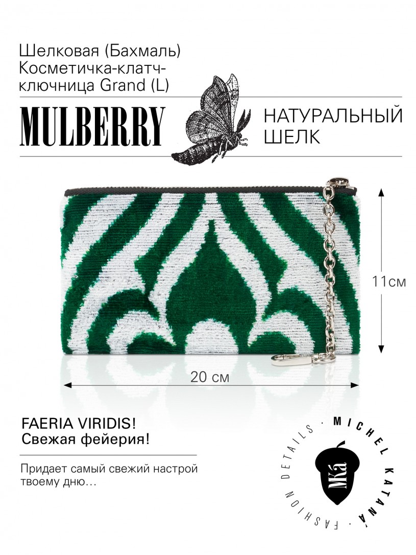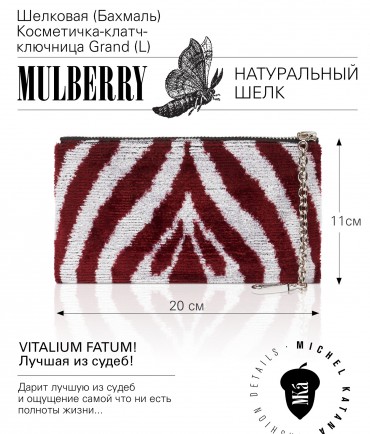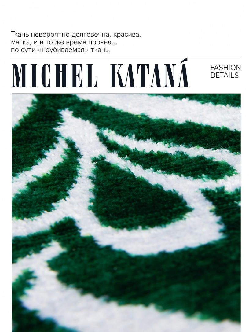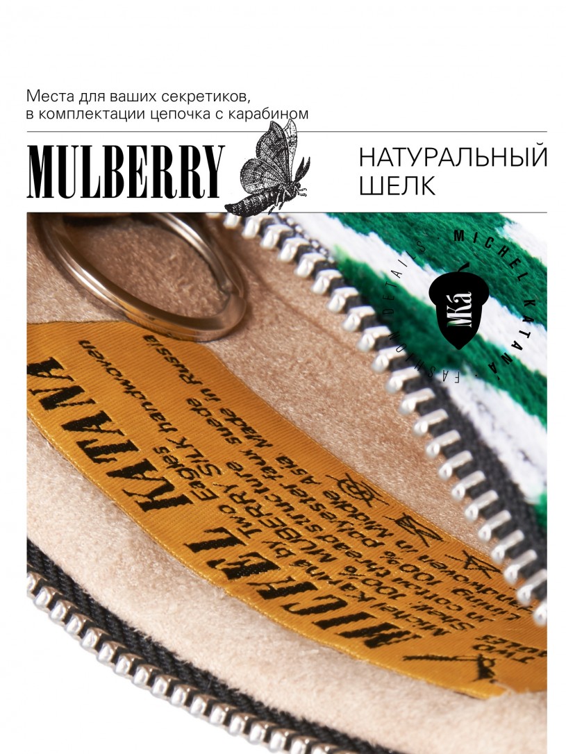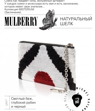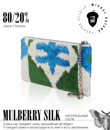 Натуральный шелк, сотканная вручную по традиционной и аутентичной технологии ручного ткачества в Ферганской долине Узбекистана (Маргилан) ткань Бахмаль. Из нитей шелка окрашенных также вручную натуральными красителями. Ткут ее именно крафтово, в домашних условиях на традиционных крафтовых ткацких станках. Нити шелка вотканы в структуру из нитей хлопка, в весовых пропорциях приблизительно 80/20% Шелк/Хлопок. Ткань невероятно долговечна, красива, мягка, и в то же время прочна... по сути "неубиваемая" ткань. Именно на перекрестке этого традиционного характерного, и эстетики дизайнерского восприятия от Michel Kataná и появилась эта коллекция сумок и аксессуаров к ним, на дальнейший пошив которых уходит еще не менее 72 часов работы мастеров для каждой.