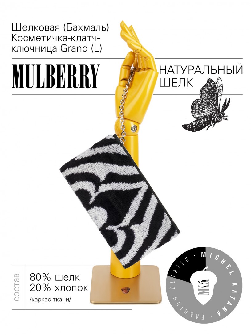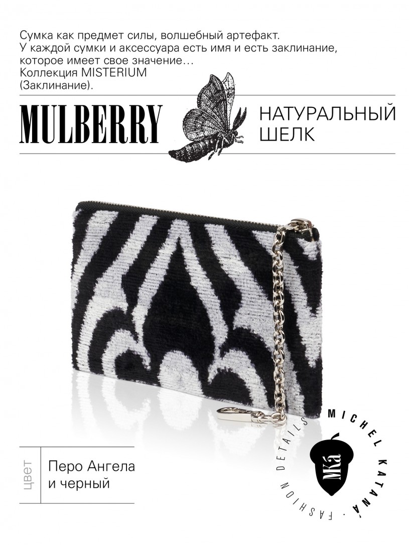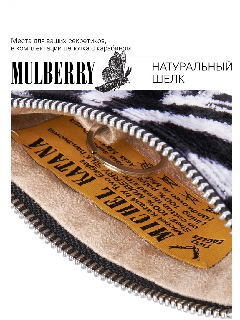 Натуральный шелк, сотканная вручную по традиционной и аутентичной технологии ручного ткачества в Ферганской долине Узбекистана (Маргилан) ткань Бахмаль. Из нитей шелка окрашенных также вручную натуральными красителями. Ткут ее именно крафтово, в домашних условиях на традиционных крафтовых ткацких станках. Нити шелка вотканы в структуру из нитей хлопка, в весовых пропорциях приблизительно 80/20% Шелк/Хлопок. Ткань невероятно долговечна, красива, мягка, и в то же время прочна... по сути "неубиваемая" ткань. Именно на перекрестке этого традиционного характерного, и эстетики дизайнерского восприятия от Michel Kataná и появилась эта коллекция сумок и аксессуаров к ним, на дальнейший пошив которых уходит еще не менее 72 часов работы мастеров для каждой.