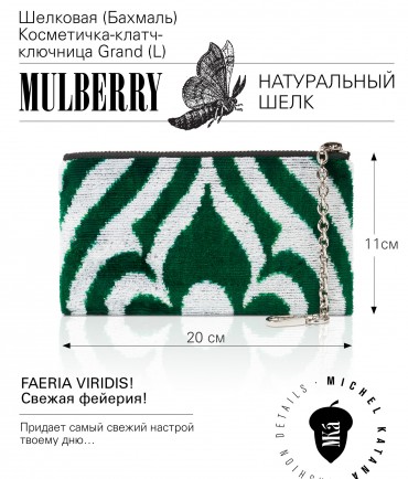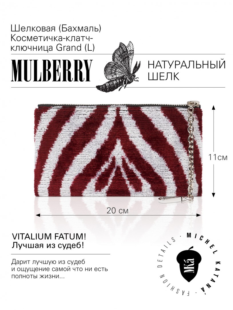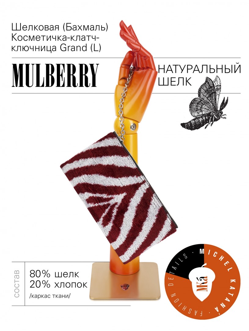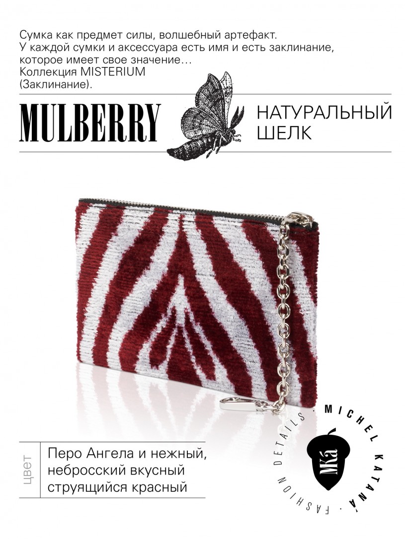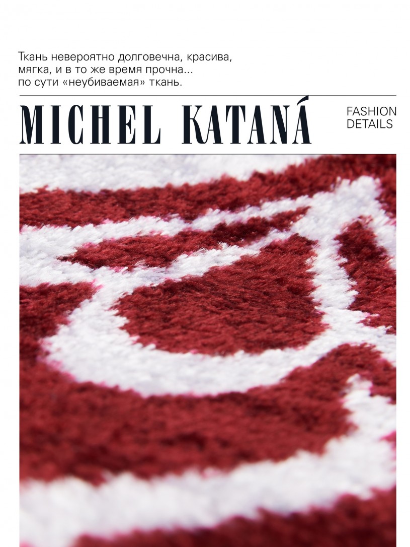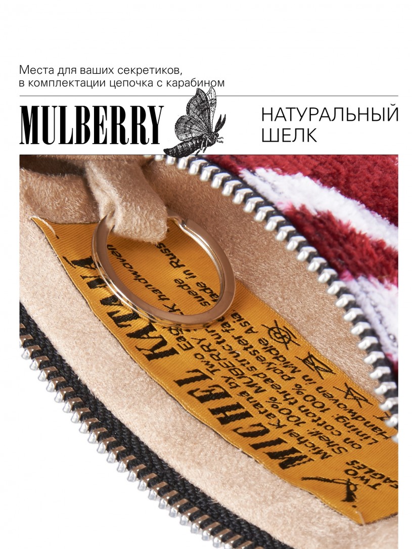Натуральный шелк, сотканная вручную по традиционной и аутентичной технологии ручного ткачества в Ферганской долине Узбекистана (Маргилан) ткань Бахмаль. Из нитей шелка окрашенных также вручную натуральными красителями. Ткут ее именно крафтово, в домашних условиях на традиционных крафтовых ткацких станках. Нити шелка вотканы в структуру из нитей хлопка, в весовых пропорциях приблизительно 80/20% Шелк/Хлопок. Ткань невероятно долговечна, красива, мягка, и в то же время прочна... по сути "неубиваемая" ткань. Именно на перекрестке этого традиционного характерного, и эстетики дизайнерского восприятия от Michel Kataná и появилась эта коллекция сумок и аксессуаров к ним, на дальнейший пошив которых уходит еще не менее 72 часов работы мастеров для каждой.