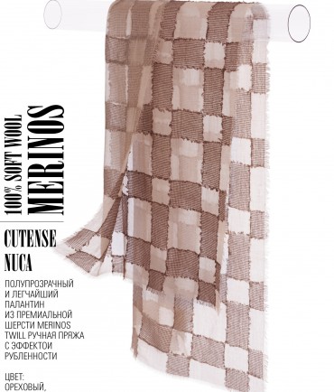 Шелк Mulberry, крафтовая нить ручного прядения, нарочито рыхлое плетение Plain, нежная полупрозрачная ткань Chiffon. Вес изделия 60г (30 г/м2). Неравномерная толщина ручной пряжи и разрыхленность ячейчатой структуры плетения позволили создать невесомо-легкую полупрозрачную текстуру полотна и отлично драпирующуюся мягчайшую шелковую ткань - это отличительные изысканные черты палантинов от Michel Kataná