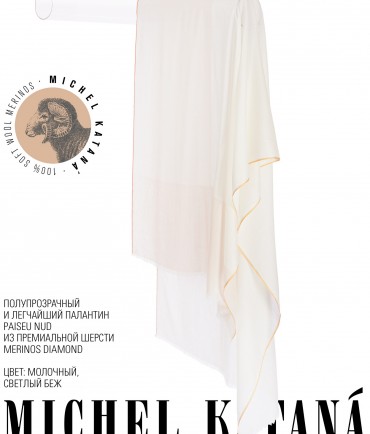 Шелк Mulberry, крафтовая нить ручного прядения, сотканная вручную ткань NIVEZE средней плотности. Ручная подбивка кромки. Вес изделия 75г (40 г/м2). Неравномерная толщина ручной пряжи, возможные утолщения и узелки, некоторая разрыхленность ячейчатой структуры плетения позволили создать легкую, полупрозрачную, самодостаточную, крафтовую шелковую, отлично драпирующуюся мягкую ткань - это отличительные изысканные черты палантинов от Michel Kataná