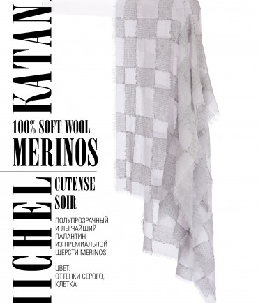 Огромный, воздушный. Нарочито рыхлое плетение Plain крафтовой нитью ручного прядения, легчайшая полупрозрачная ткань Lambwool Soft. Вес изделия 100г (40 г/м2). Неравномерная толщина ручной пряжи, возможные утолщения и узелки, разрыхленность ячейчатой структуры плетения позволили создать невесомо-легкую полупрозрачную, отлично драпирующуюся мягкую ткань - это отличительные изысканные черты палантинов от Michel Kataná