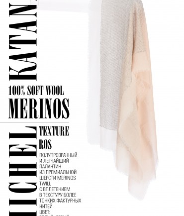 Нарочито крупное плетение Jali крафтовой нитью ручного прядения, полупрозрачная ткань. Вес изделия 120г (60 г/м2). Неравномерная по толщине ручная пряжа, возможные утолщения и узелки, разрыхленность ячейчатой структуры плетения позволили создать легкую полупрозрачную, отлично драпирующуюся ткань - это отличительные изысканные черты палантинов от Michel Kataná