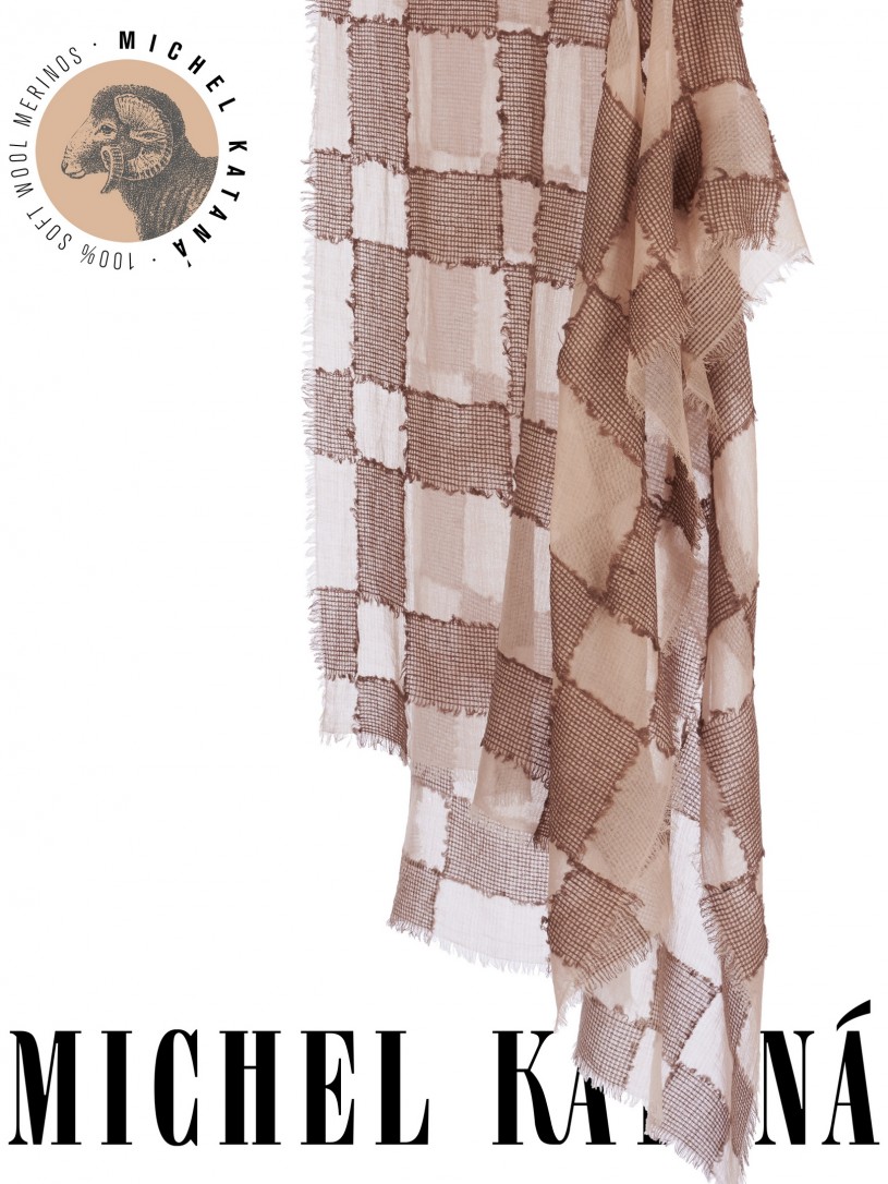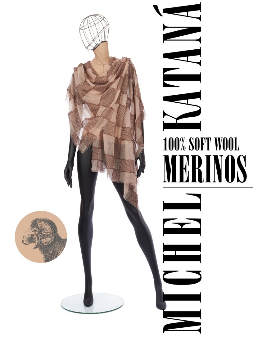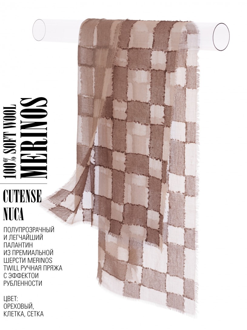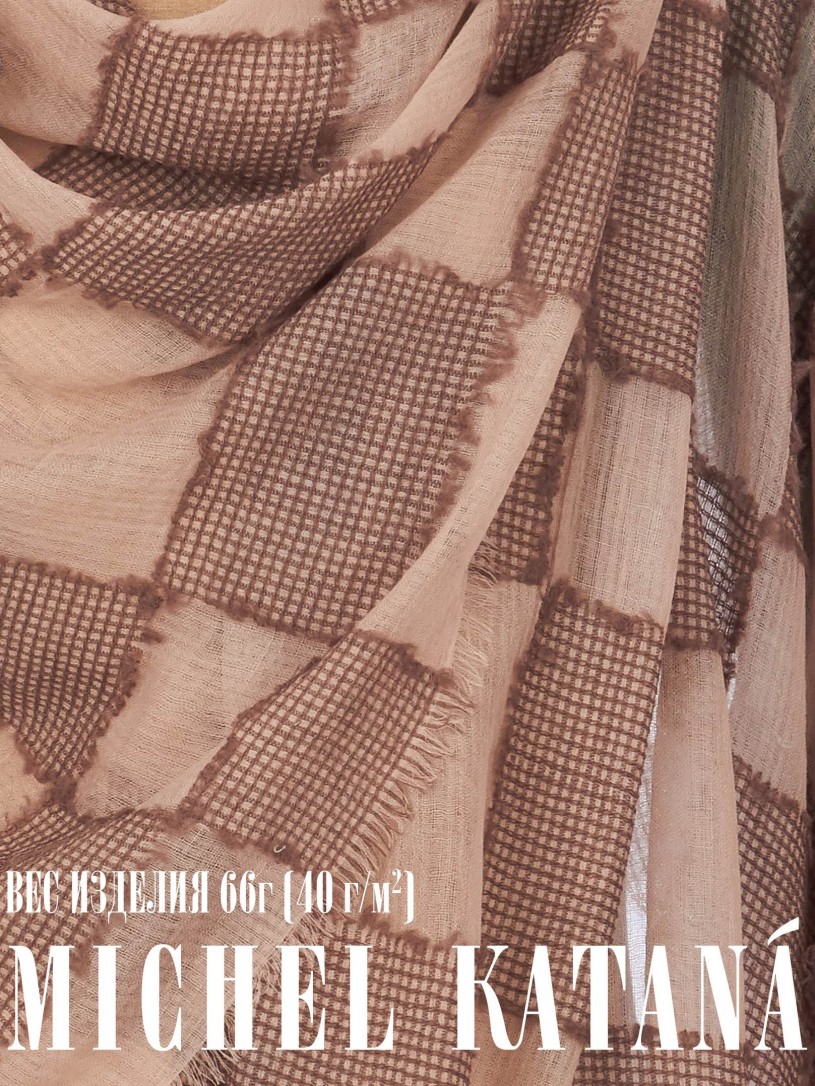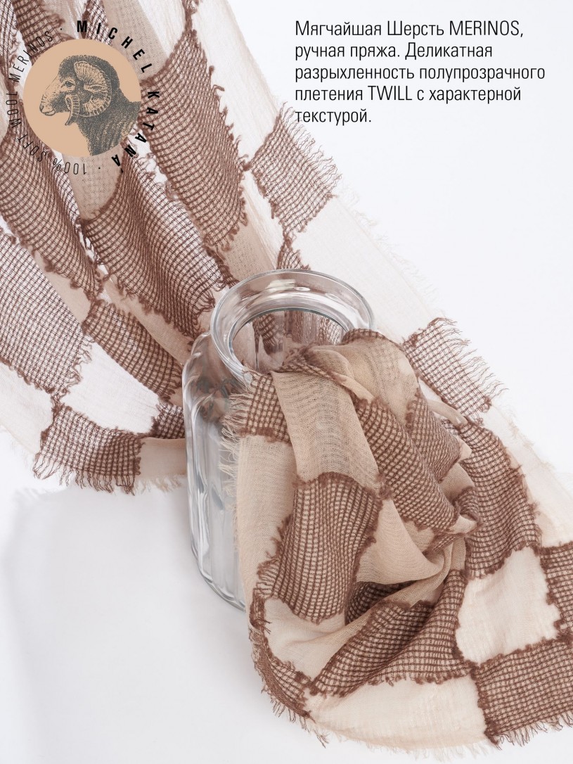 Мягчайшая Шерсть MERINOS, ручная пряжа. Деликатное и некая разрыхленность полупрозрачного плетения TWILL с характерной текстурой. Нежная в прикосновении к шее, гладкая, отлично держащая форму ткань. Вес изделия 66г (40 г/м2). Небросский, но в то же время четкий в деталь рисунок нанесенный техникой PLAIN SCRREN PRINTING (трафаретная печать на столе), и некоторые модели в цифровой печати, позволили получить невероятную по текстуре ткань-вуаль с еле заметной насыщенностью между лицевой и оборотной поверхностями - все это отличительные изысканные черты линеек палантинов от Michel Kataná