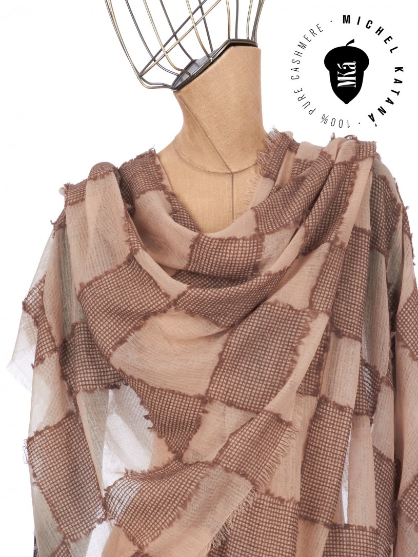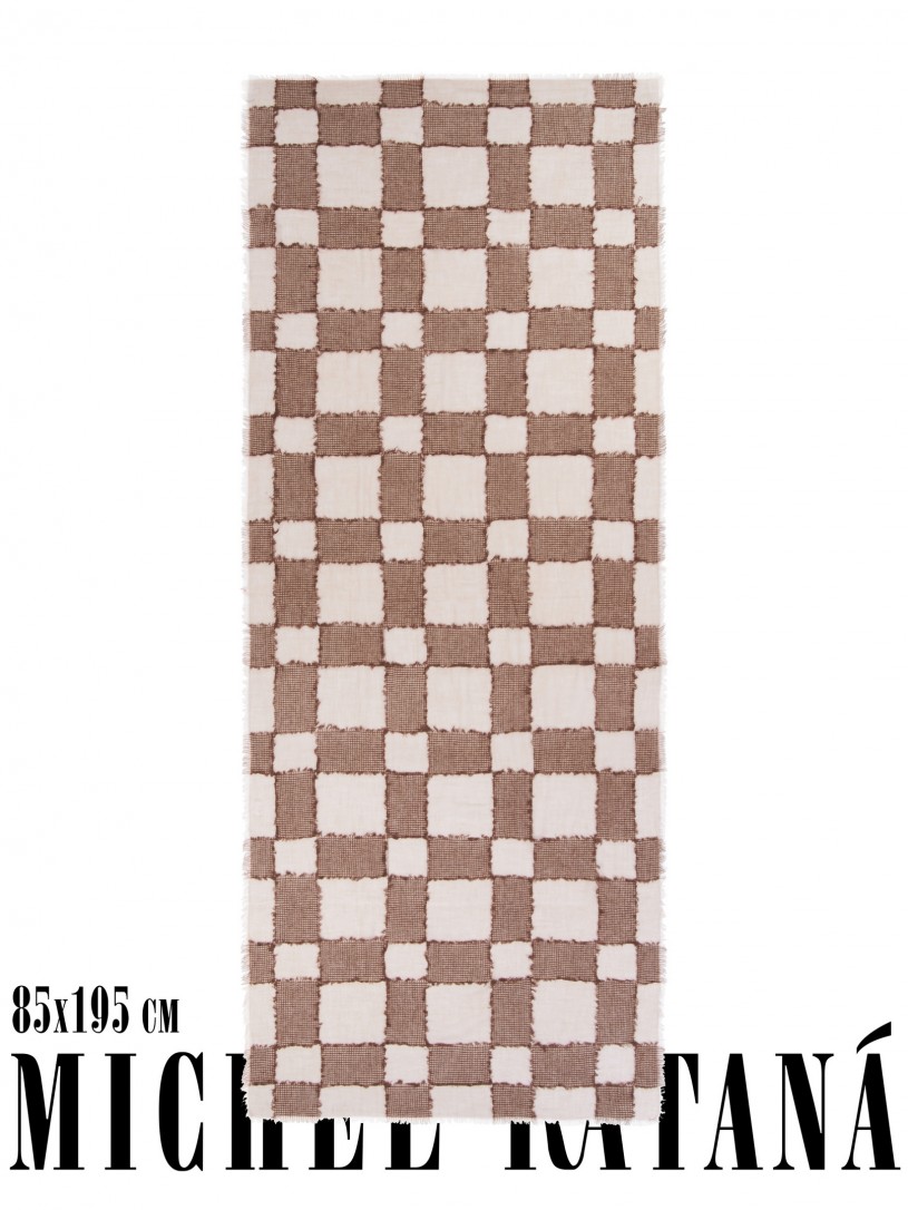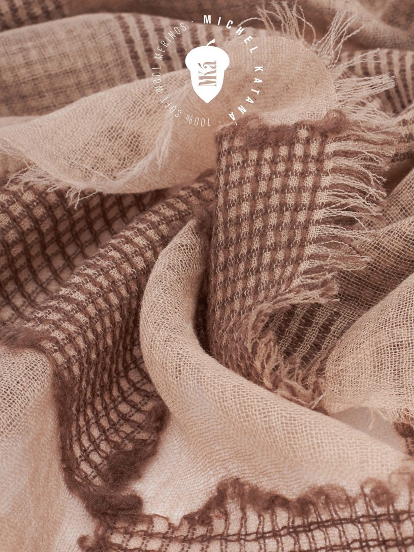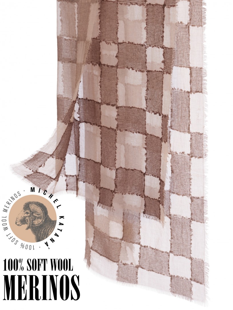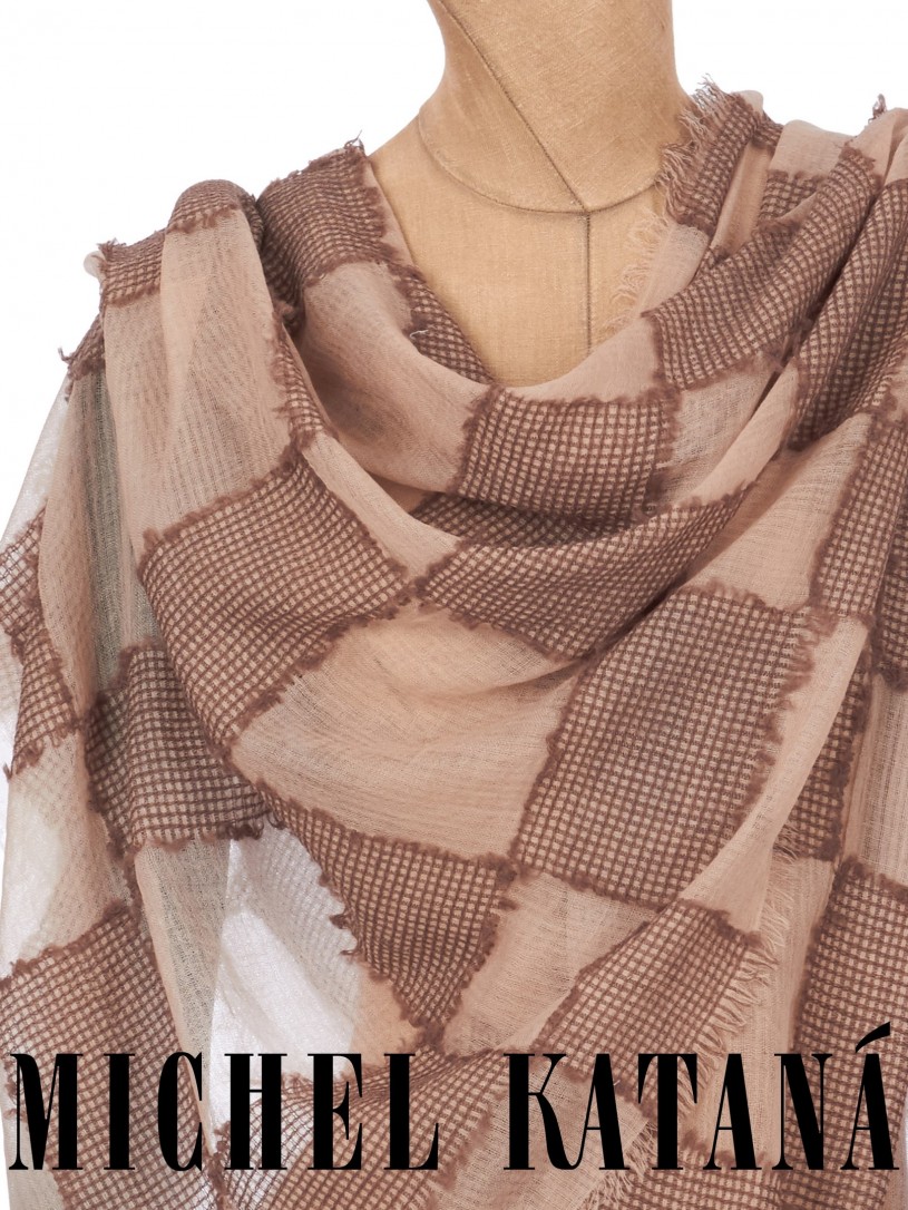 Мягчайшая Шерсть MERINOS, ручная пряжа. Деликатное и некая разрыхленность полупрозрачного плетения TWILL с характерной текстурой. Нежная в прикосновении к шее, гладкая, отлично держащая форму ткань. Вес изделия 66г (40 г/м2). Небросский, но в то же время четкий в деталь рисунок нанесенный техникой PLAIN SCRREN PRINTING (трафаретная печать на столе), и некоторые модели в цифровой печати, позволили получить невероятную по текстуре ткань-вуаль с еле заметной насыщенностью между лицевой и оборотной поверхностями - все это отличительные изысканные черты линеек палантинов от Michel Kataná