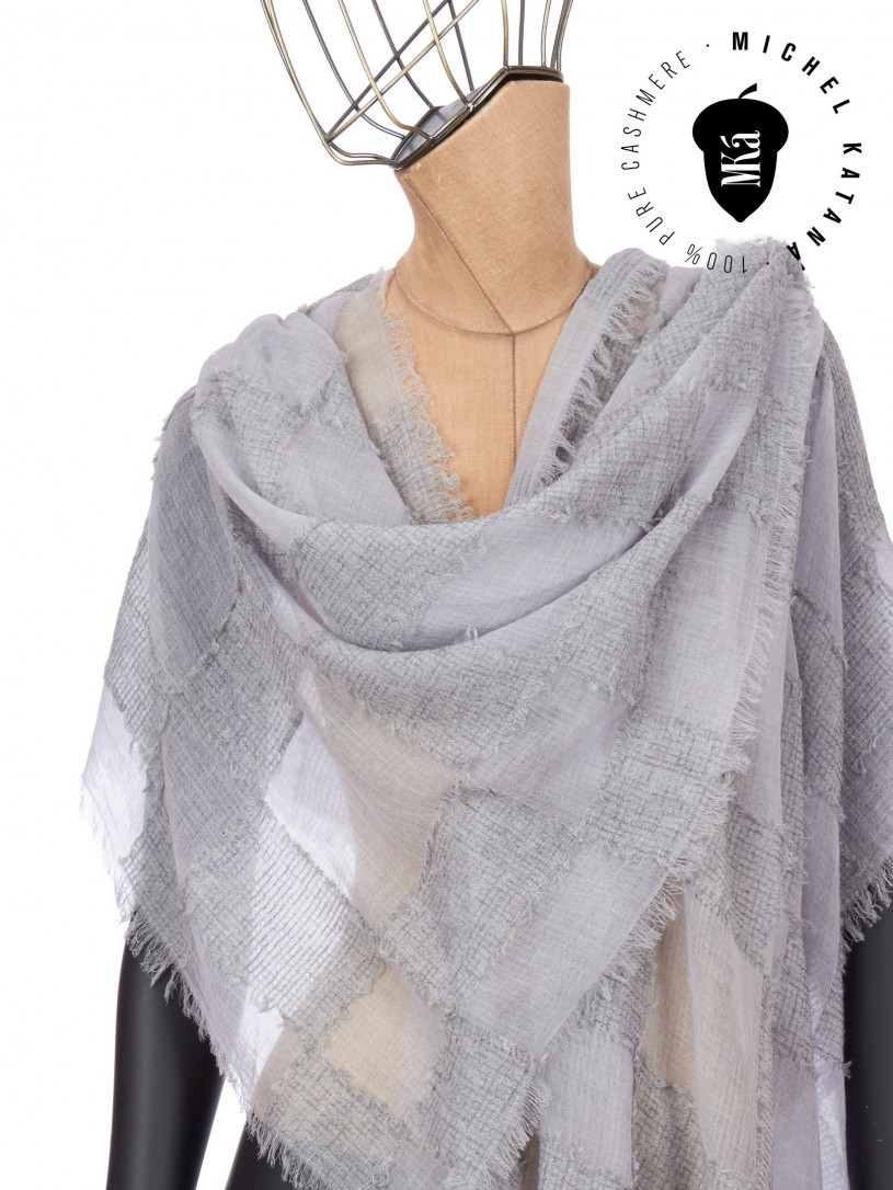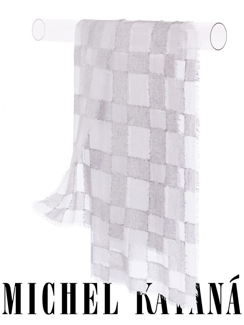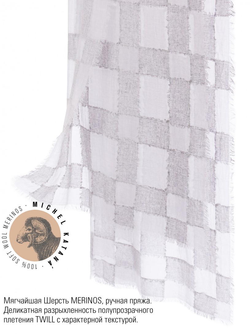 Мягчайшая Шерсть MERINOS, ручная пряжа. Деликатное и некая разрыхленность полупрозрачного плетения TWILL с характерной текстурой. Нежная в прикосновении к шее, гладкая, отлично держащая форму ткань. Вес изделия 66г (40 г/м2). Небросский, но в то же время четкий в деталь рисунок нанесенный техникой PLAIN SCRREN PRINTING (трафаретная печать на столе), и некоторые модели в цифровой печати, позволили получить невероятную по текстуре ткань-вуаль с еле заметной насыщенностью между лицевой и оборотной поверхностями - все это отличительные изысканные черты линеек палантинов от Michel Kataná