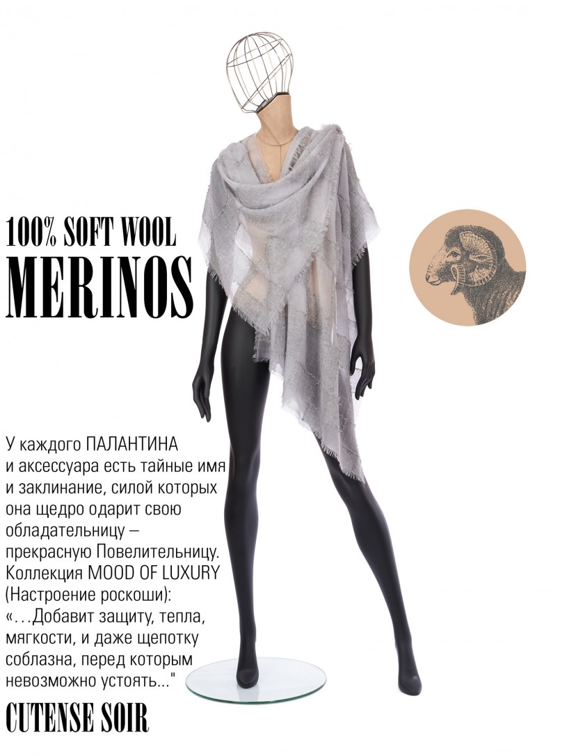 «...Палантин - обволакивающая вуаль, защитная оболочка и мистический амулет. Дар древнейшего, тишайшего и порой нераспознаваемого желания обернуться в него, согреться и спрятаться. И в то же время показать себя, им и через него. Как символы утонченности, предмет силы, волшебный и роскошный древнейший и красивый артефакт желаний и влечений Homo Sapiens...".