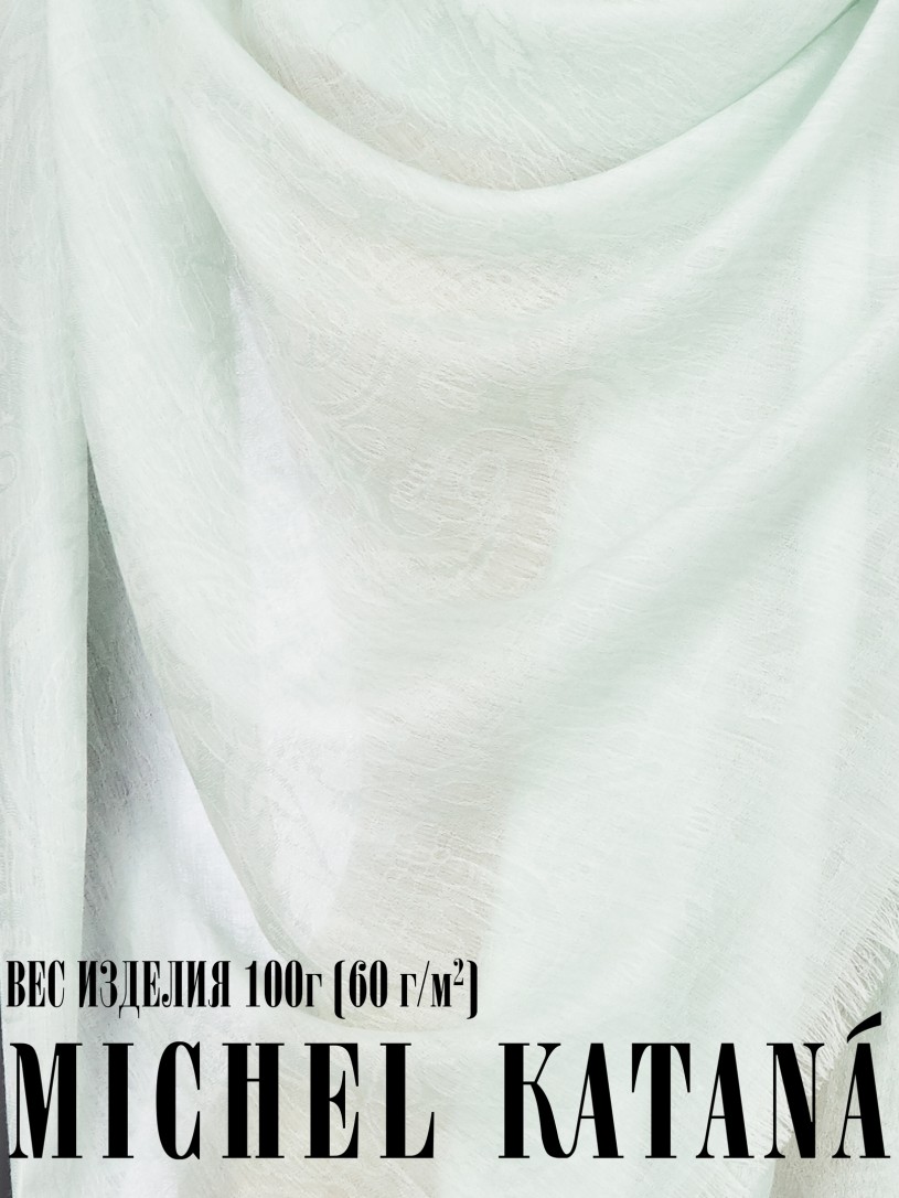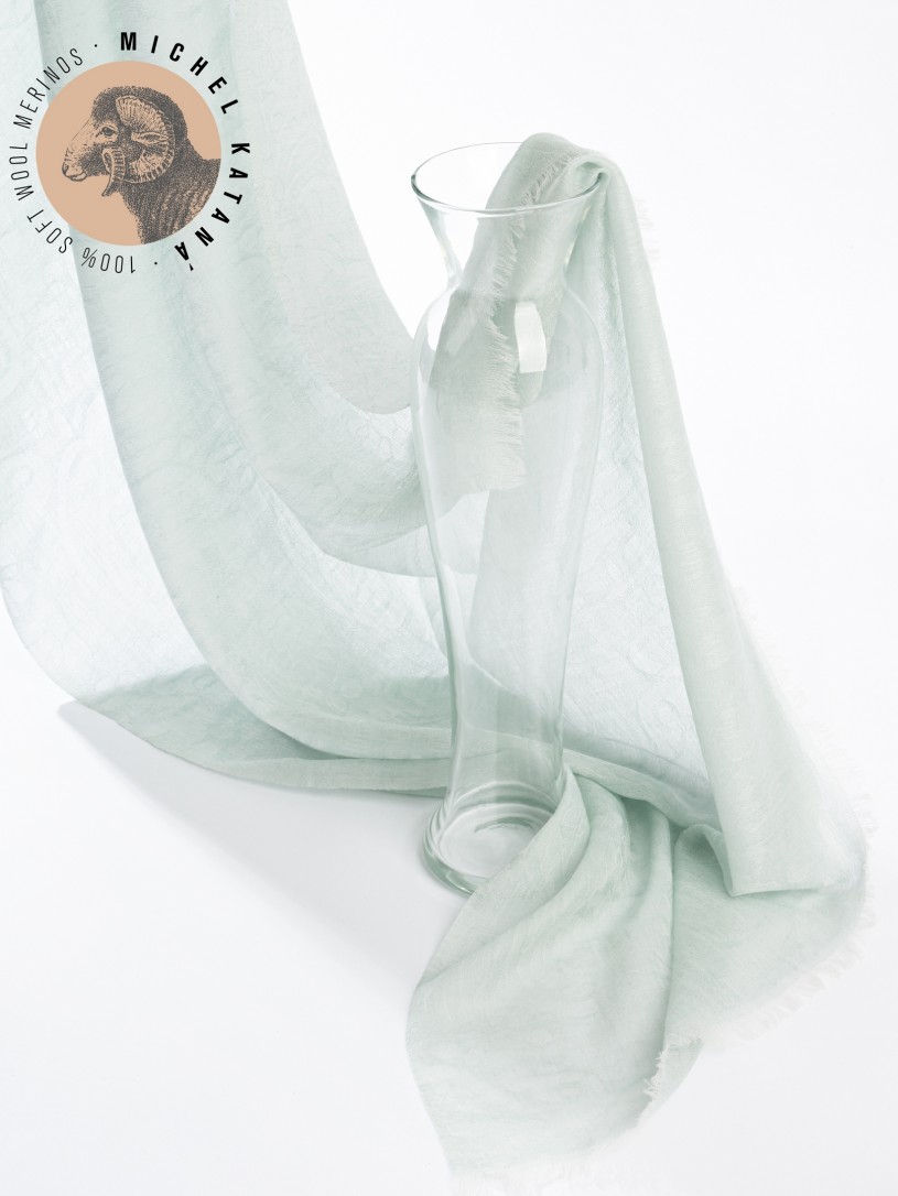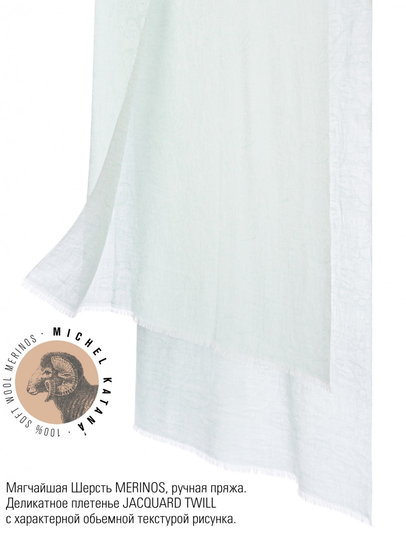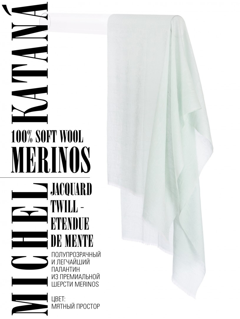 Мягчайшая Шерсть MERINOS, ручная пряжа. Деликатное плетенье JACQUARD TWILL с характерной обьемной текстурой рисунка. Нежная в прикосновении к шее, гладкая, отлично держащая форму ткань. Вес изделия 100г (60 г/м2). Небросский, но в то же время четкий в деталь рисунок нанесенный техникой PLAIN SCRREN PRINTING (трафаретная печать на столе), и некоторые модели в цифровой печати, позволили получить невероятную по текстуре ткань-вуаль с еле заметной насыщенностью между лицевой и оборотной поверхностями - все это отличительные изысканные черты линеек палантинов от Michel Kataná
