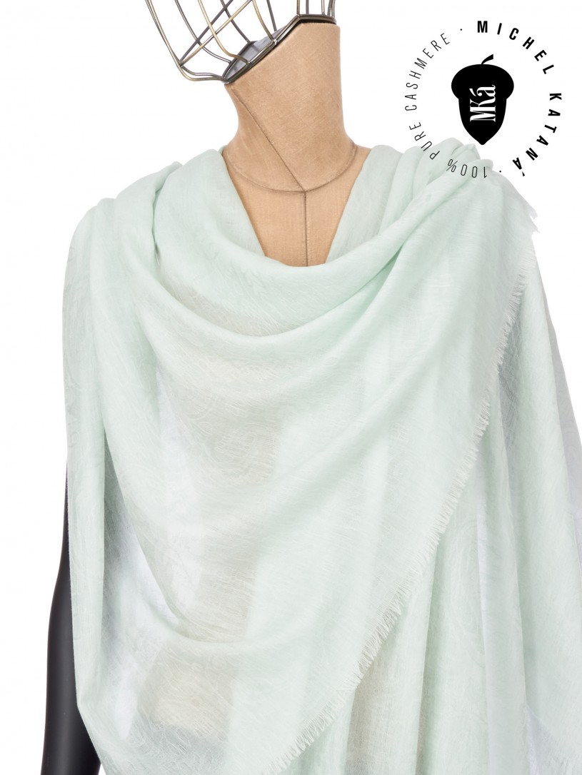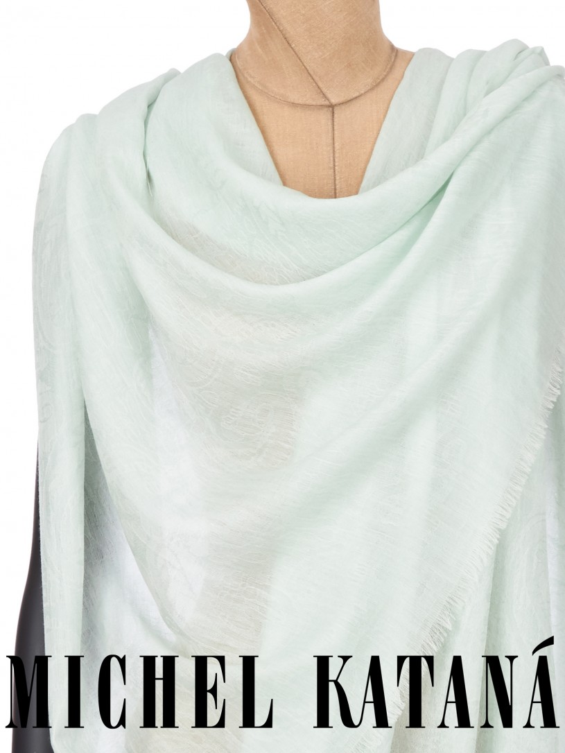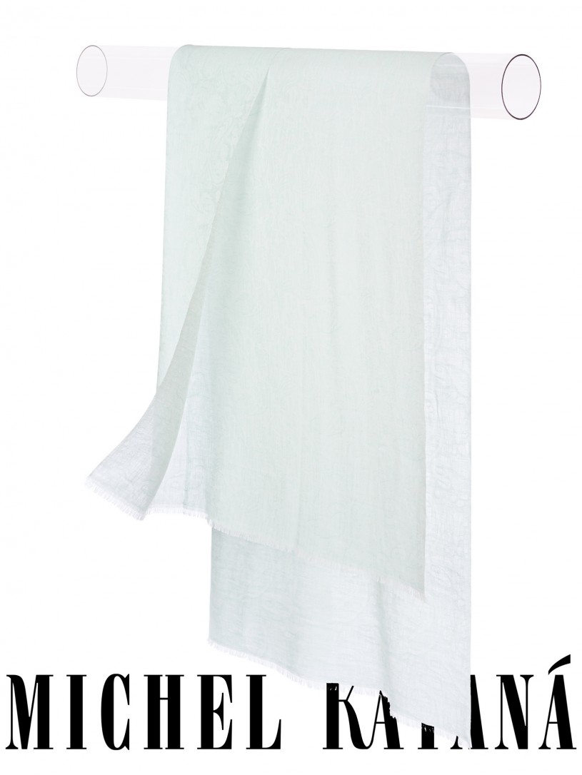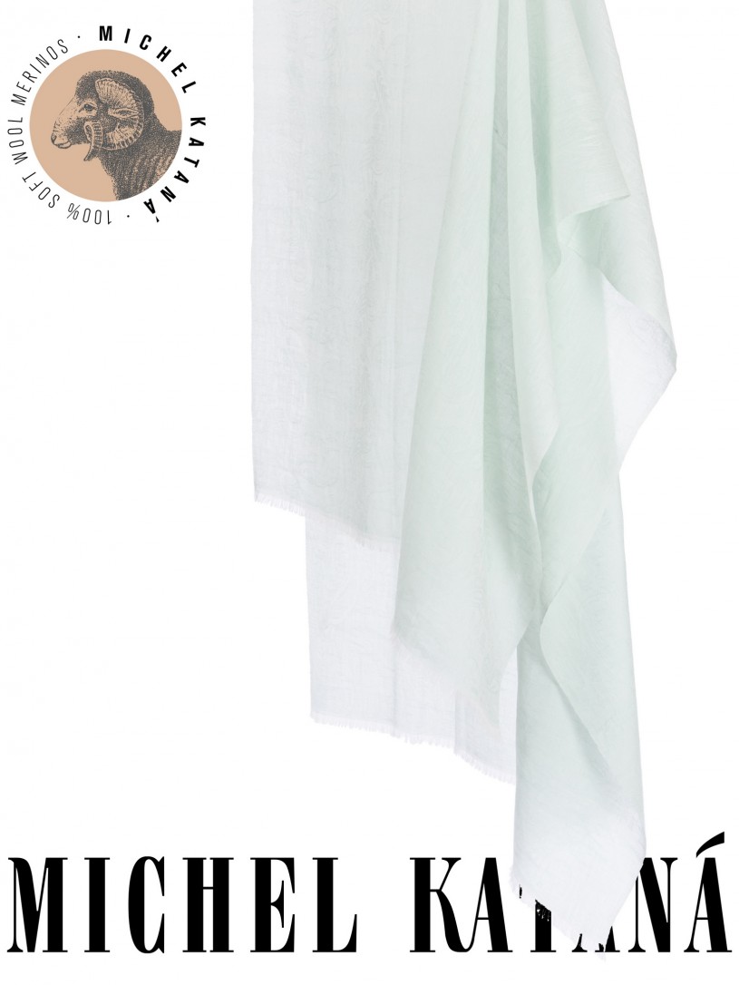 Мягчайшая Шерсть MERINOS, ручная пряжа. Деликатное плетенье JACQUARD TWILL с характерной обьемной текстурой рисунка. Нежная в прикосновении к шее, гладкая, отлично держащая форму ткань. Вес изделия 100г (60 г/м2). Небросский, но в то же время четкий в деталь рисунок нанесенный техникой PLAIN SCRREN PRINTING (трафаретная печать на столе), и некоторые модели в цифровой печати, позволили получить невероятную по текстуре ткань-вуаль с еле заметной насыщенностью между лицевой и оборотной поверхностями - все это отличительные изысканные черты линеек палантинов от Michel Kataná