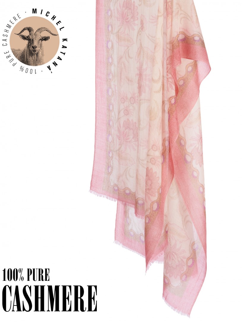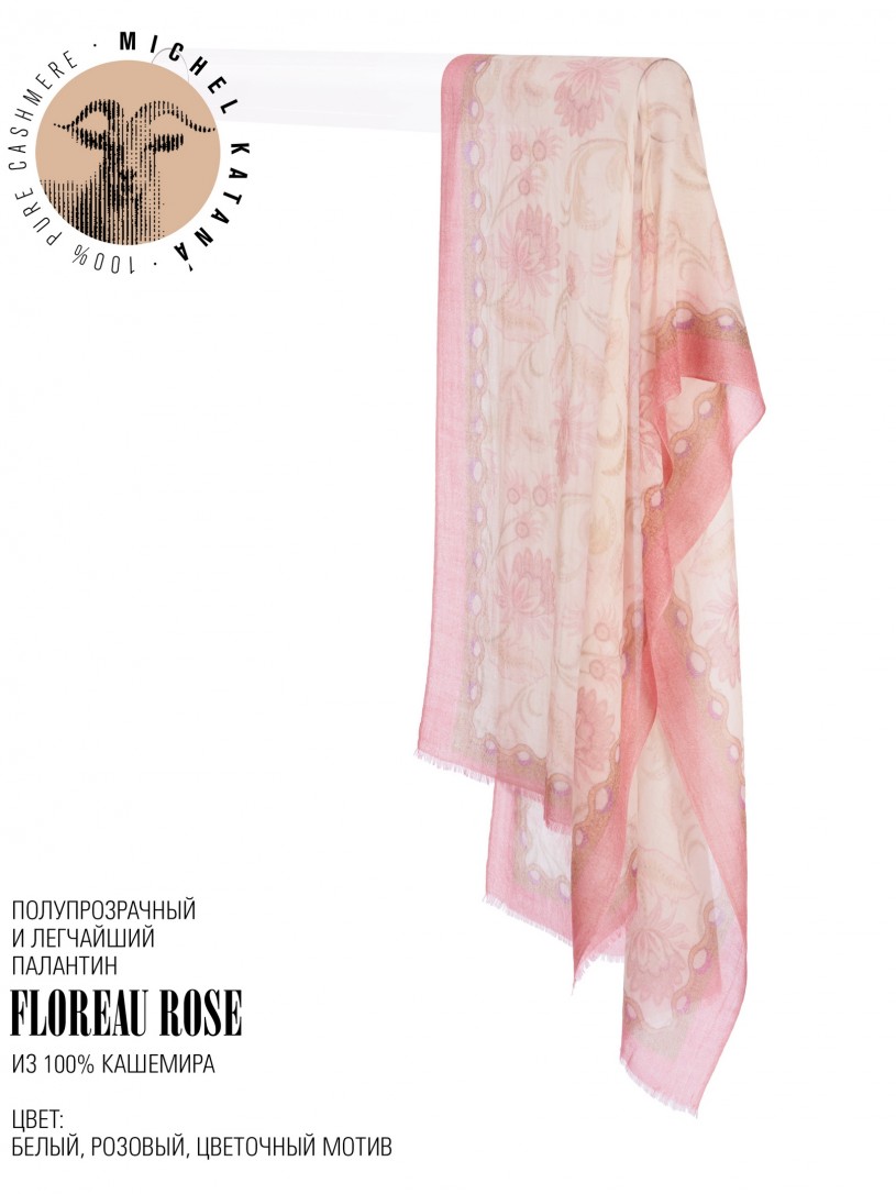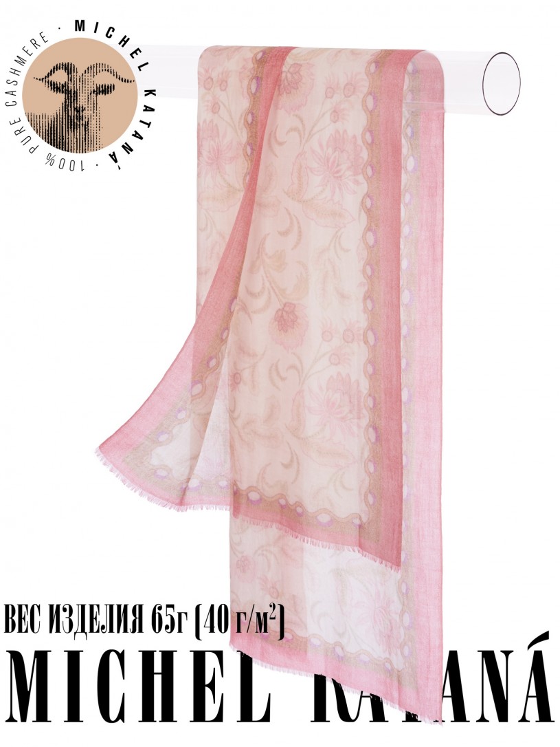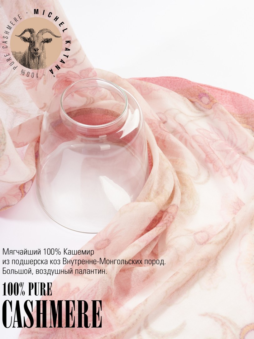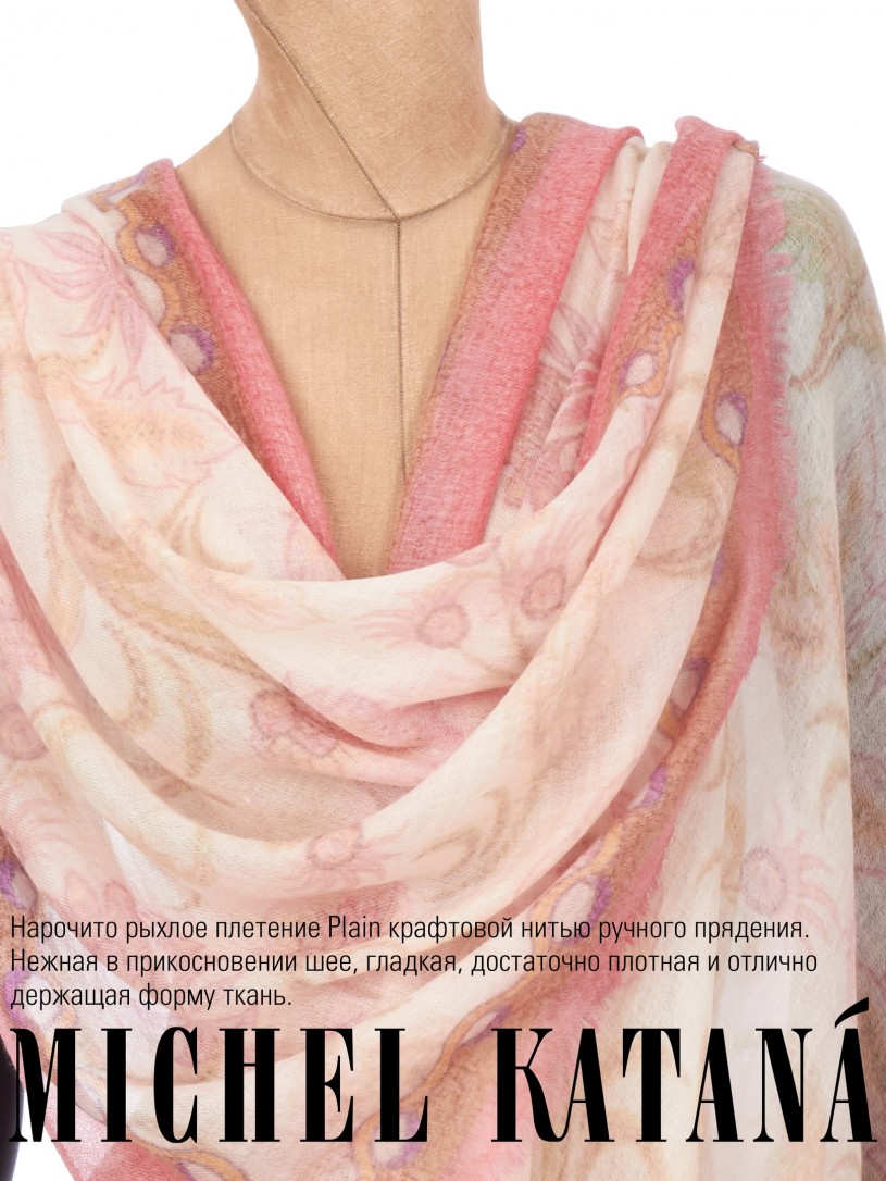 Мягчайший 100% Кашемир из подшерска коз Внутренне-Монгольских пород. Большой, воздушный палантин. Нарочито рыхлое плетение Plain крафтовой нитью ручного прядения. Нежная в прикосновении шее, гладкая, достаточно плотная и отлично держащая форму ткань. Вес изделия 65г (40 г/м2). Неравномерная толщина ручной пряжи, возможные утолщения и узелки, разрыхленность ячейчатой структуры плетения позволили создать невесомо-легкую полупрозрачную, отлично драпирующуюся мягкую ткань. Четкий в деталь рисунок вручную окрашенной пряжи кашемира позволило получить абсолютно одинаковую насыщенность между лицевой и оборотной поверхностями - все это отличительные изысканные черты линеек шарфов от Michel Kataná
