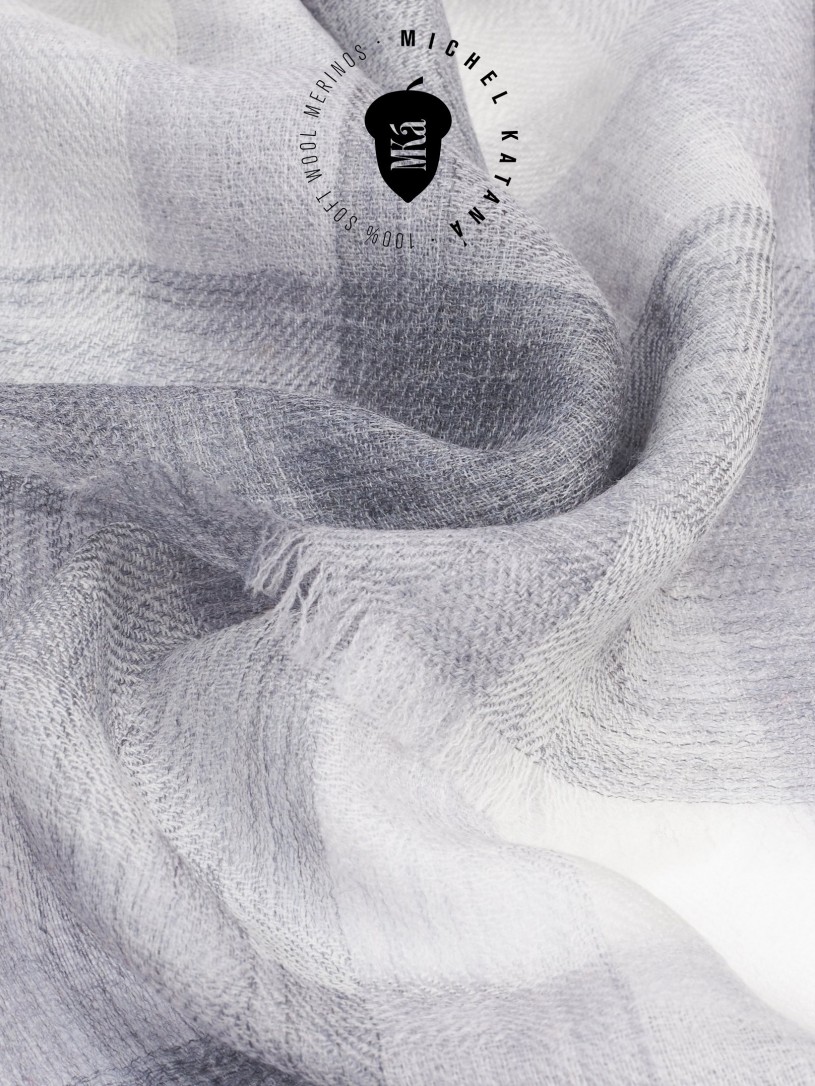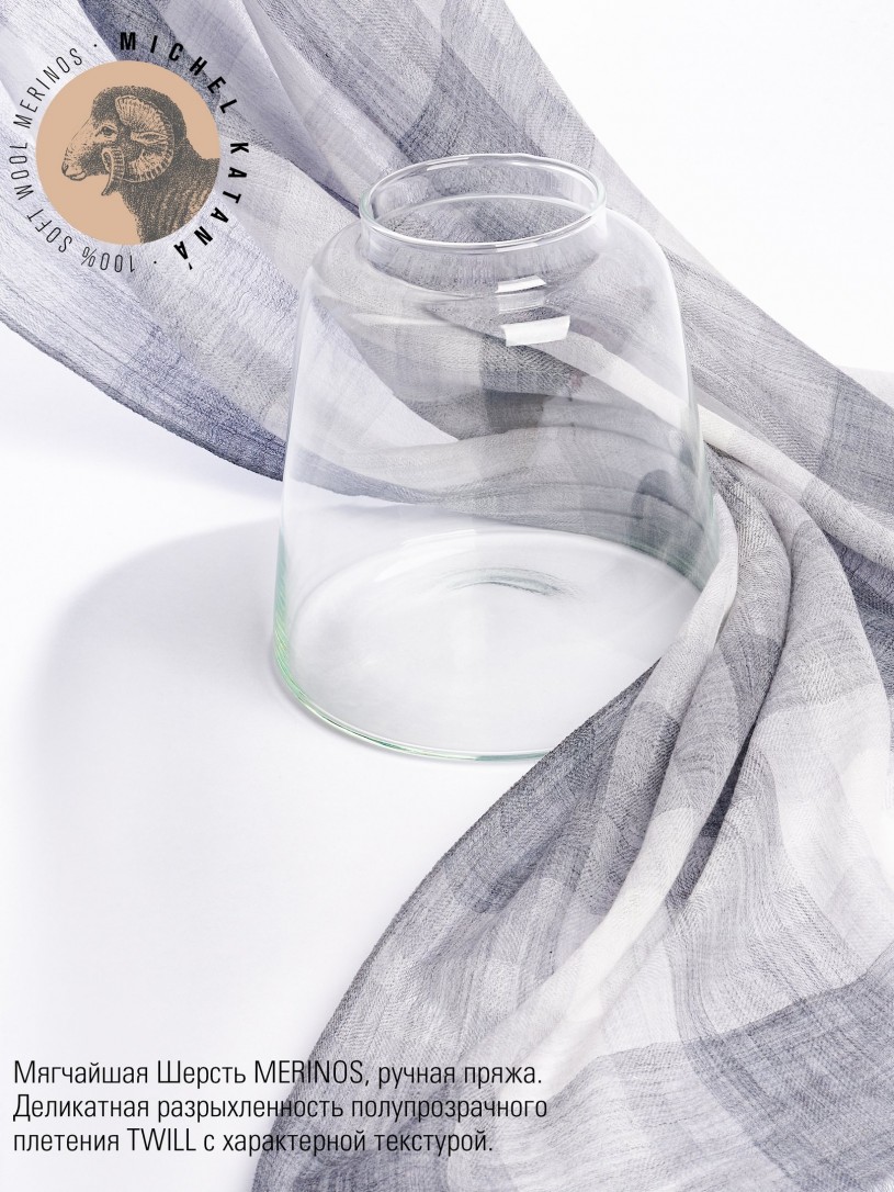 Мягчайшая Шерсть MERINOS, ручная пряжа. Деликатное и некая разрыхленность полупрозрачного плетения TWILL с характерной текстурой. Нежная в прикосновении к шее, гладкая, отлично держащая форму ткань. Вес изделия 70г (40 г/м2). Небросский, но в то же время четкий в деталь рисунок нанесенный техникой PLAIN SCRREN PRINTING (трафаретная печать на столе), и некоторые модели в цифровой печати, позволили получить невероятную по текстуре ткань-вуаль с еле заметной насыщенностью между лицевой и оборотной поверхностями - все это отличительные изысканные черты линеек палантинов от Michel Kataná