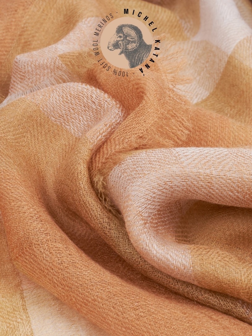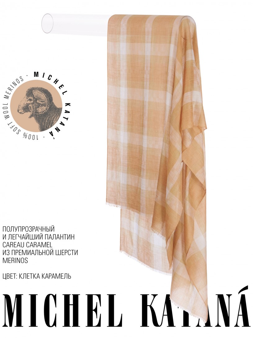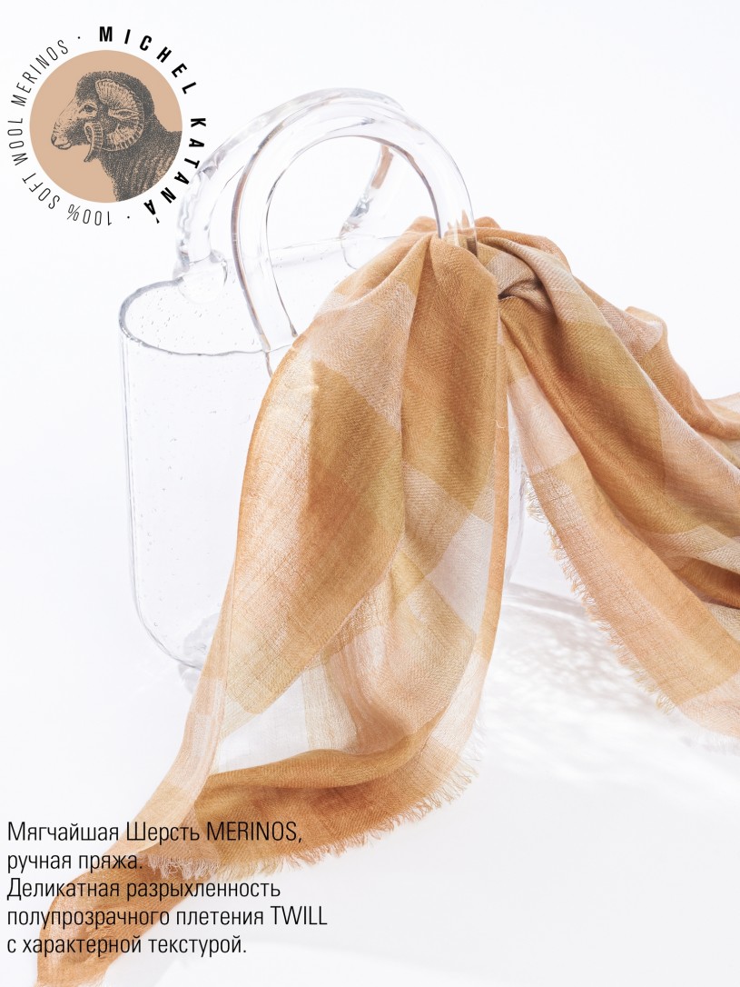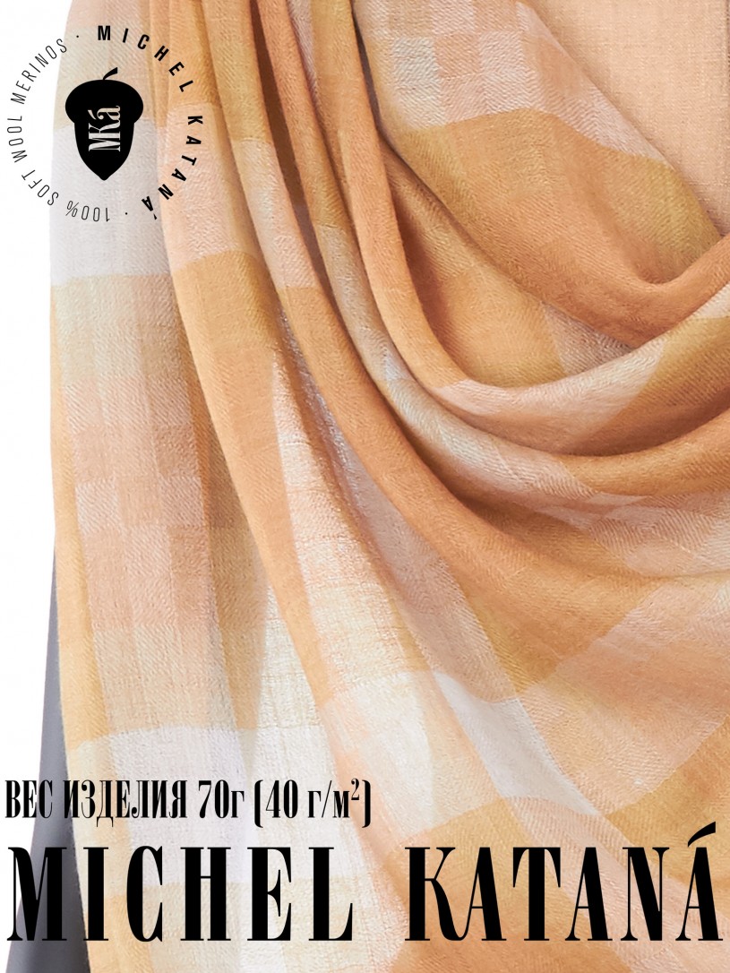 Мягчайшая Шерсть MERINOS, ручная пряжа. Деликатное и некая разрыхленность полупрозрачного плетения TWILL с характерной текстурой. Нежная в прикосновении к шее, гладкая, отлично держащая форму ткань. Вес изделия 70г (40 г/м2). Небросский, но в то же время четкий в деталь рисунок нанесенный техникой PLAIN SCRREN PRINTING (трафаретная печать на столе), и некоторые модели в цифровой печати, позволили получить невероятную по текстуре ткань-вуаль с еле заметной насыщенностью между лицевой и оборотной поверхностями - все это отличительные изысканные черты линеек палантинов от Michel Kataná