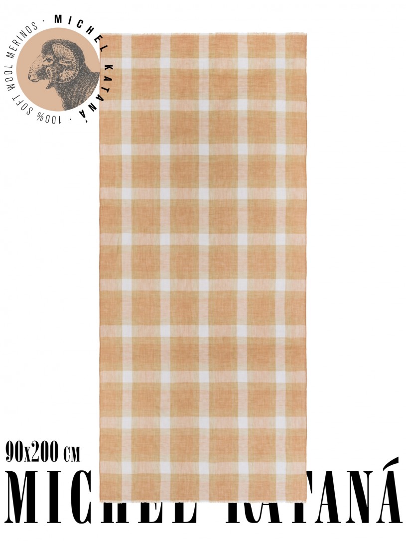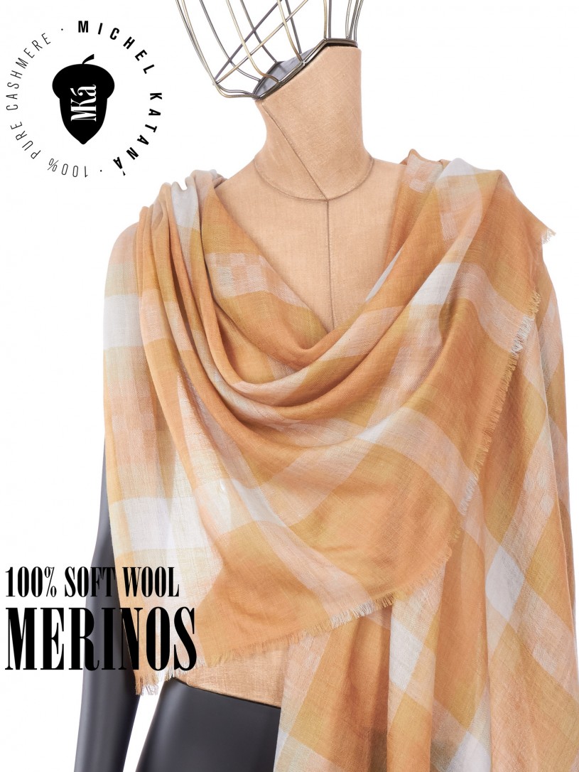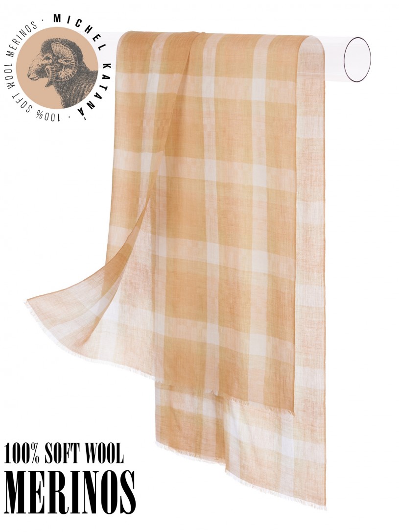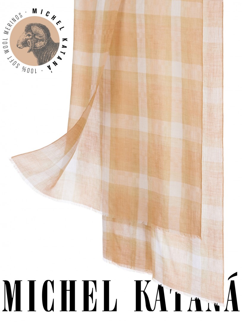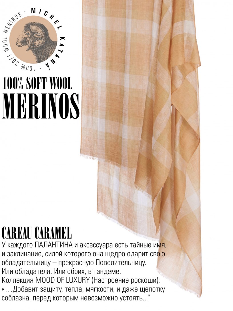 Мягчайшая Шерсть MERINOS, ручная пряжа. Деликатное и некая разрыхленность полупрозрачного плетения TWILL с характерной текстурой. Нежная в прикосновении к шее, гладкая, отлично держащая форму ткань. Вес изделия 70г (40 г/м2). Небросский, но в то же время четкий в деталь рисунок нанесенный техникой PLAIN SCRREN PRINTING (трафаретная печать на столе), и некоторые модели в цифровой печати, позволили получить невероятную по текстуре ткань-вуаль с еле заметной насыщенностью между лицевой и оборотной поверхностями - все это отличительные изысканные черты линеек палантинов от Michel Kataná