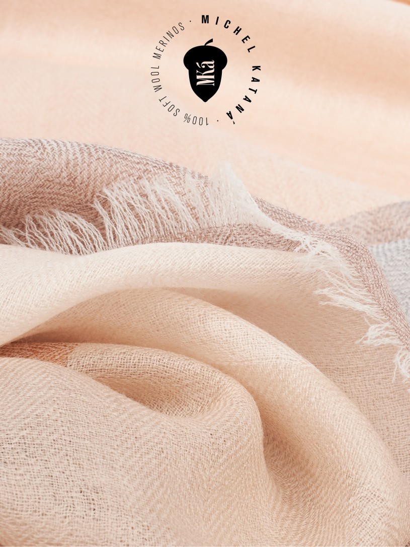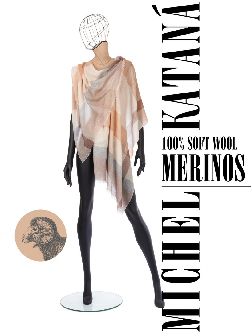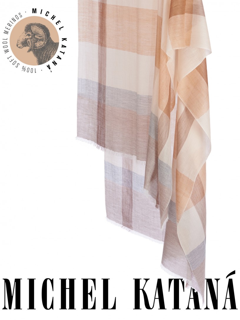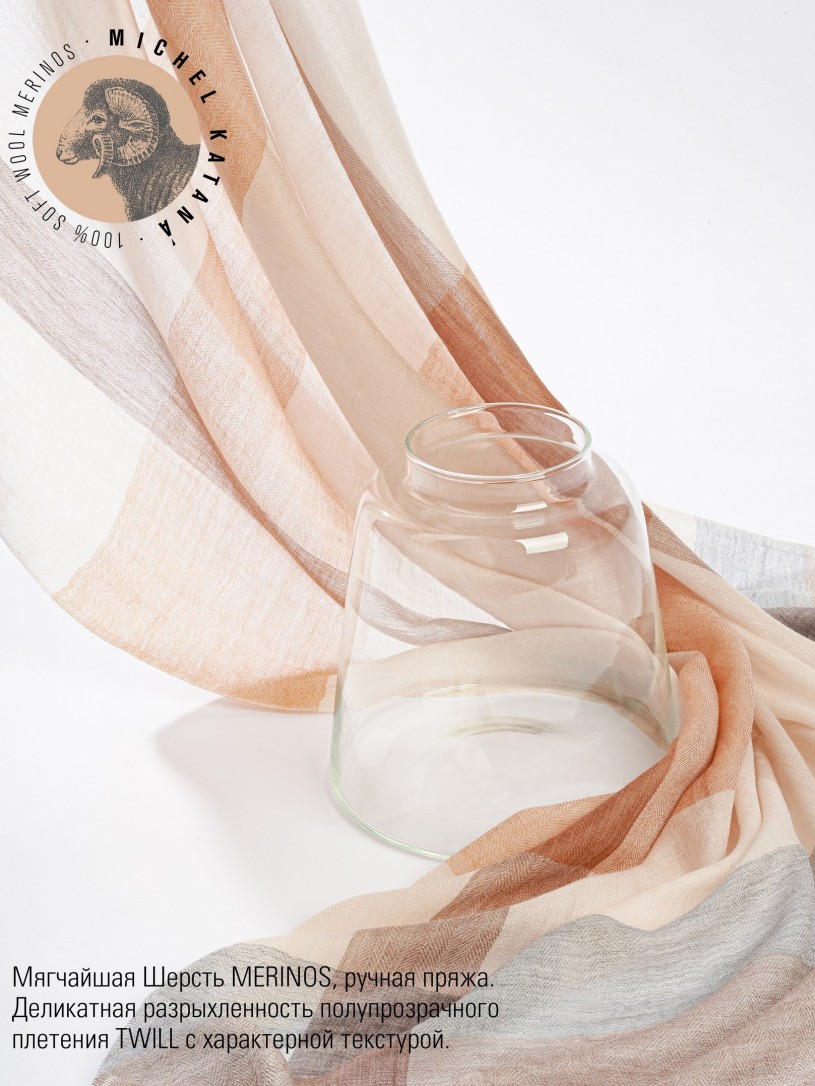 Мягчайшая Шерсть MERINOS, ручная пряжа. Деликатное и некая разрыхленность полупрозрачного плетения TWILL с характерной текстурой. Нежная в прикосновении к шее, гладкая, отлично держащая форму ткань. Вес изделия 70г (40 г/м2). Небросский, но в то же время четкий в деталь рисунок нанесенный техникой PLAIN SCRREN PRINTING (трафаретная печать на столе), и некоторые модели в цифровой печати, позволили получить невероятную по текстуре ткань-вуаль с еле заметной насыщенностью между лицевой и оборотной поверхностями - все это отличительные изысканные черты линеек палантинов от Michel Kataná