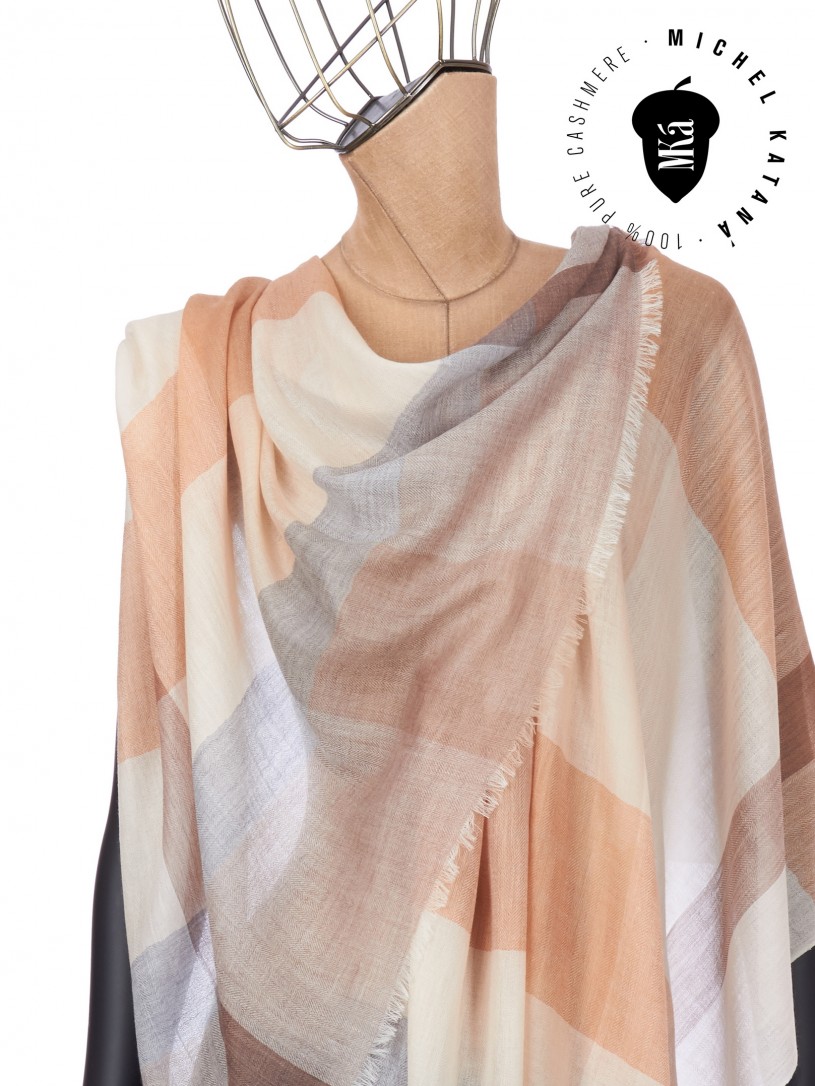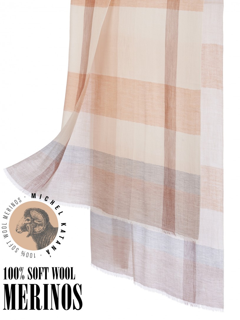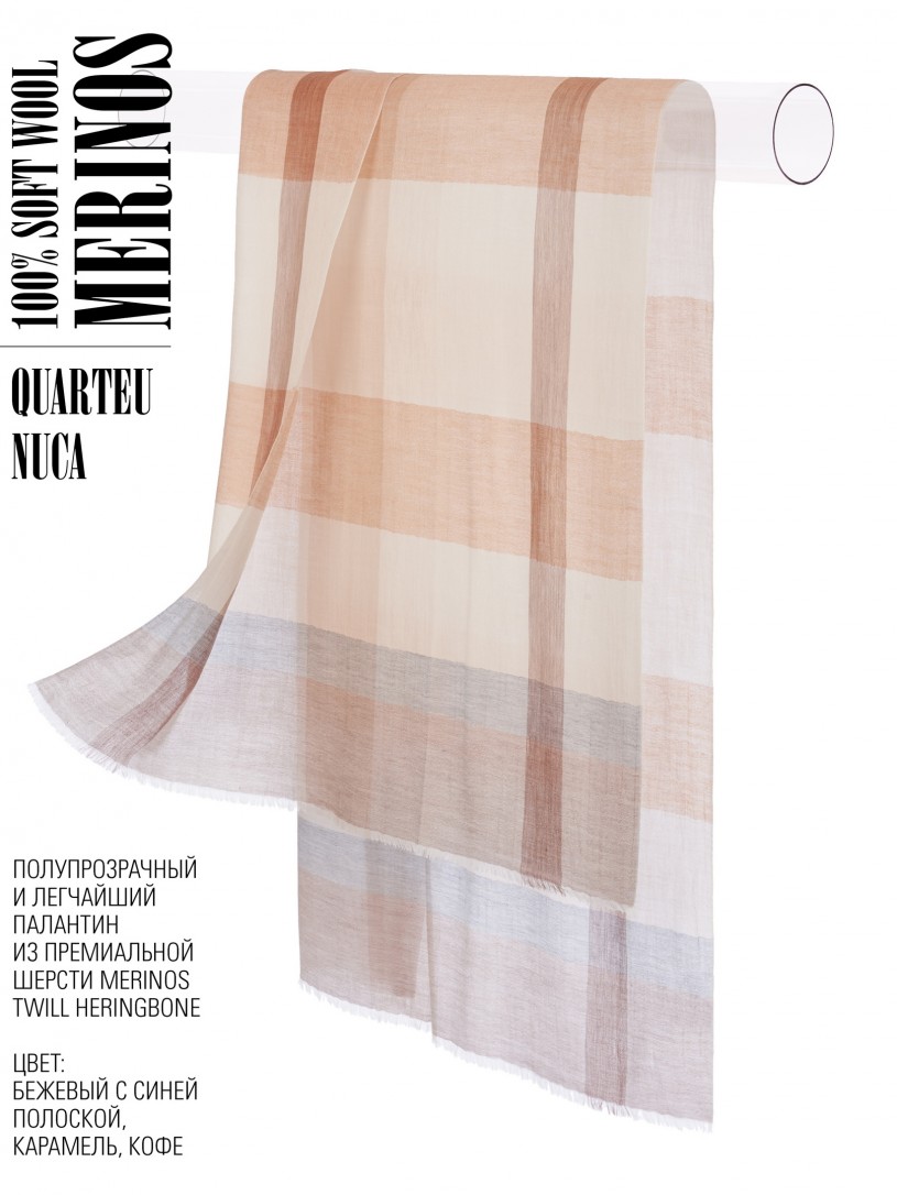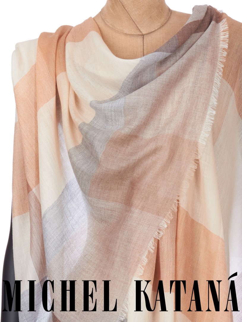 Мягчайшая Шерсть MERINOS, ручная пряжа. Деликатное и некая разрыхленность полупрозрачного плетения TWILL с характерной текстурой. Нежная в прикосновении к шее, гладкая, отлично держащая форму ткань. Вес изделия 70г (40 г/м2). Небросский, но в то же время четкий в деталь рисунок нанесенный техникой PLAIN SCRREN PRINTING (трафаретная печать на столе), и некоторые модели в цифровой печати, позволили получить невероятную по текстуре ткань-вуаль с еле заметной насыщенностью между лицевой и оборотной поверхностями - все это отличительные изысканные черты линеек палантинов от Michel Kataná