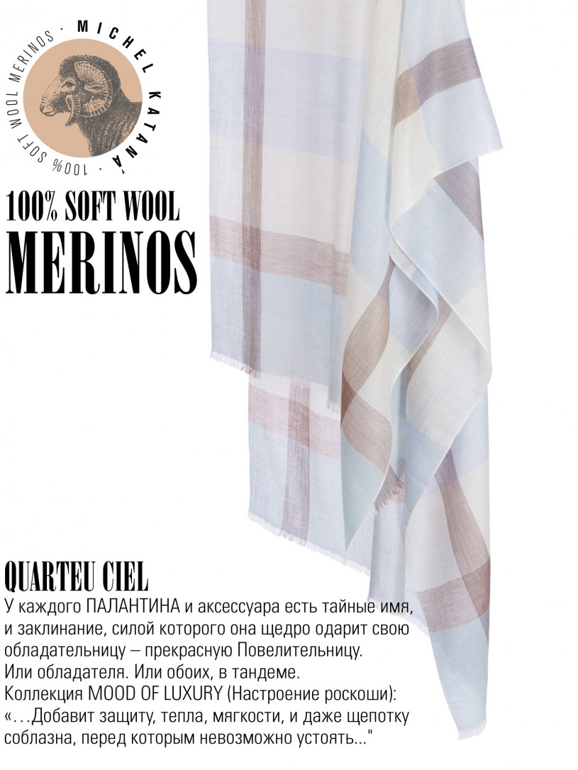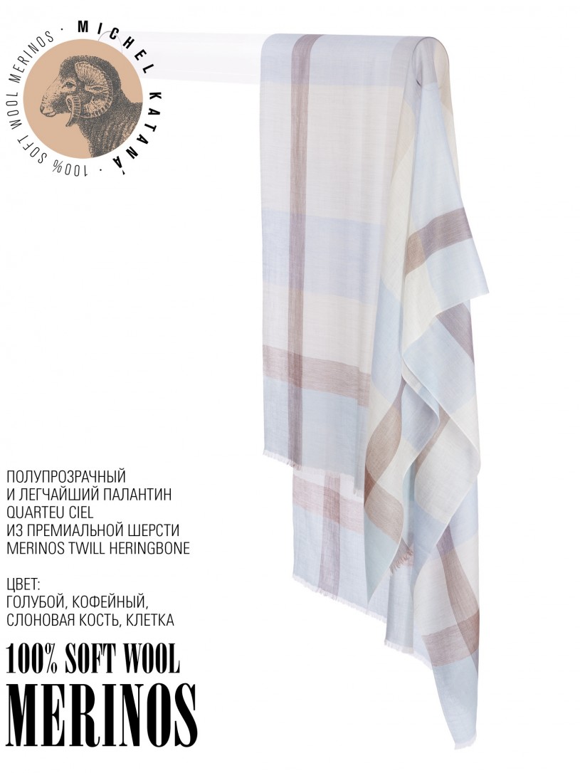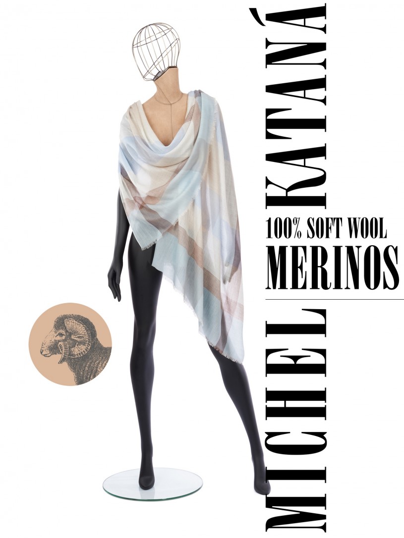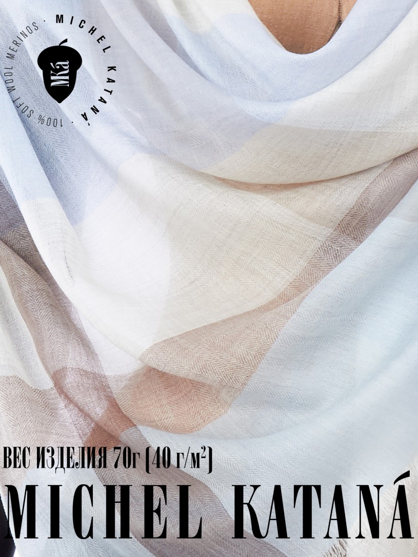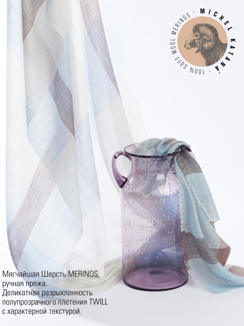 Мягчайшая Шерсть MERINOS, ручная пряжа. Деликатное и некая разрыхленность полупрозрачного плетения TWILL с характерной текстурой. Нежная в прикосновении к шее, гладкая, отлично держащая форму ткань. Вес изделия 70г (40 г/м2). Небросский, но в то же время четкий в деталь рисунок нанесенный техникой PLAIN SCRREN PRINTING (трафаретная печать на столе), и некоторые модели в цифровой печати, позволили получить невероятную по текстуре ткань-вуаль с еле заметной насыщенностью между лицевой и оборотной поверхностями - все это отличительные изысканные черты линеек палантинов от Michel Kataná