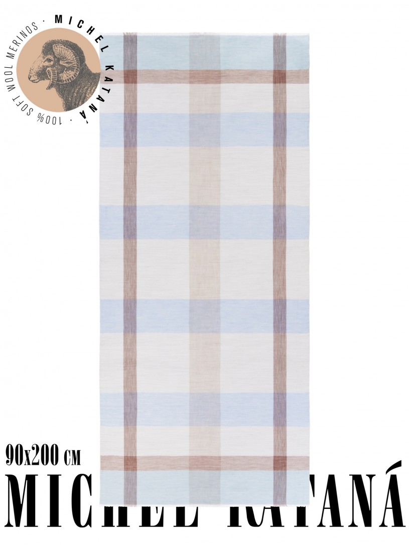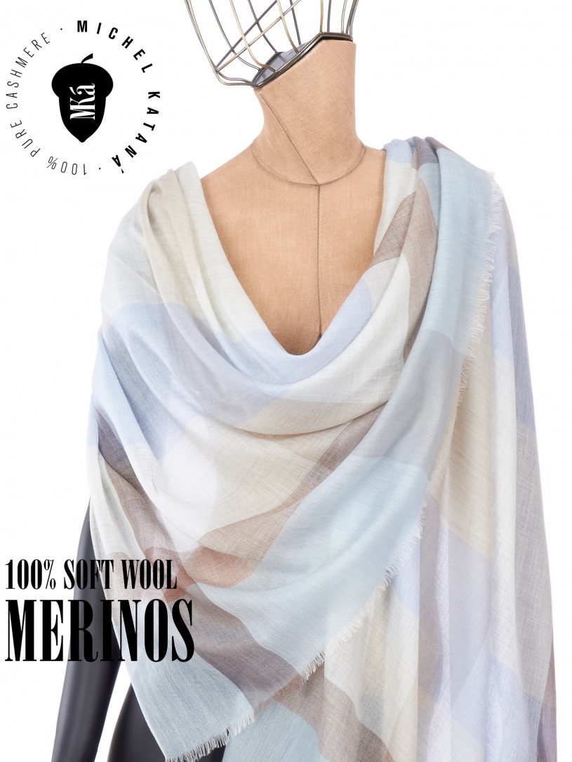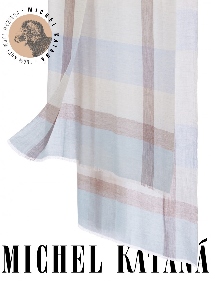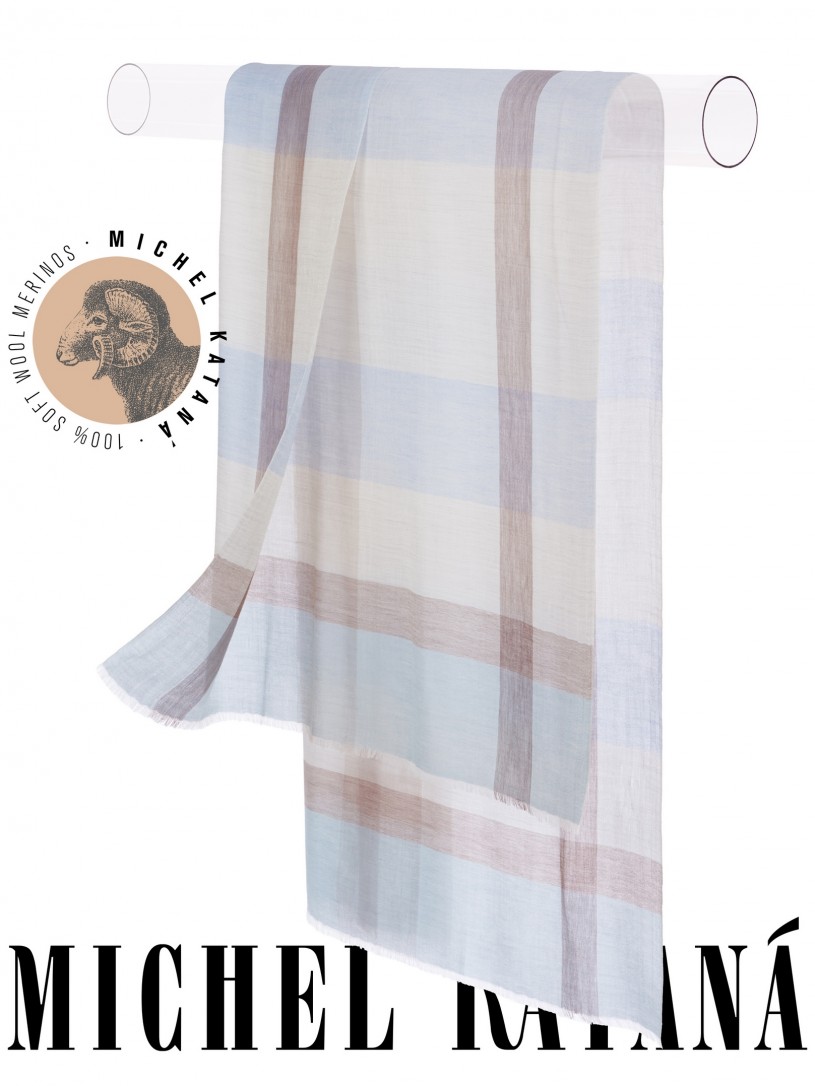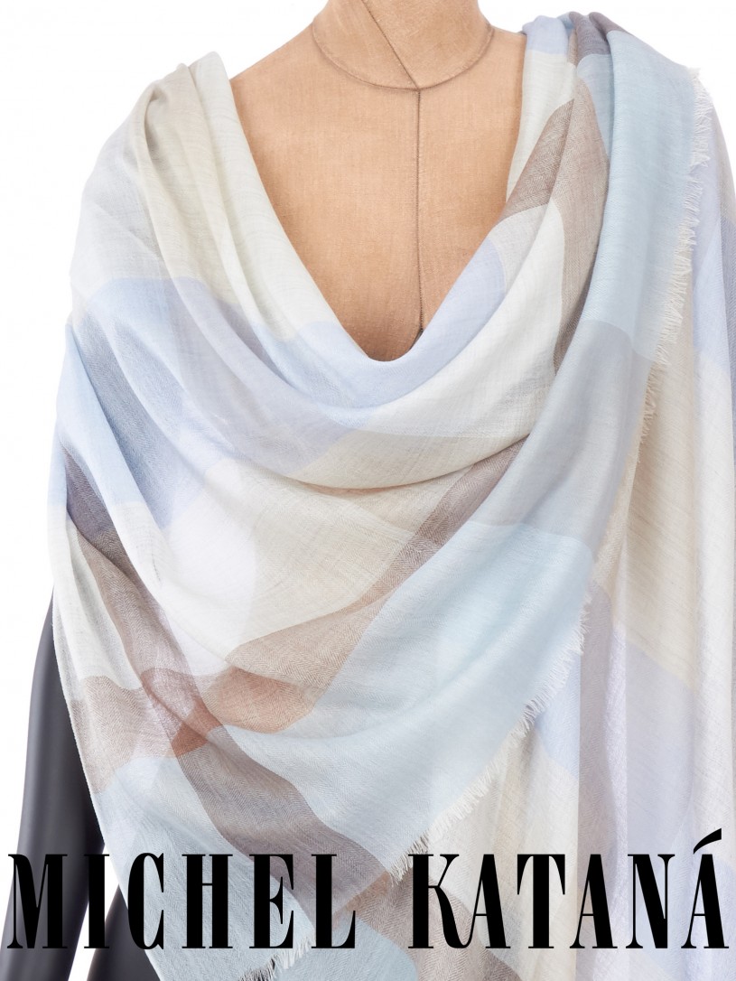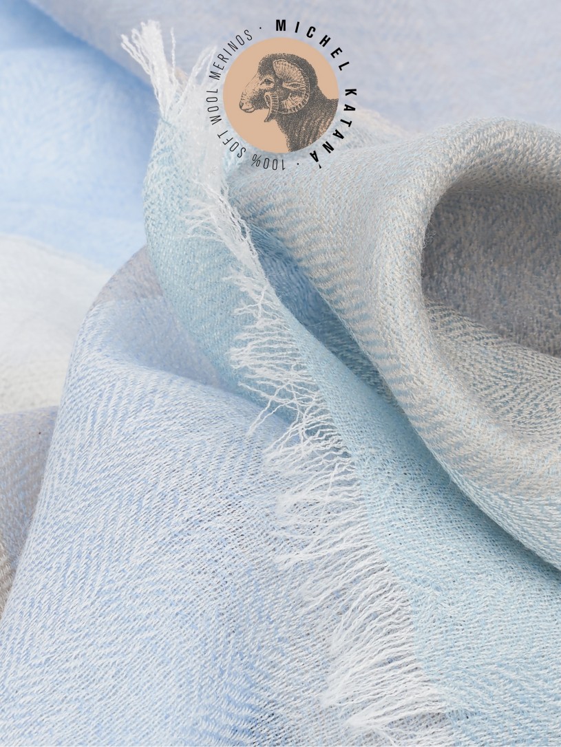 Мягчайшая Шерсть MERINOS, ручная пряжа. Деликатное и некая разрыхленность полупрозрачного плетения TWILL с характерной текстурой. Нежная в прикосновении к шее, гладкая, отлично держащая форму ткань. Вес изделия 70г (40 г/м2). Небросский, но в то же время четкий в деталь рисунок нанесенный техникой PLAIN SCRREN PRINTING (трафаретная печать на столе), и некоторые модели в цифровой печати, позволили получить невероятную по текстуре ткань-вуаль с еле заметной насыщенностью между лицевой и оборотной поверхностями - все это отличительные изысканные черты линеек палантинов от Michel Kataná