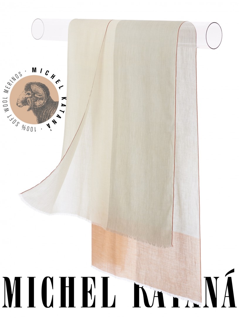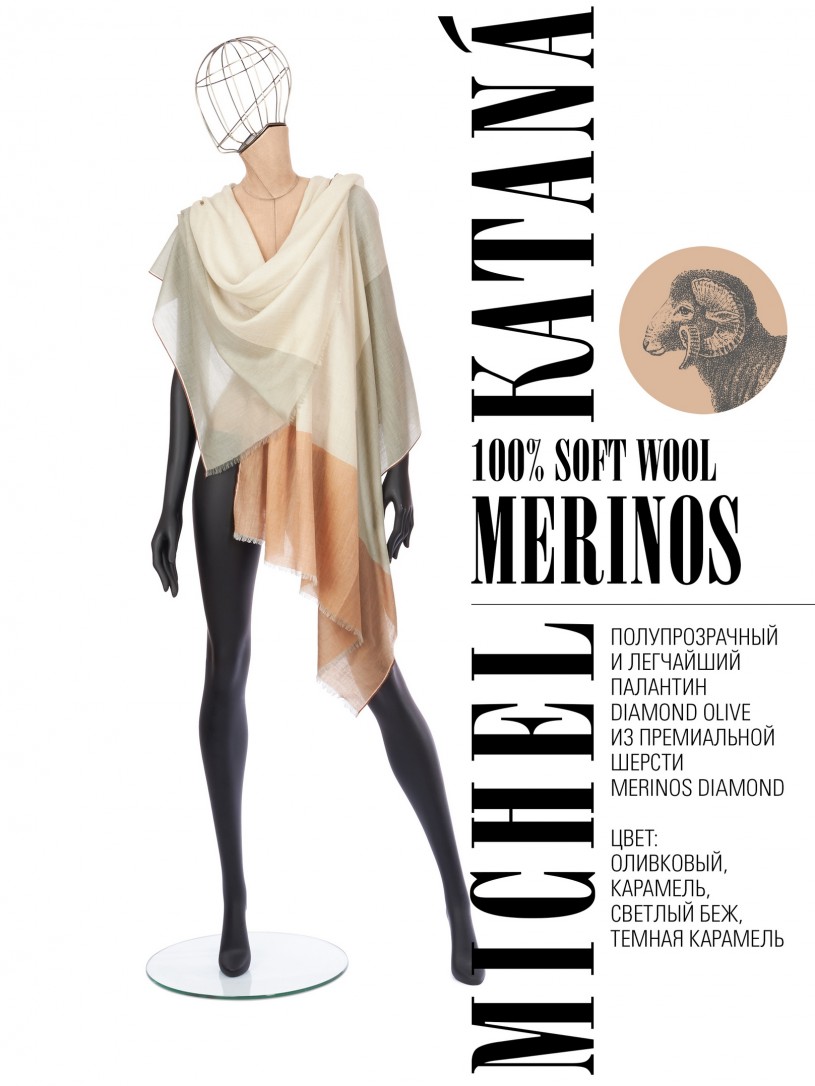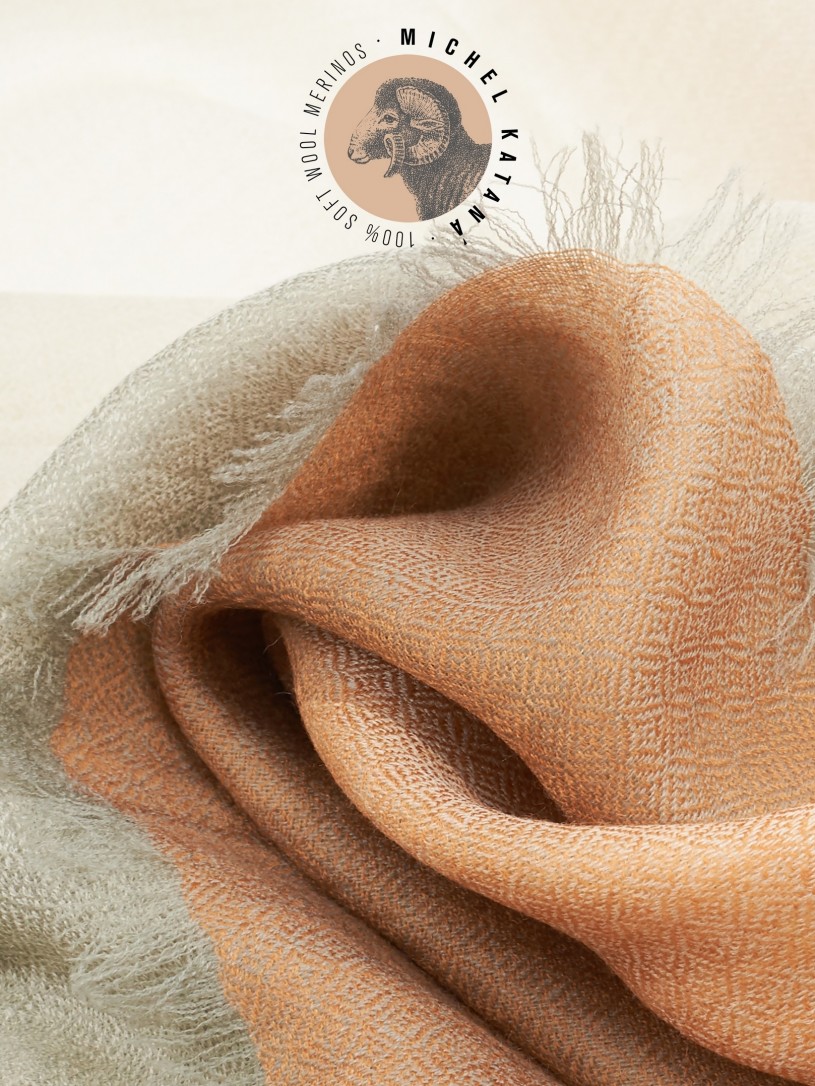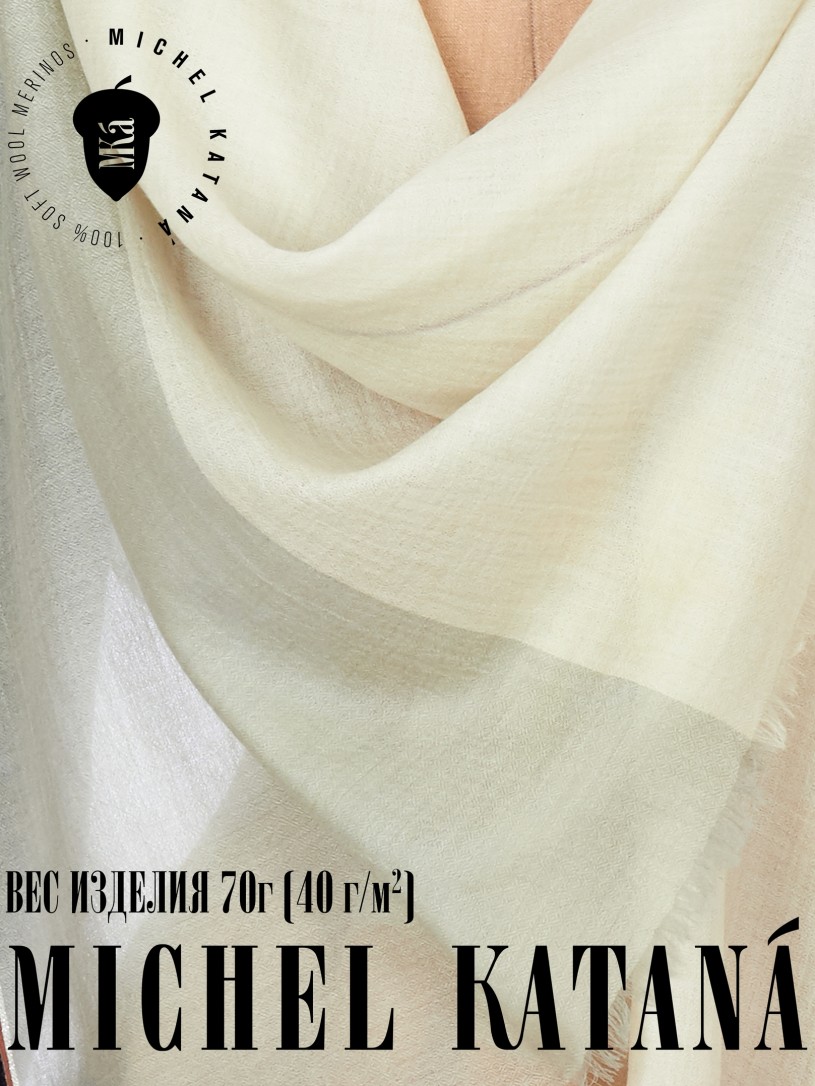 Мягчайшая Шерсть MERINOS, ручная пряжа. Деликатное и некая разрыхленность полупрозрачного плетения TWILL с характерной текстурой. Нежная в прикосновении к шее, гладкая, отлично держащая форму ткань. Вес изделия 70г (40 г/м2). Небросский, но в то же время четкий в деталь рисунок нанесенный техникой PLAIN SCRREN PRINTING (трафаретная печать на столе), и некоторые модели в цифровой печати, позволили получить невероятную по текстуре ткань-вуаль с еле заметной насыщенностью между лицевой и оборотной поверхностями - все это отличительные изысканные черты линеек палантинов от Michel Kataná