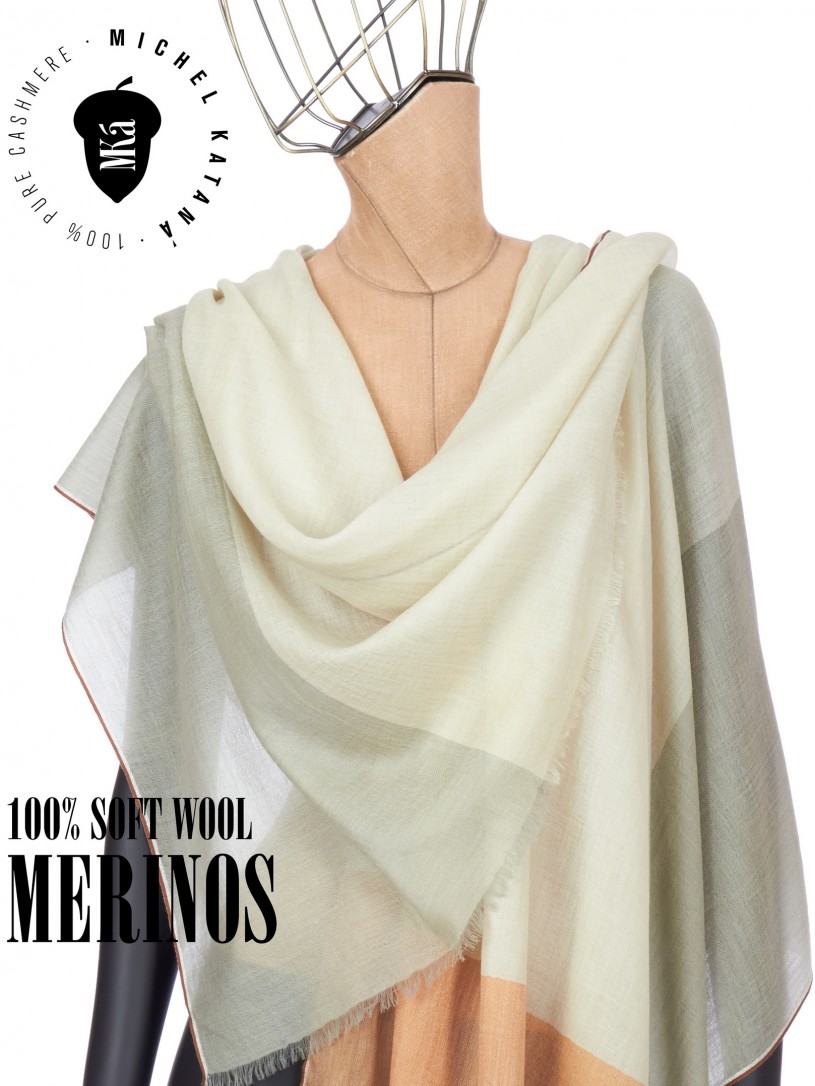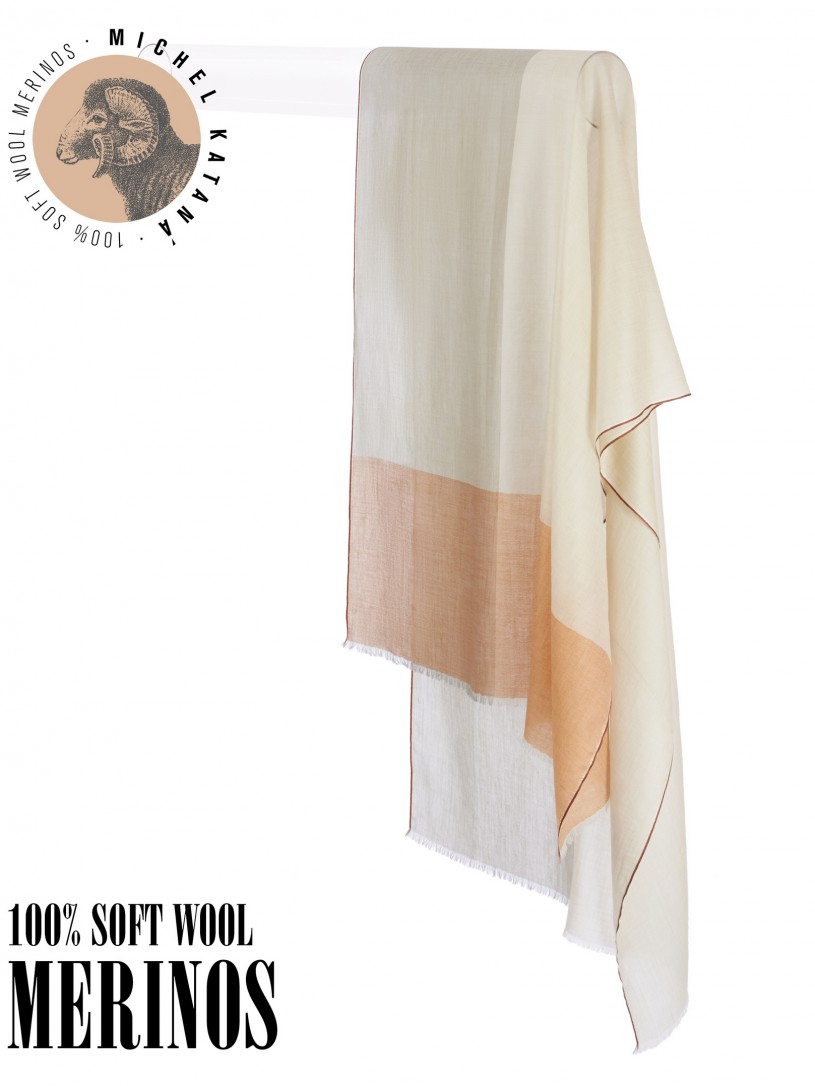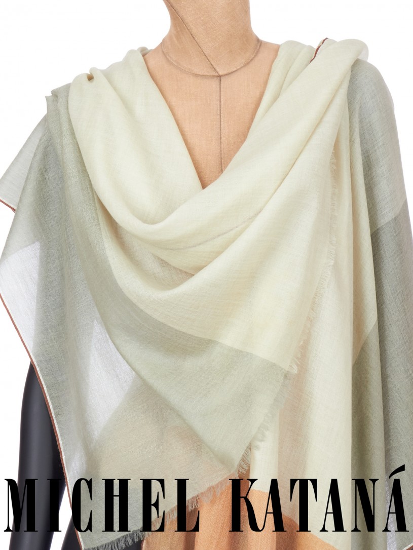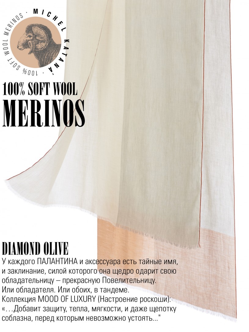Мягчайшая Шерсть MERINOS, ручная пряжа. Деликатное и некая разрыхленность полупрозрачного плетения TWILL с характерной текстурой. Нежная в прикосновении к шее, гладкая, отлично держащая форму ткань. Вес изделия 70г (40 г/м2). Небросский, но в то же время четкий в деталь рисунок нанесенный техникой PLAIN SCRREN PRINTING (трафаретная печать на столе), и некоторые модели в цифровой печати, позволили получить невероятную по текстуре ткань-вуаль с еле заметной насыщенностью между лицевой и оборотной поверхностями - все это отличительные изысканные черты линеек палантинов от Michel Kataná