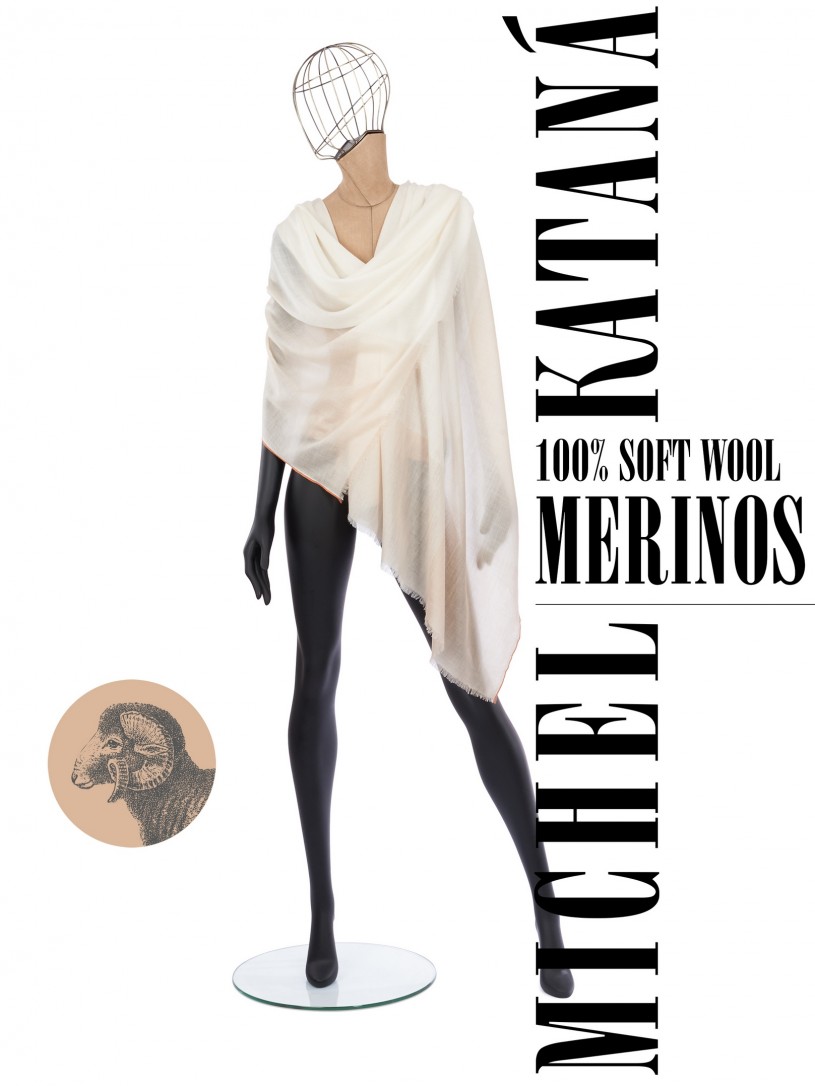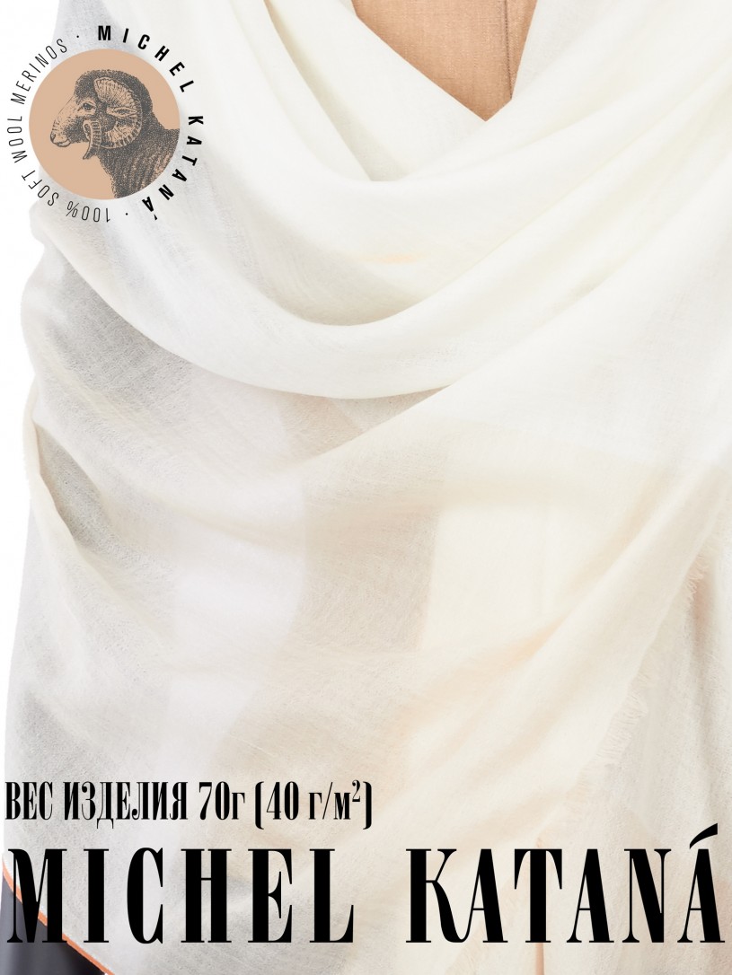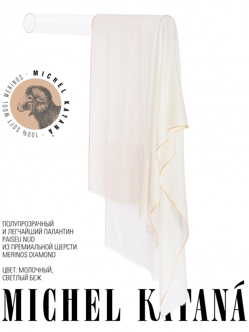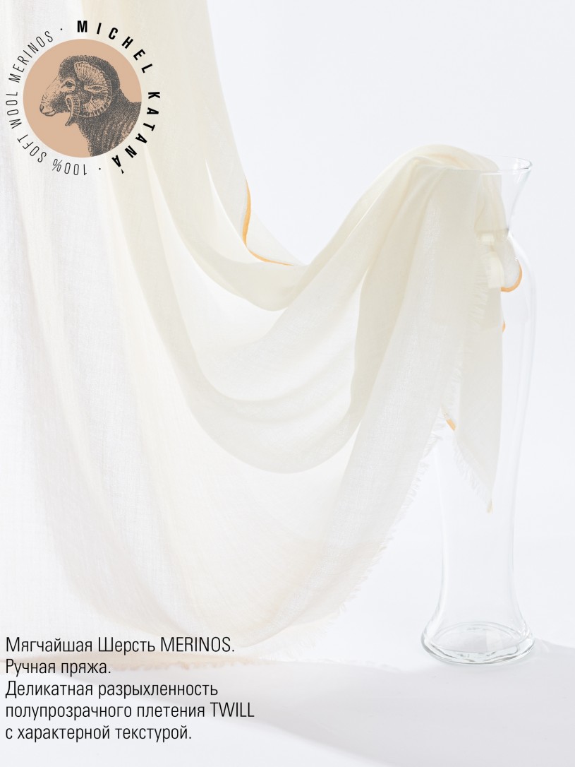 Мягчайшая Шерсть MERINOS, ручная пряжа. Деликатное и некая разрыхленность полупрозрачного плетения TWILL с характерной текстурой. Нежная в прикосновении к шее, гладкая, отлично держащая форму ткань. Вес изделия 70г (40 г/м2). Небросский, но в то же время четкий в деталь рисунок нанесенный техникой PLAIN SCRREN PRINTING (трафаретная печать на столе), и некоторые модели в цифровой печати, позволили получить невероятную по текстуре ткань-вуаль с еле заметной насыщенностью между лицевой и оборотной поверхностями - все это отличительные изысканные черты линеек палантинов от Michel Kataná