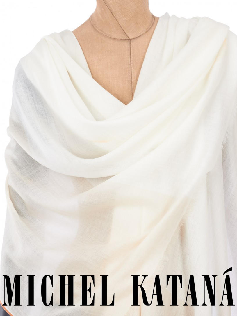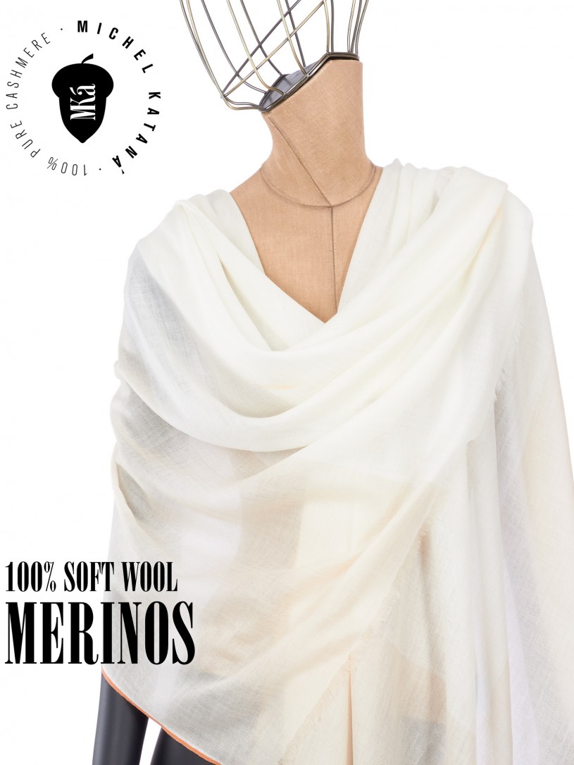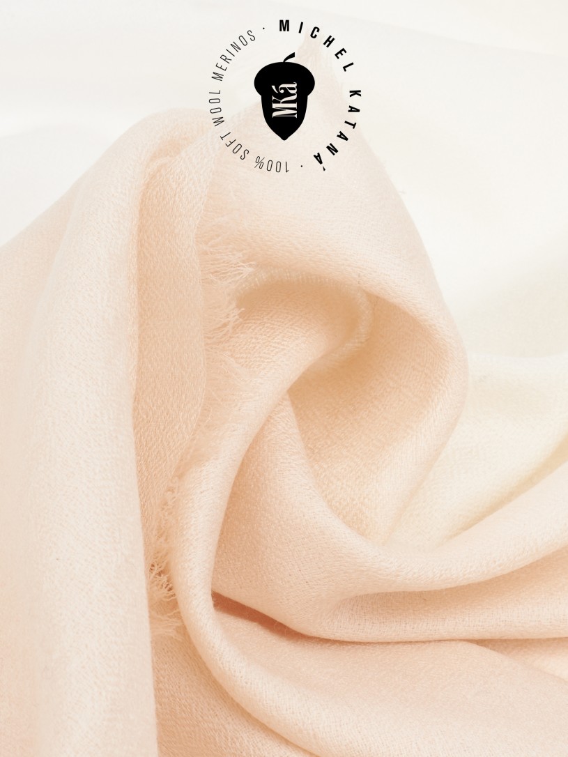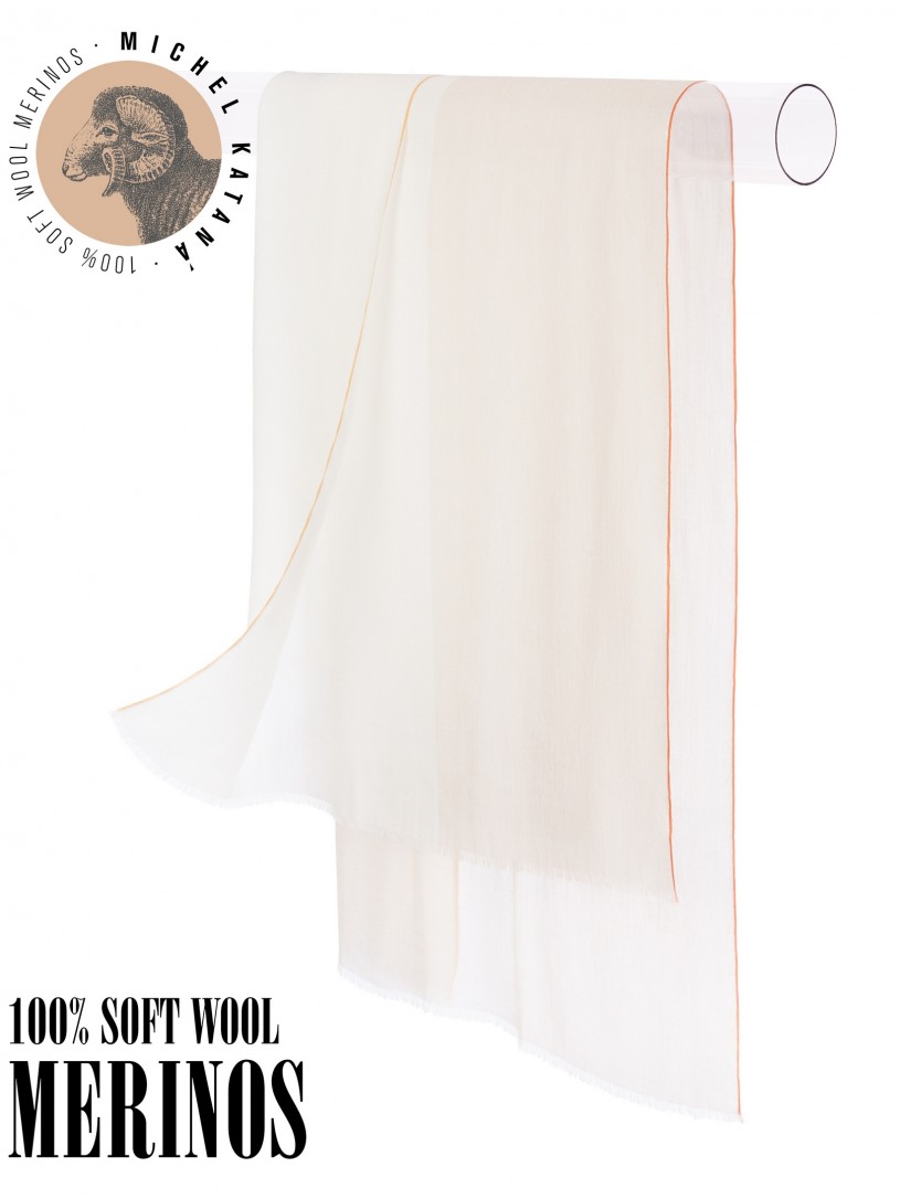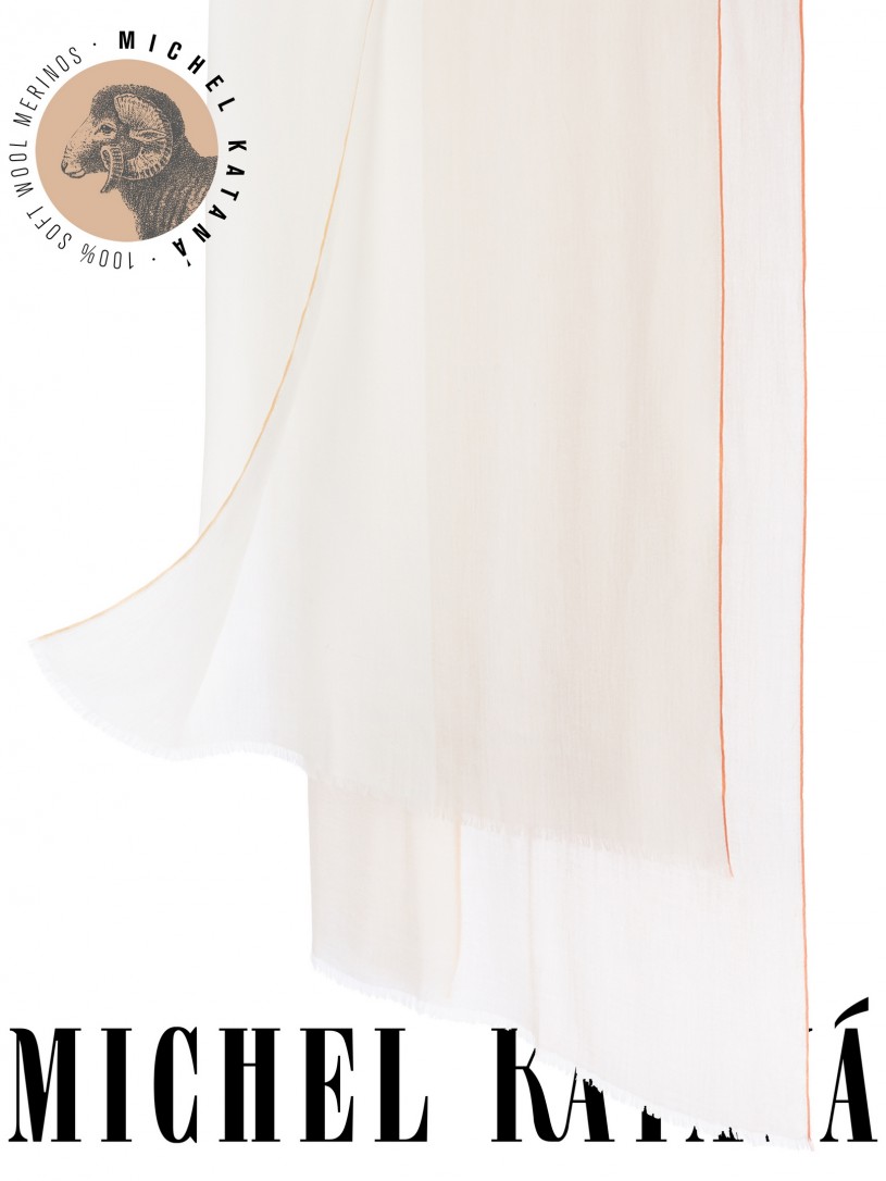 Мягчайшая Шерсть MERINOS, ручная пряжа. Деликатное и некая разрыхленность полупрозрачного плетения TWILL с характерной текстурой. Нежная в прикосновении к шее, гладкая, отлично держащая форму ткань. Вес изделия 70г (40 г/м2). Небросский, но в то же время четкий в деталь рисунок нанесенный техникой PLAIN SCRREN PRINTING (трафаретная печать на столе), и некоторые модели в цифровой печати, позволили получить невероятную по текстуре ткань-вуаль с еле заметной насыщенностью между лицевой и оборотной поверхностями - все это отличительные изысканные черты линеек палантинов от Michel Kataná