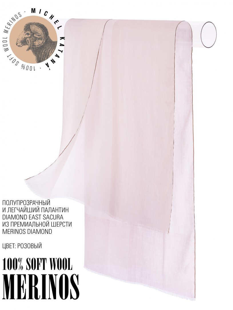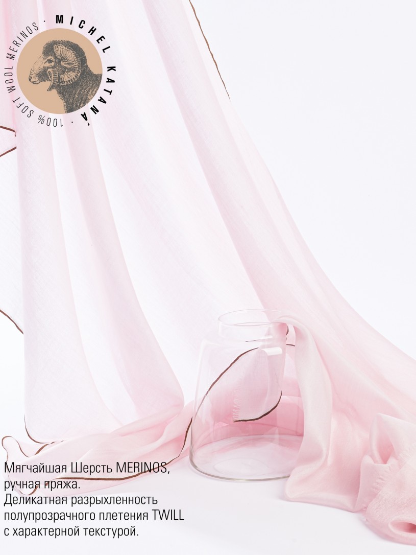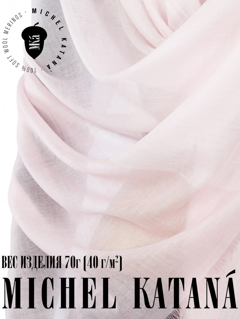 Мягчайшая Шерсть MERINOS, ручная пряжа. Деликатное и некая разрыхленность полупрозрачного плетения TWILL с характерной текстурой. Нежная в прикосновении к шее, гладкая, отлично держащая форму ткань. Вес изделия 70г (40 г/м2). Небросский, но в то же время четкий в деталь рисунок нанесенный техникой PLAIN SCRREN PRINTING (трафаретная печать на столе), и некоторые модели в цифровой печати, позволили получить невероятную по текстуре ткань-вуаль с еле заметной насыщенностью между лицевой и оборотной поверхностями - все это отличительные изысканные черты линеек палантинов от Michel Kataná