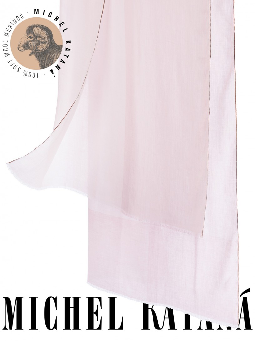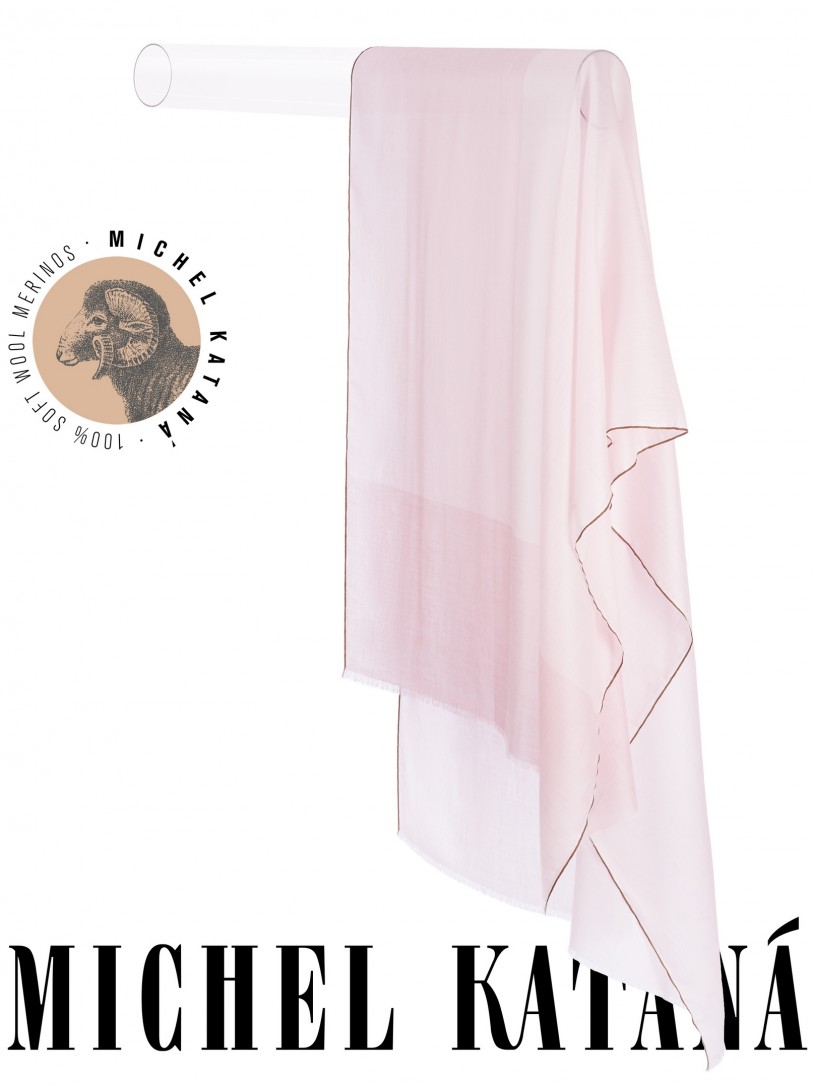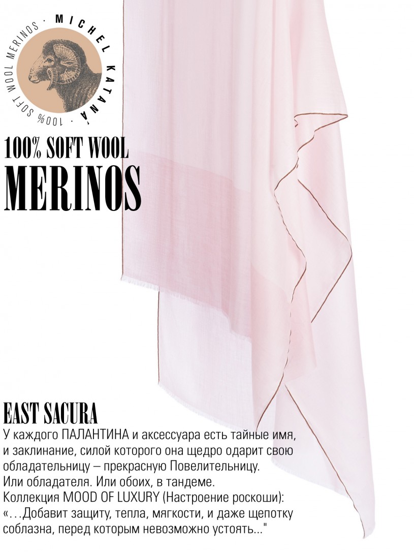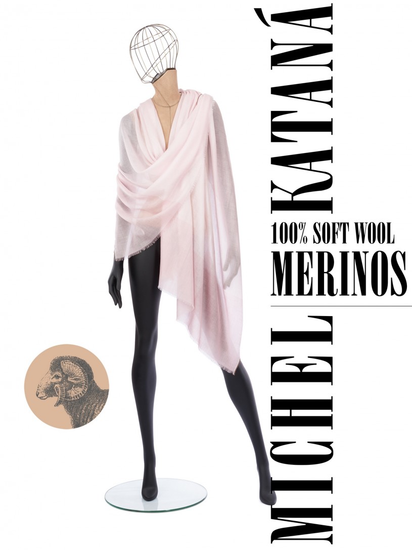 Мягчайшая Шерсть MERINOS, ручная пряжа. Деликатное и некая разрыхленность полупрозрачного плетения TWILL с характерной текстурой. Нежная в прикосновении к шее, гладкая, отлично держащая форму ткань. Вес изделия 70г (40 г/м2). Небросский, но в то же время четкий в деталь рисунок нанесенный техникой PLAIN SCRREN PRINTING (трафаретная печать на столе), и некоторые модели в цифровой печати, позволили получить невероятную по текстуре ткань-вуаль с еле заметной насыщенностью между лицевой и оборотной поверхностями - все это отличительные изысканные черты линеек палантинов от Michel Kataná