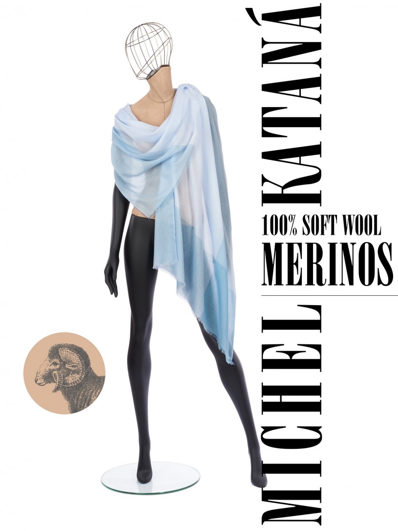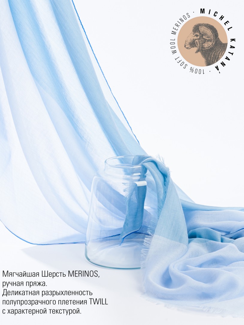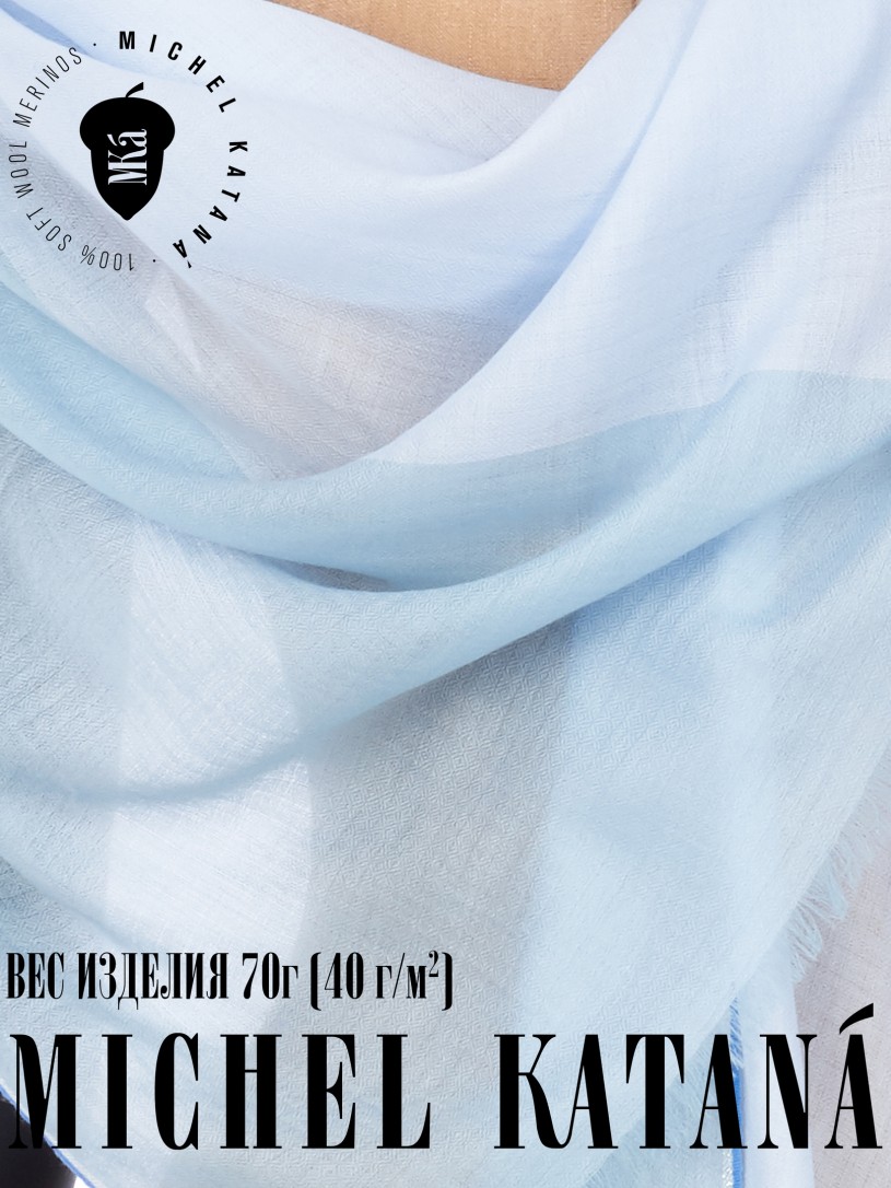 Мягчайшая Шерсть MERINOS, ручная пряжа. Деликатное и некая разрыхленность полупрозрачного плетения TWILL с характерной текстурой. Нежная в прикосновении к шее, гладкая, отлично держащая форму ткань. Вес изделия 70г (40 г/м2). Небросский, но в то же время четкий в деталь рисунок нанесенный техникой PLAIN SCRREN PRINTING (трафаретная печать на столе), и некоторые модели в цифровой печати, позволили получить невероятную по текстуре ткань-вуаль с еле заметной насыщенностью между лицевой и оборотной поверхностями - все это отличительные изысканные черты линеек палантинов от Michel Kataná