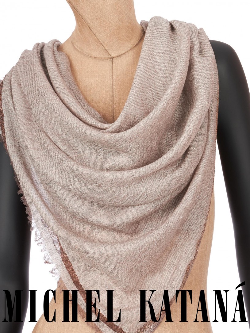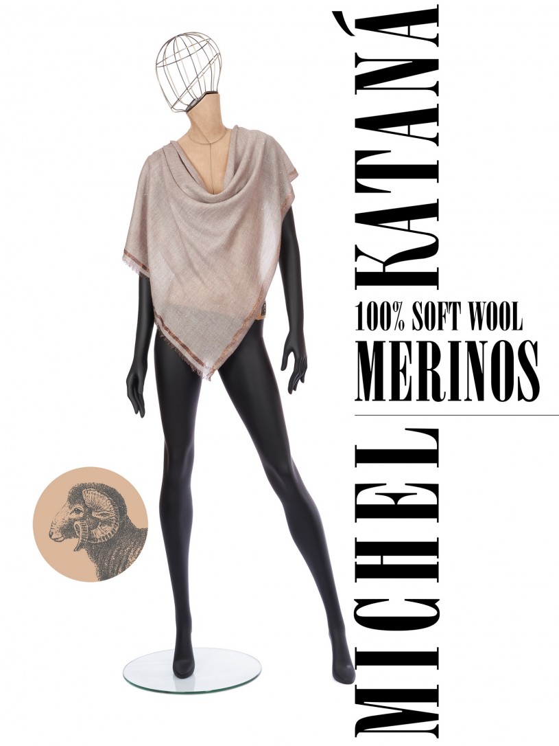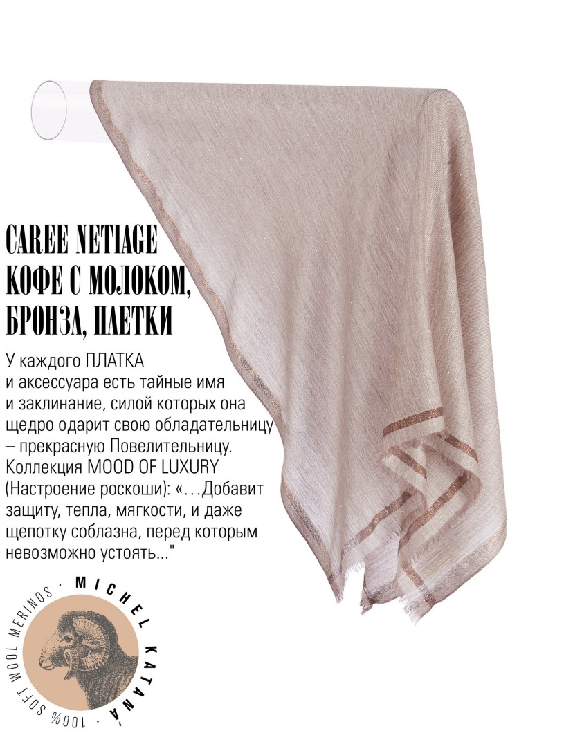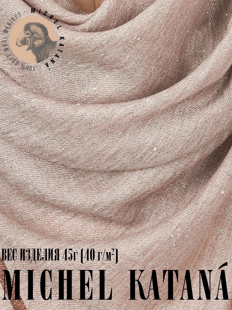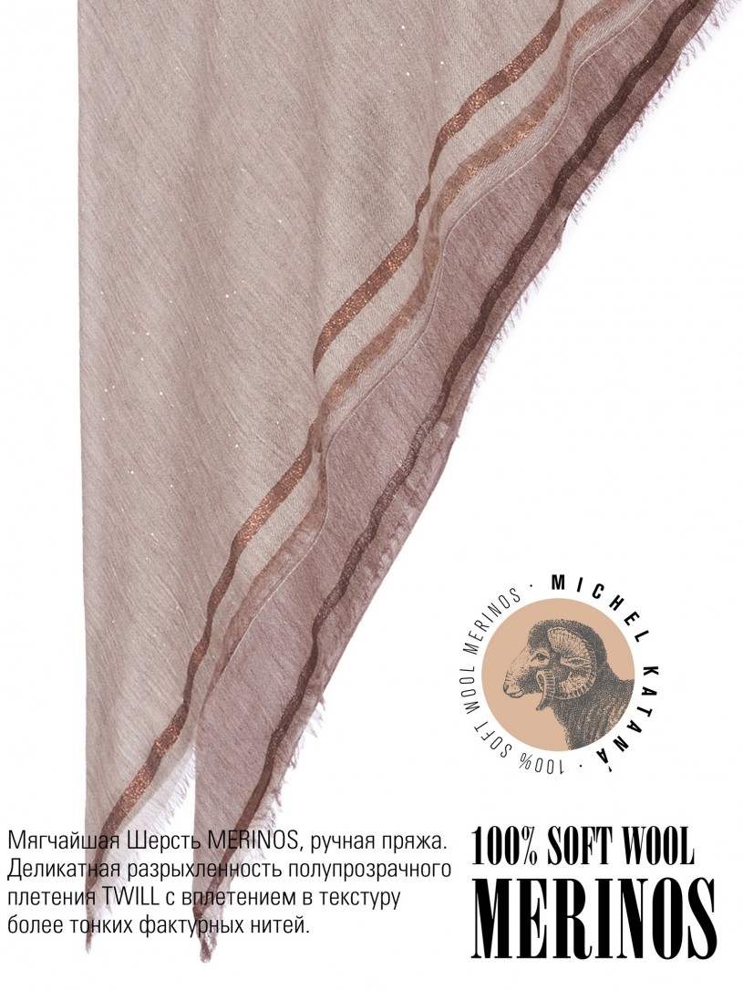 Мягчайшая Шерсть MERINOS, ручная пряжа. Деликатная и некая разрыхленность полупрозрачного плетения TWILL и с вплетенными в текстуру более тонких фактурных нитей. Нежная в прикосновении к шее, гладкая, отлично держащая форму ткань. Вес изделия 45г (40 г/м2). Небросский, но в то же время четкий в деталь рисунок нанесенный техникой PLAIN SCRREN PRINTING (трафаретная печать на столе), и некоторые модели в цифровой печати, позволили получить невероятную по текстуре ткань-вуаль с еле заметной насыщенностью между лицевой и оборотной поверхностями - все это отличительные изысканные черты линеек палантинов от Michel Kataná