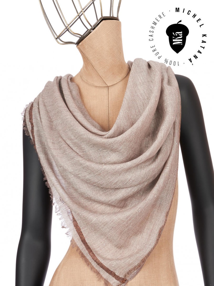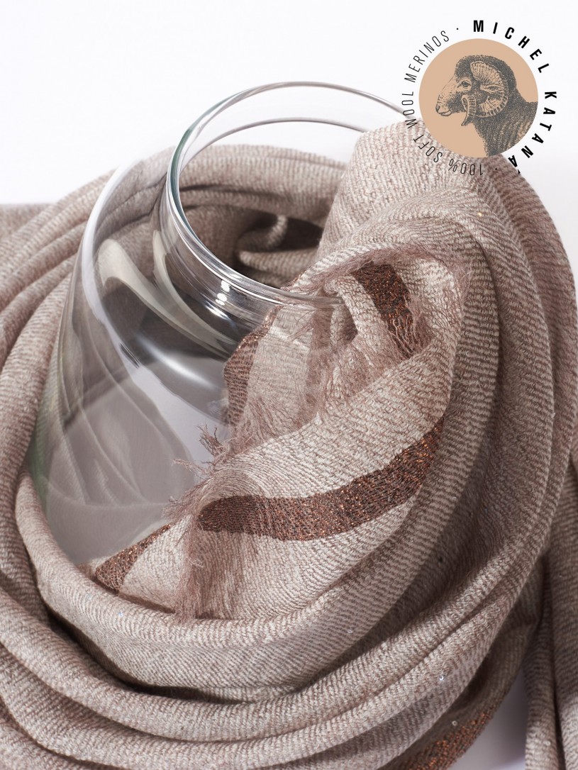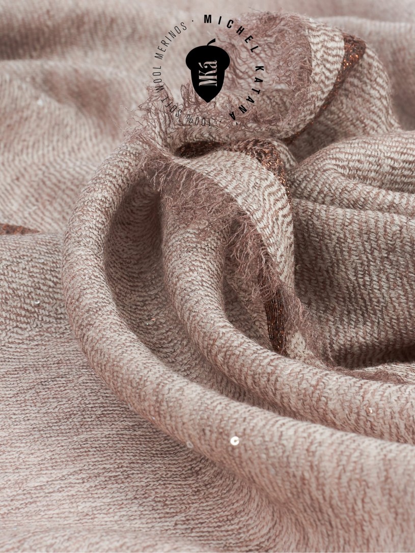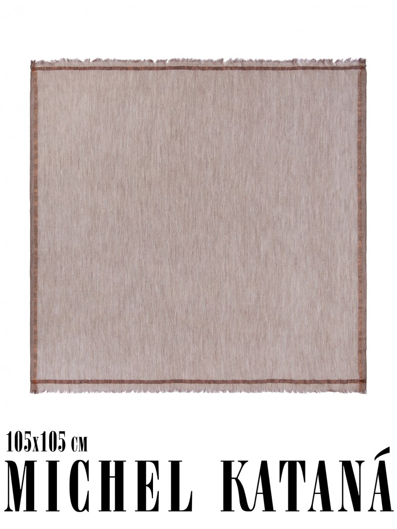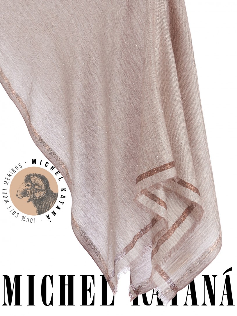 Мягчайшая Шерсть MERINOS, ручная пряжа. Деликатная и некая разрыхленность полупрозрачного плетения TWILL и с вплетенными в текстуру более тонких фактурных нитей. Нежная в прикосновении к шее, гладкая, отлично держащая форму ткань. Вес изделия 45г (40 г/м2). Небросский, но в то же время четкий в деталь рисунок нанесенный техникой PLAIN SCRREN PRINTING (трафаретная печать на столе), и некоторые модели в цифровой печати, позволили получить невероятную по текстуре ткань-вуаль с еле заметной насыщенностью между лицевой и оборотной поверхностями - все это отличительные изысканные черты линеек палантинов от Michel Kataná