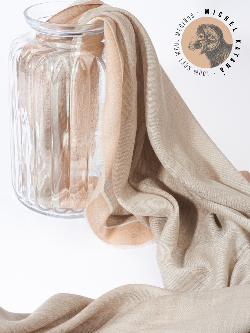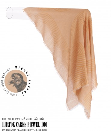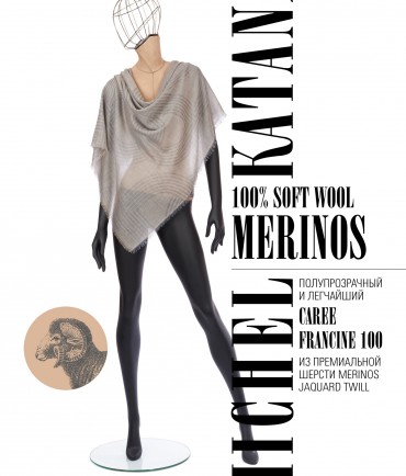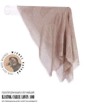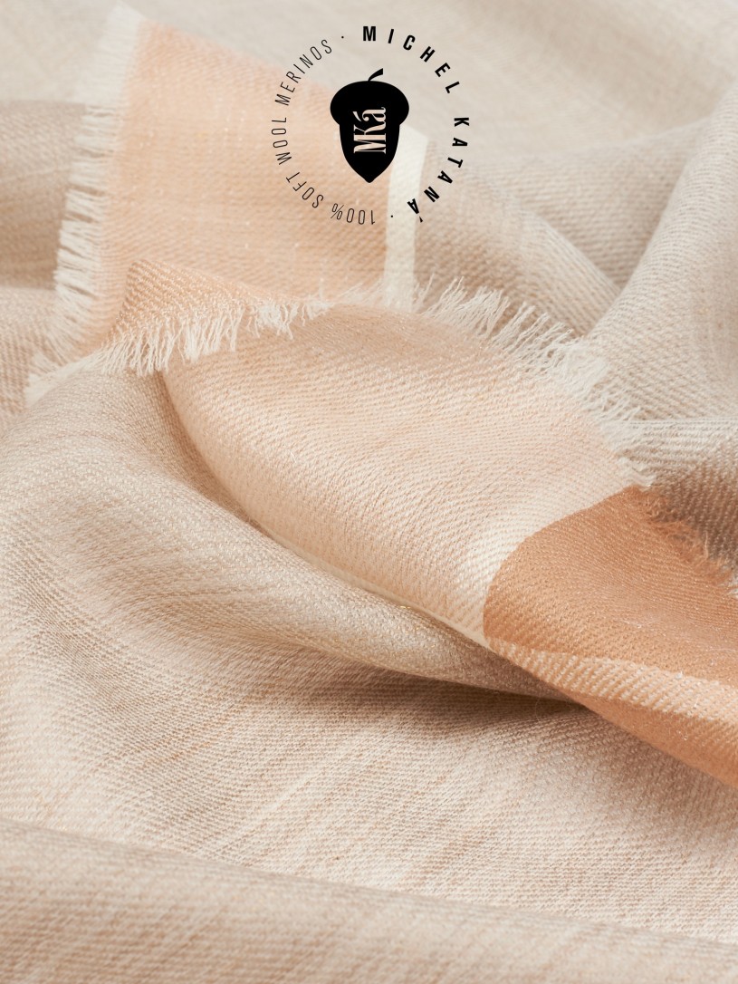 Мягчайшая Шерсть MERINOS, ручная пряжа. Деликатное плетенье TWILL с характерной текстурой рисунка. Нежная в прикосновении к шее, гладкая, отлично держащая форму ткань. Вес изделия 55г (70 г/м2). Небросский, но в то же время четкий в деталь рисунок нанесенный техникой PLAIN SCRREN PRINTING (трафаретная печать на столе), и некоторые модели в цифровой печати, позволили получить невероятную по текстуре ткань-вуаль с еле заметной насыщенностью между лицевой и оборотной поверхностями - все это отличительные изысканные черты линеек палантинов от Michel Kataná
