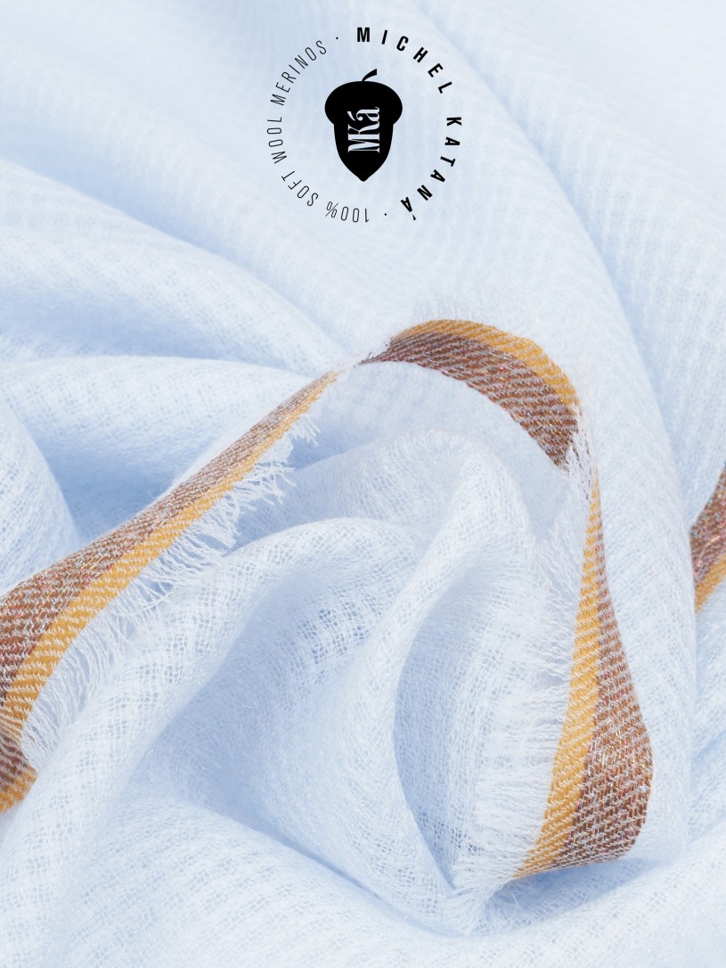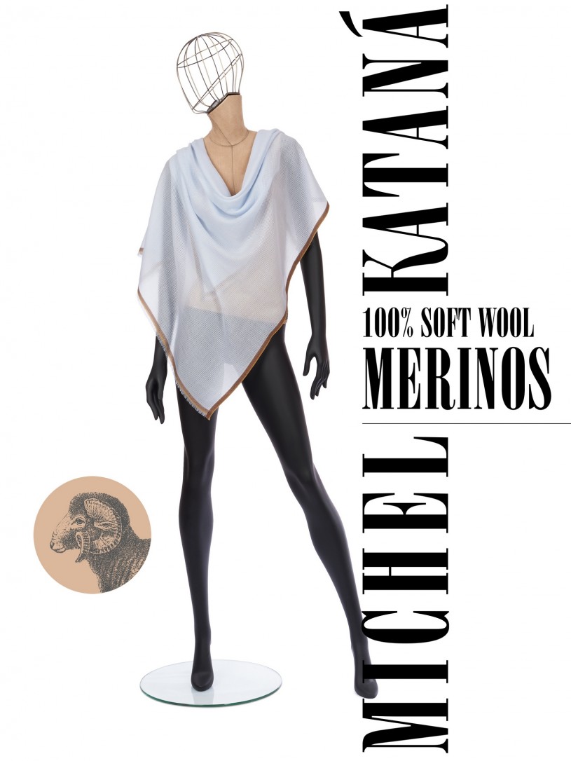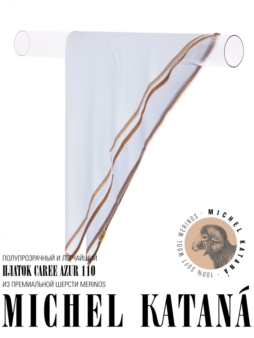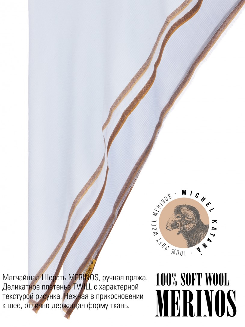 Мягчайшая Шерсть MERINOS, ручная пряжа. Деликатное плетенье TWILL с характерной текстурой рисунка. Нежная в прикосновении к шее, гладкая, отлично держащая форму ткань. Вес изделия 55г (70 г/м2). Небросский, но в то же время четкий в деталь рисунок нанесенный техникой PLAIN SCRREN PRINTING (трафаретная печать на столе), и некоторые модели в цифровой печати, позволили получить невероятную по текстуре ткань-вуаль с еле заметной насыщенностью между лицевой и оборотной поверхностями - все это отличительные изысканные черты линеек палантинов от Michel Kataná