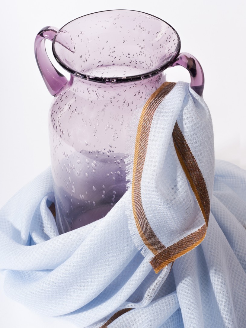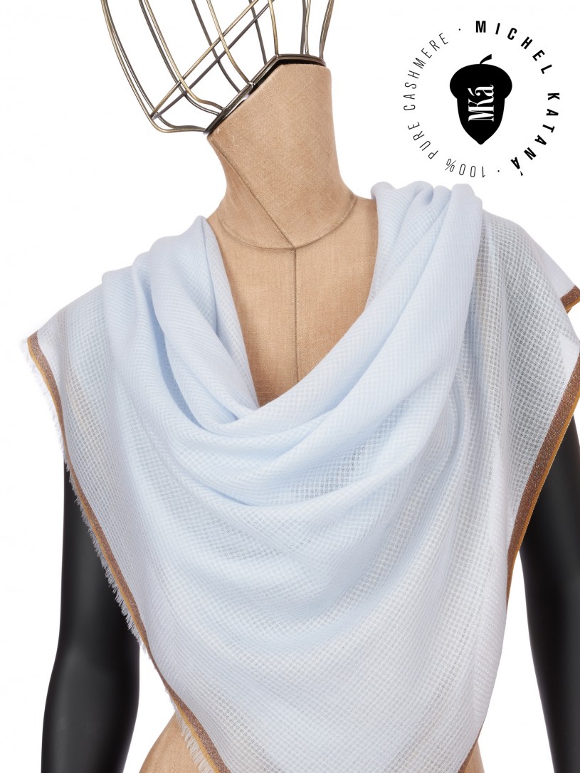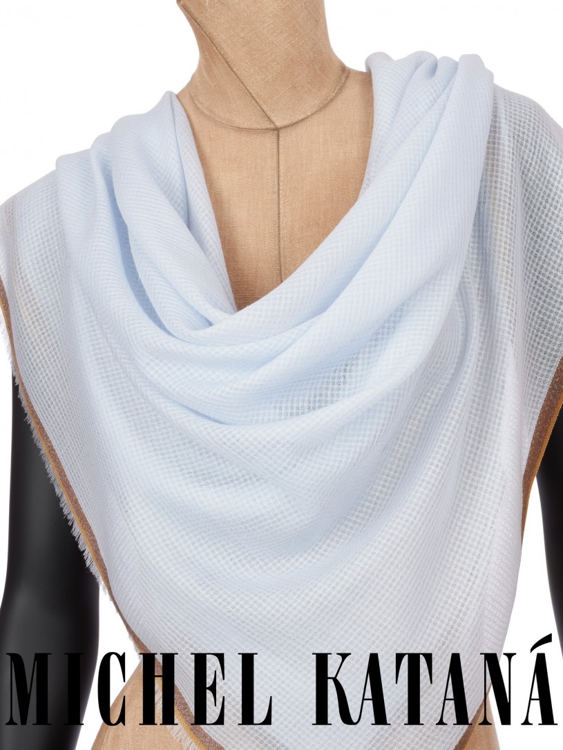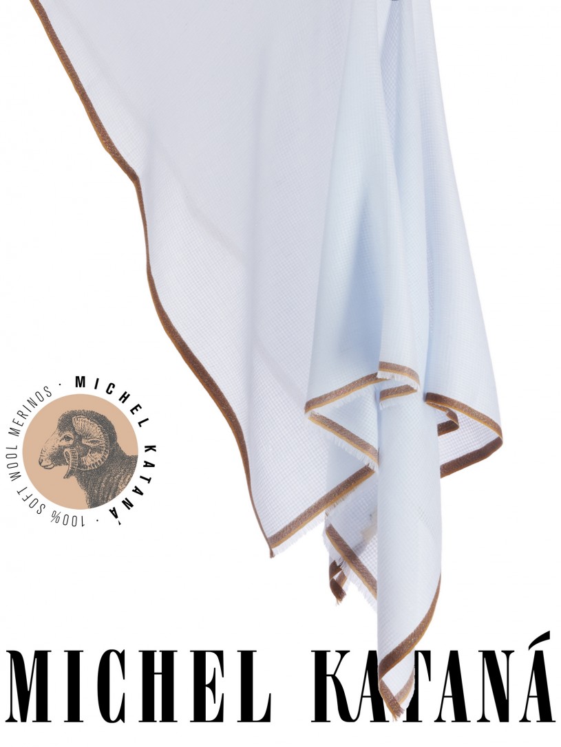 Мягчайшая Шерсть MERINOS, ручная пряжа. Деликатное плетенье TWILL с характерной текстурой рисунка. Нежная в прикосновении к шее, гладкая, отлично держащая форму ткань. Вес изделия 55г (70 г/м2). Небросский, но в то же время четкий в деталь рисунок нанесенный техникой PLAIN SCRREN PRINTING (трафаретная печать на столе), и некоторые модели в цифровой печати, позволили получить невероятную по текстуре ткань-вуаль с еле заметной насыщенностью между лицевой и оборотной поверхностями - все это отличительные изысканные черты линеек палантинов от Michel Kataná