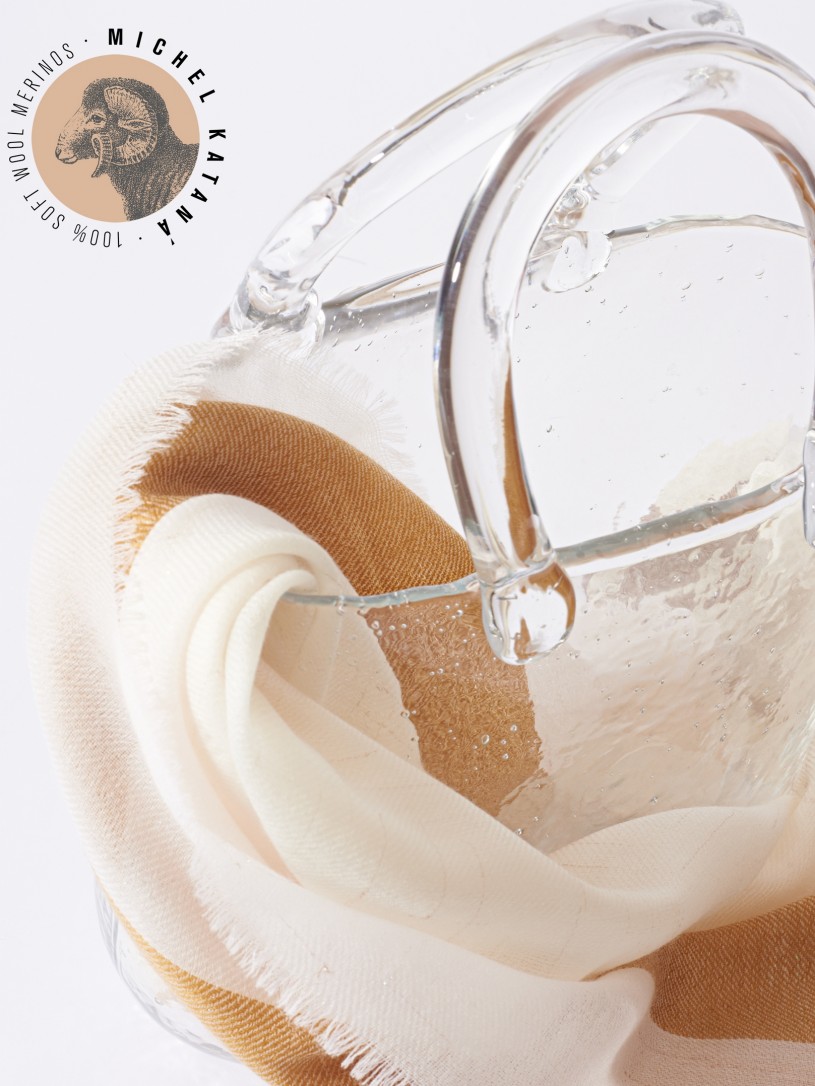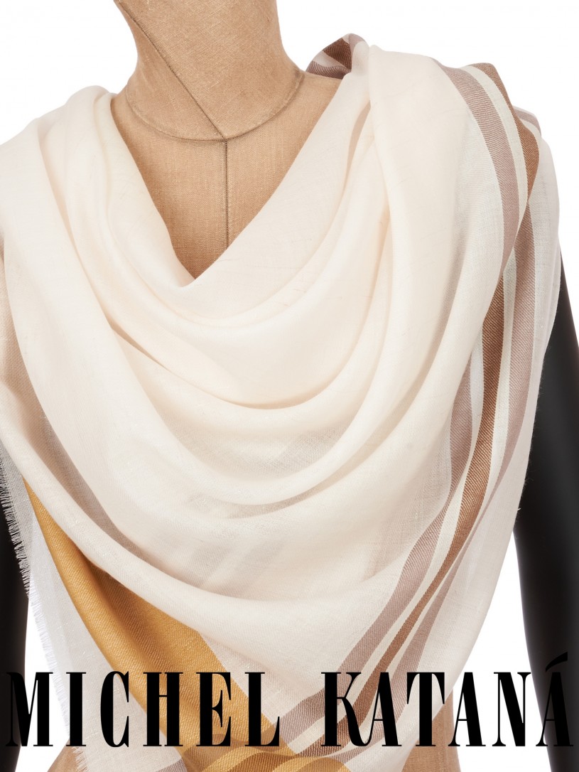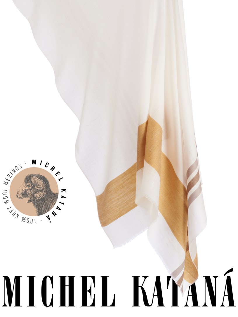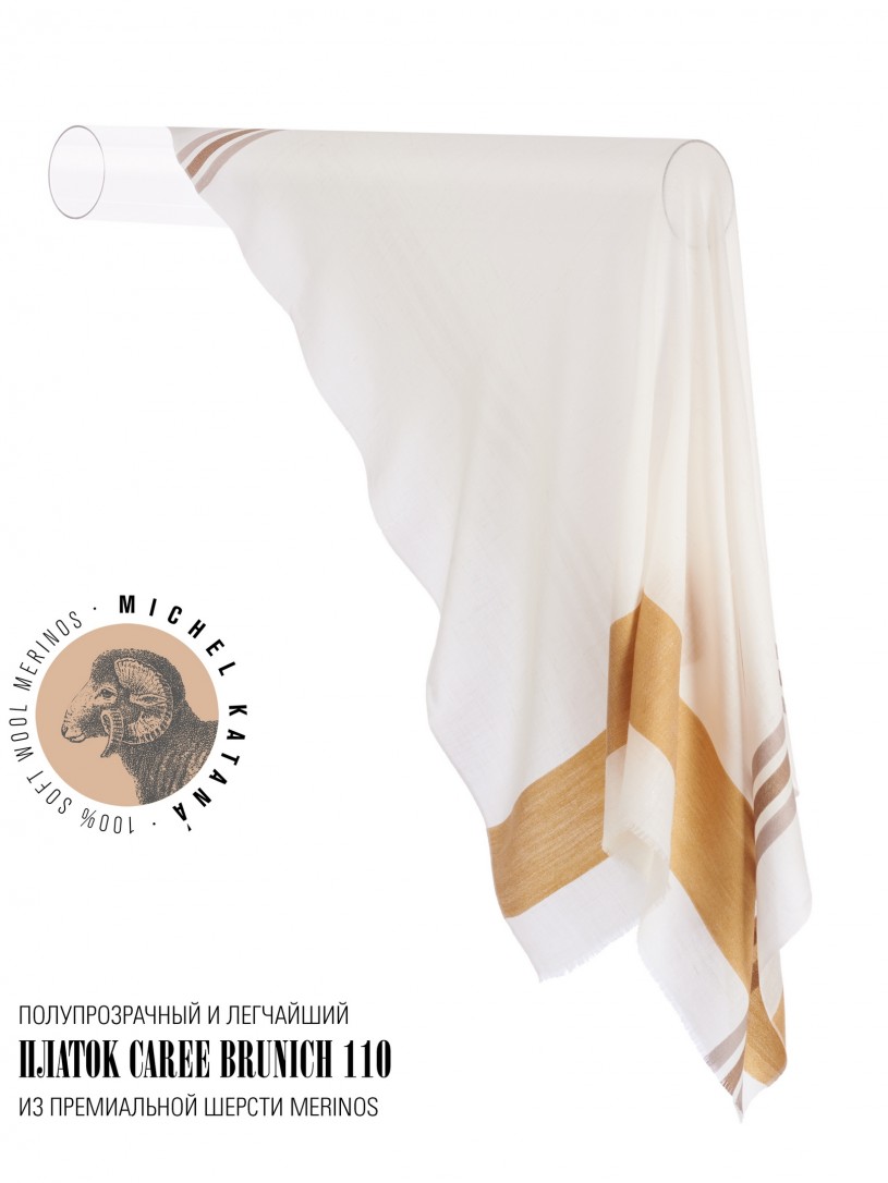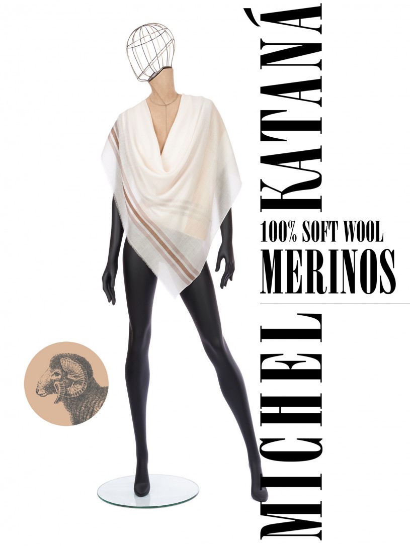 Мягчайшая Шерсть MERINOS, ручная пряжа. Деликатное плетенье TWILL с характерной текстурой рисунка. Нежная в прикосновении к шее, гладкая, отлично держащая форму ткань. Вес изделия 55г (70 г/м2). Небросский, но в то же время четкий в деталь рисунок нанесенный техникой PLAIN SCRREN PRINTING (трафаретная печать на столе), и некоторые модели в цифровой печати, позволили получить невероятную по текстуре ткань-вуаль с еле заметной насыщенностью между лицевой и оборотной поверхностями - все это отличительные изысканные черты линеек палантинов от Michel Kataná