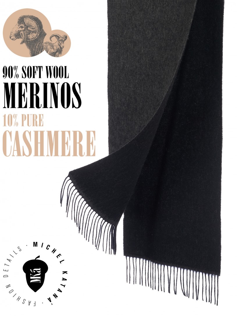 Мягчайший тандем Кашемира из подшерска коз Внутренне-Монгольских пород (10%) и Шерсти MERINOS (90%). 2-х сторонний рисунок, плетение Twill. Нежная в прикосновении к шее, гладкая, достаточно плотная и отлично держащая форму ткань. Вес изделия 150г (220 г/м2). Крафтовая, вручную скрученная добротная бахрома. Четкий в деталь рисунок вручную окрашенной пряжи кашемира позволило получить абсолютно одинаковую насыщенность между лицевой и оборотной поверхностями - все это отличительные изысканные черты линеек шарфов от Michel Kataná