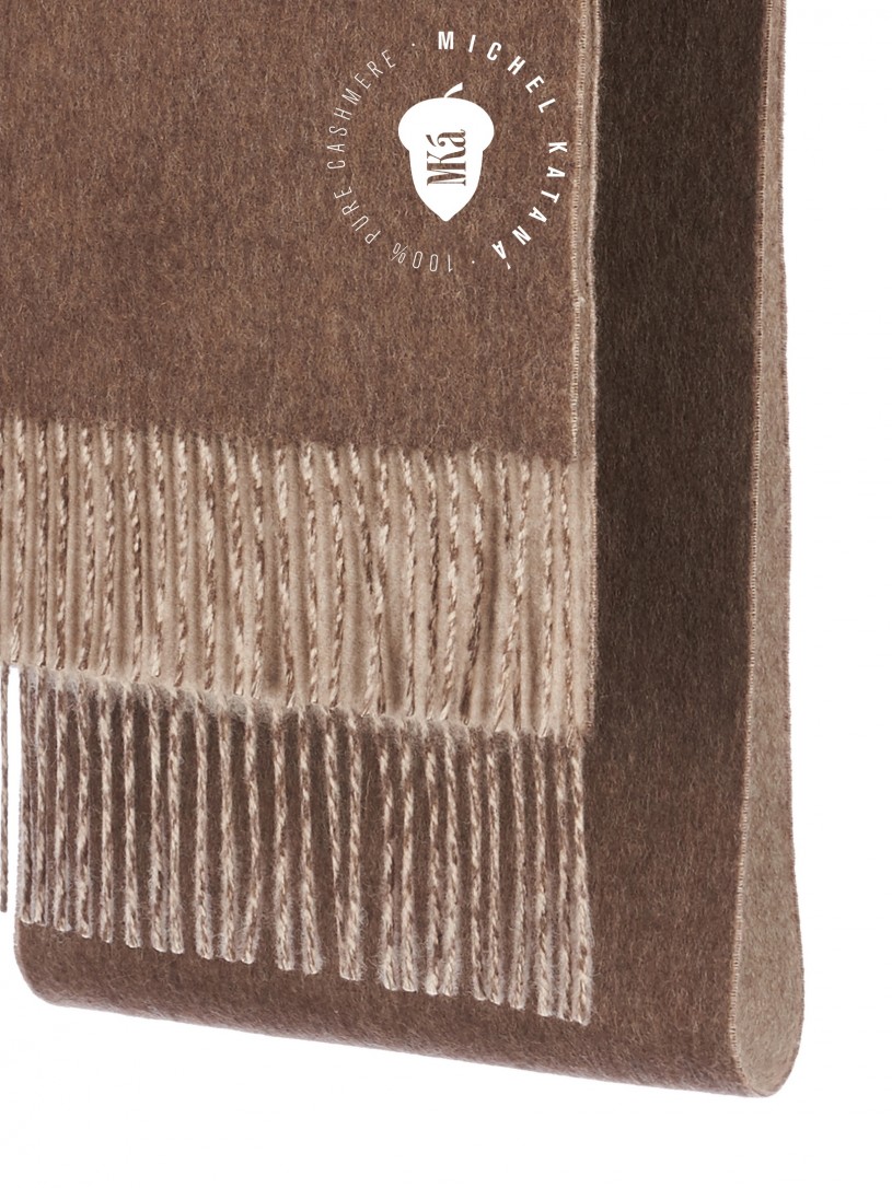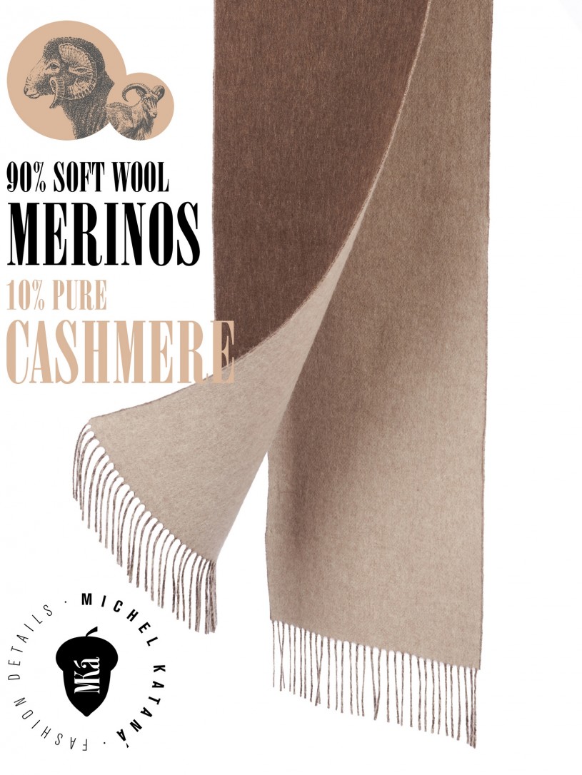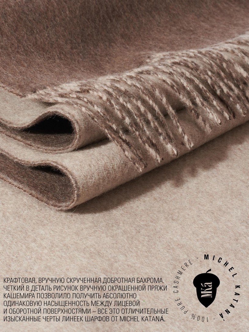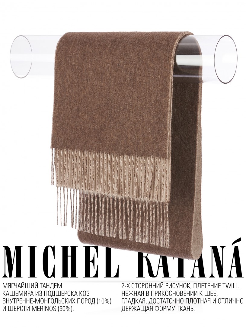 Мягчайший тандем Кашемира из подшерска коз Внутренне-Монгольских пород (10%) и Шерсти MERINOS (90%). 2-х сторонний рисунок, плетение Twill. Нежная в прикосновении к шее, гладкая, достаточно плотная и отлично держащая форму ткань. Вес изделия 150г (220 г/м2). Крафтовая, вручную скрученная добротная бахрома. Четкий в деталь рисунок вручную окрашенной пряжи кашемира позволило получить абсолютно одинаковую насыщенность между лицевой и оборотной поверхностями - все это отличительные изысканные черты линеек шарфов от Michel Kataná