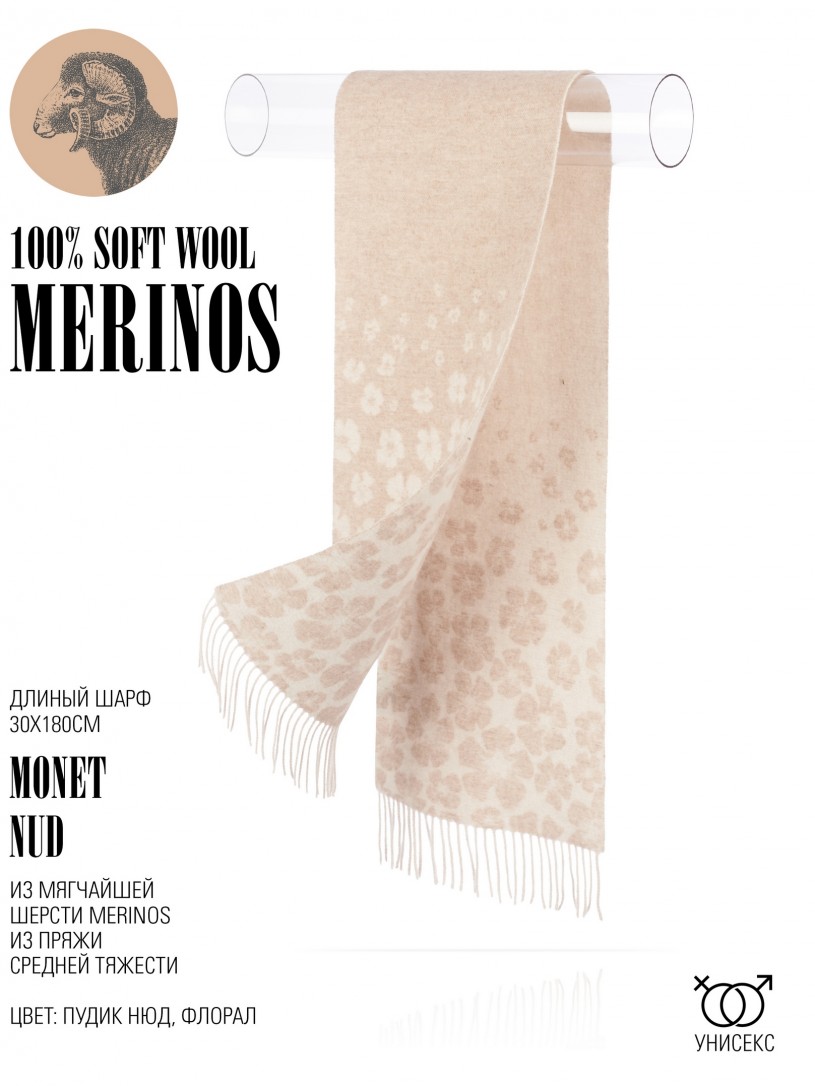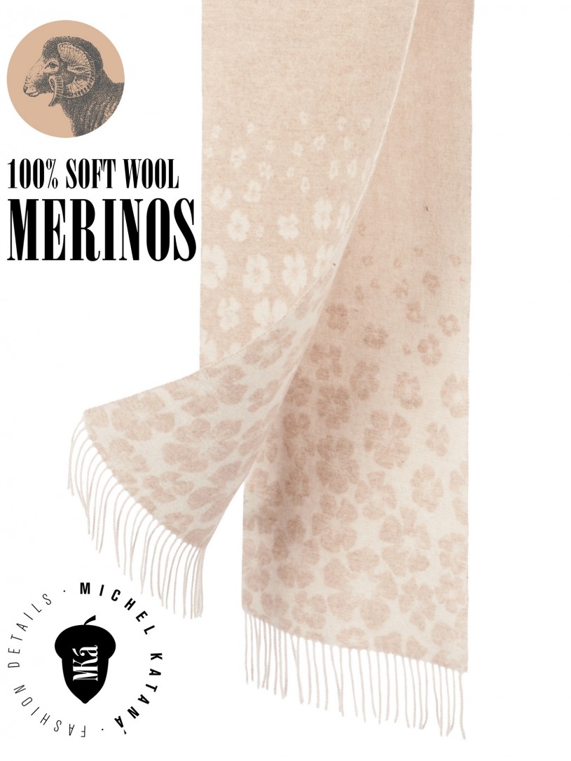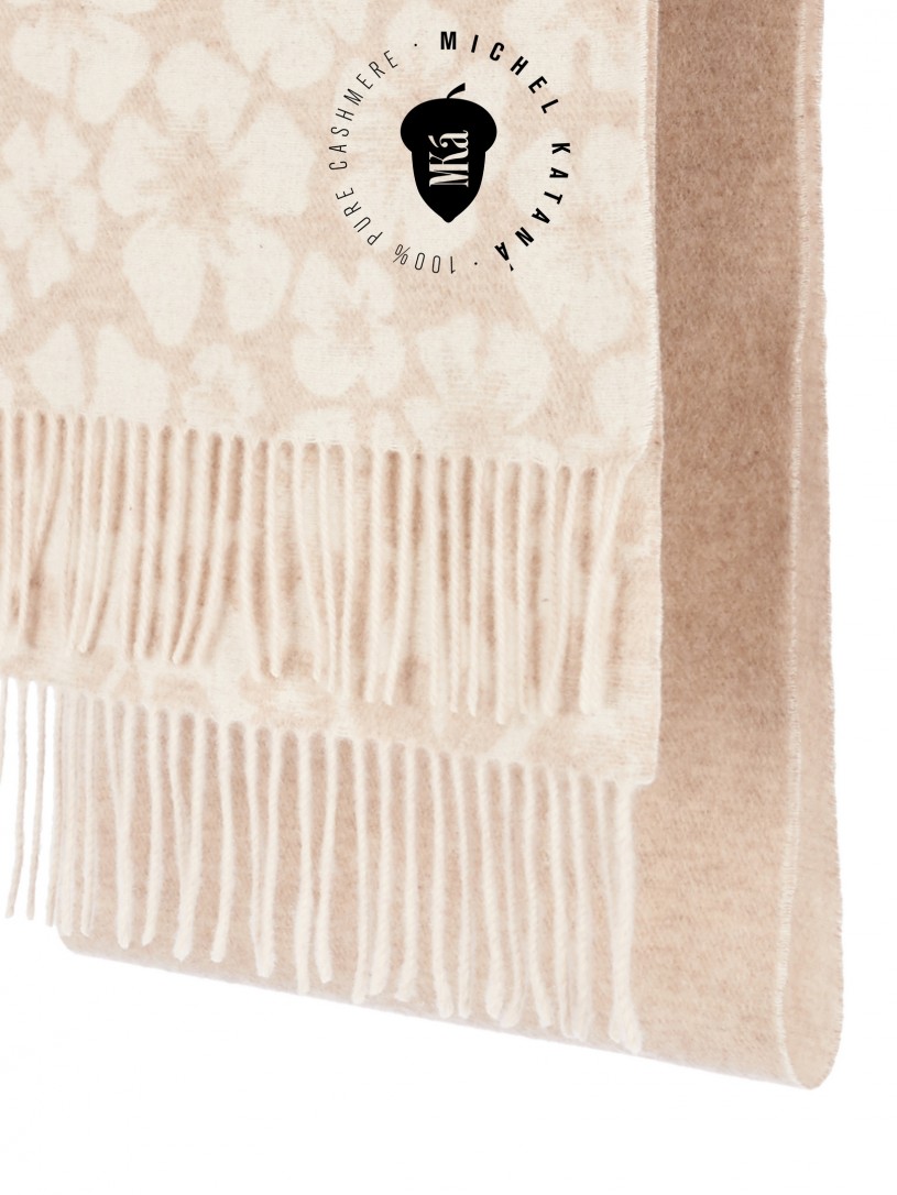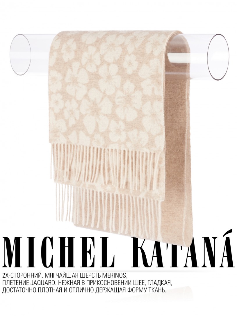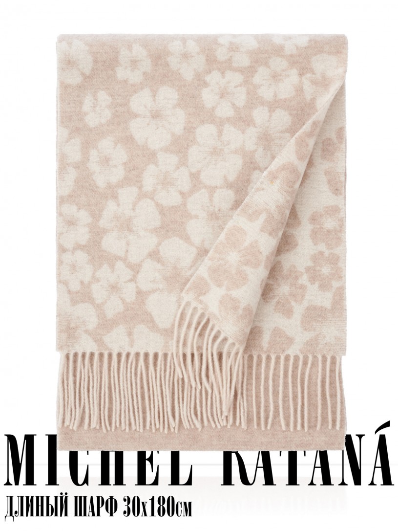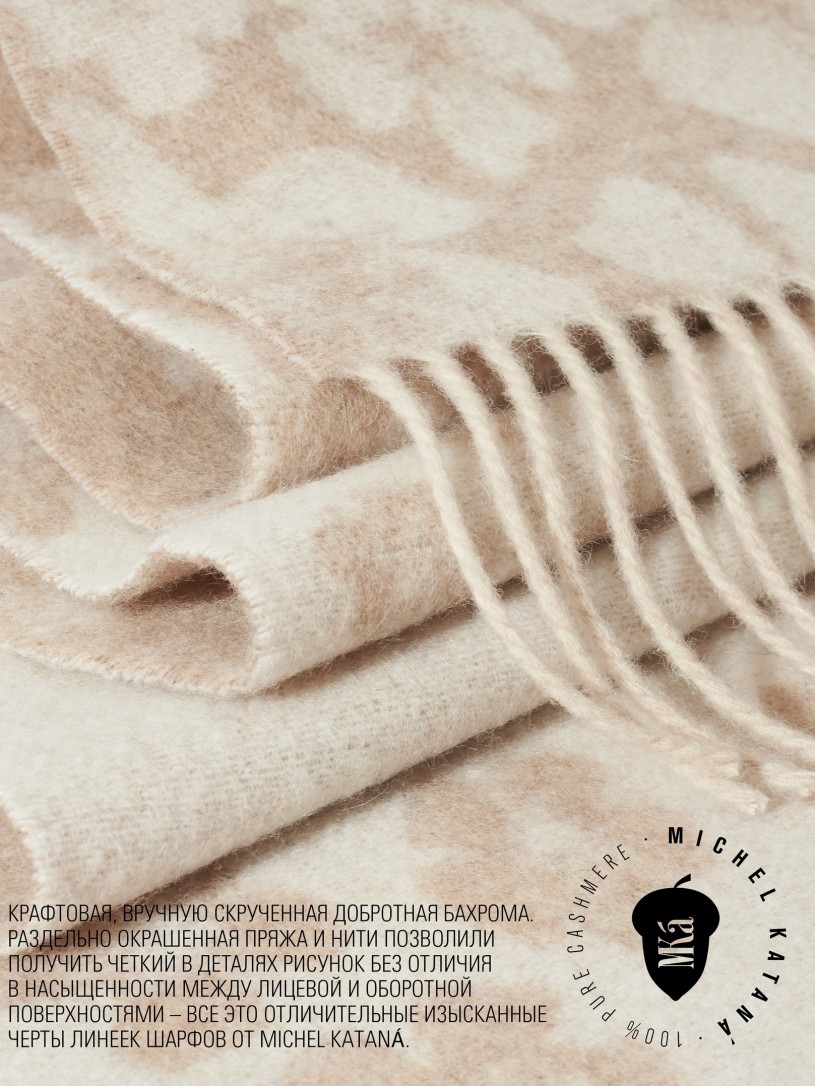 2х-сторонний. Мягчайшая шерсть Merinos, плетение JAQUARD. Нежная в прикосновении шее, гладкая, достаточно плотная и отлично держащая форму ткань. Вес изделия 170г (220 г/м2). Крафтовая, вручную скрученная добротная бахрома. Раздельно окрашенная пряжа и нити позволили получить четкий в деталь рисунок без отличия в насыщенности между лицевой и оборотной поверхностями - все это отличительные изысканные черты линеек шарфов от Michel Kataná.