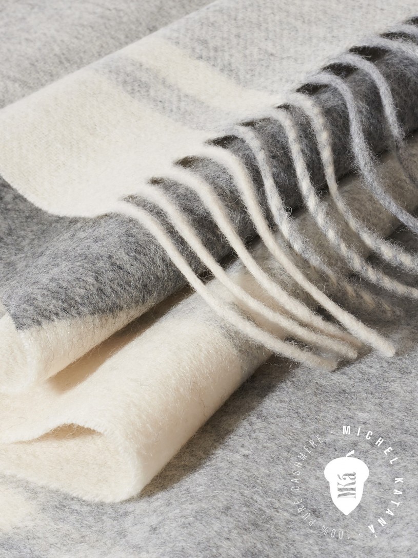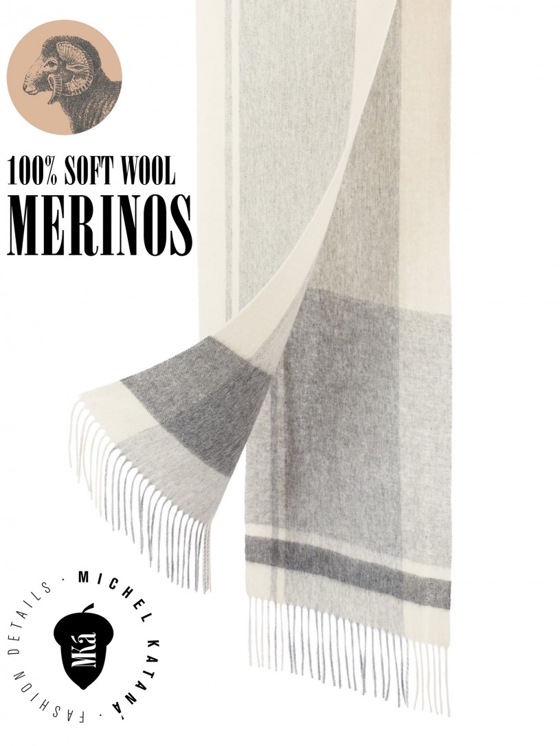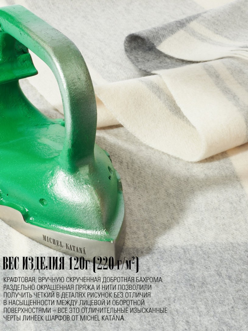 Мягчайшая шерсть Merinos, плетение Twill. Нежная в прикосновении шее, гладкая, достаточно плотная и отлично держащая форму ткань. Вес изделия 120г (220 г/м2). Крафтовая, вручную скрученная добротная бахрома. Раздельно окрашенная пряжа и нити позволили получить четкий в деталь рисунок без отличия в насыщенности между лицевой и оборотной поверхностями - все это отличительные изысканные черты линеек шарфов от Michel Kataná.