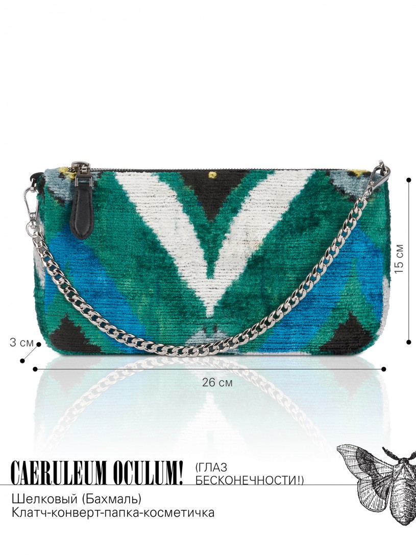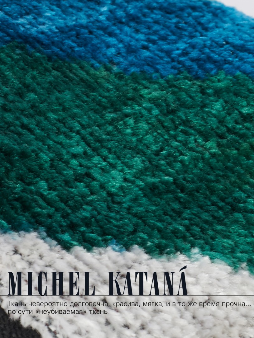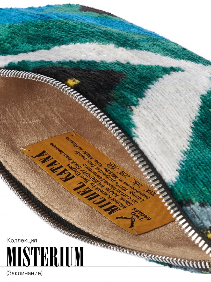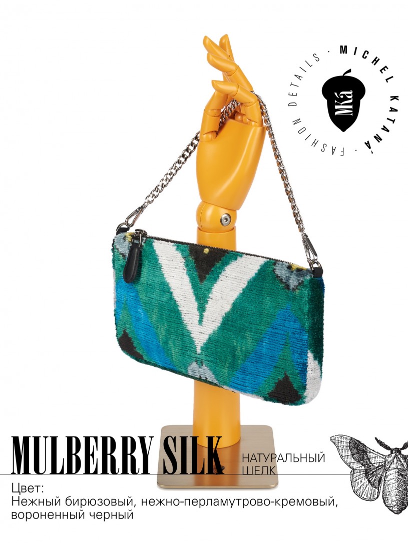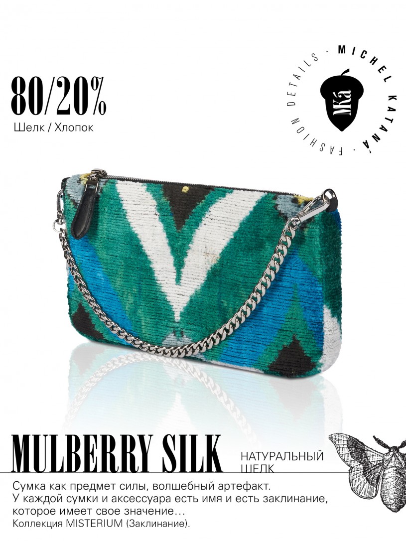Натуральный шелк, сотканная вручную по традиционной и аутентичной технологии ручного ткачества в Ферганской долине Узбекистана (Маргилан) ткань Бахмаль. Из нитей шелка окрашенных также вручную натуральными красителями. Ткут ее именно крафтово, в домашних условиях на традиционных крафтовых ткацких станках. Нити шелка вотканы в структуру из нитей хлопка, в весовых пропорциях приблизительно 80/20% Шелк/Хлопок. Ткань невероятно долговечна, красива, мягка, и в то же время прочна... по сути "неубиваемая" ткань. Именно на перекрестке этого традиционного характерного, и эстетики дизайнерского восприятия от Michel Kataná и появилась эта коллекция сумок и аксессуаров к ним, на дальнейший пошив которых уходит еще не менее 72 часов работы мастеров для каждой.