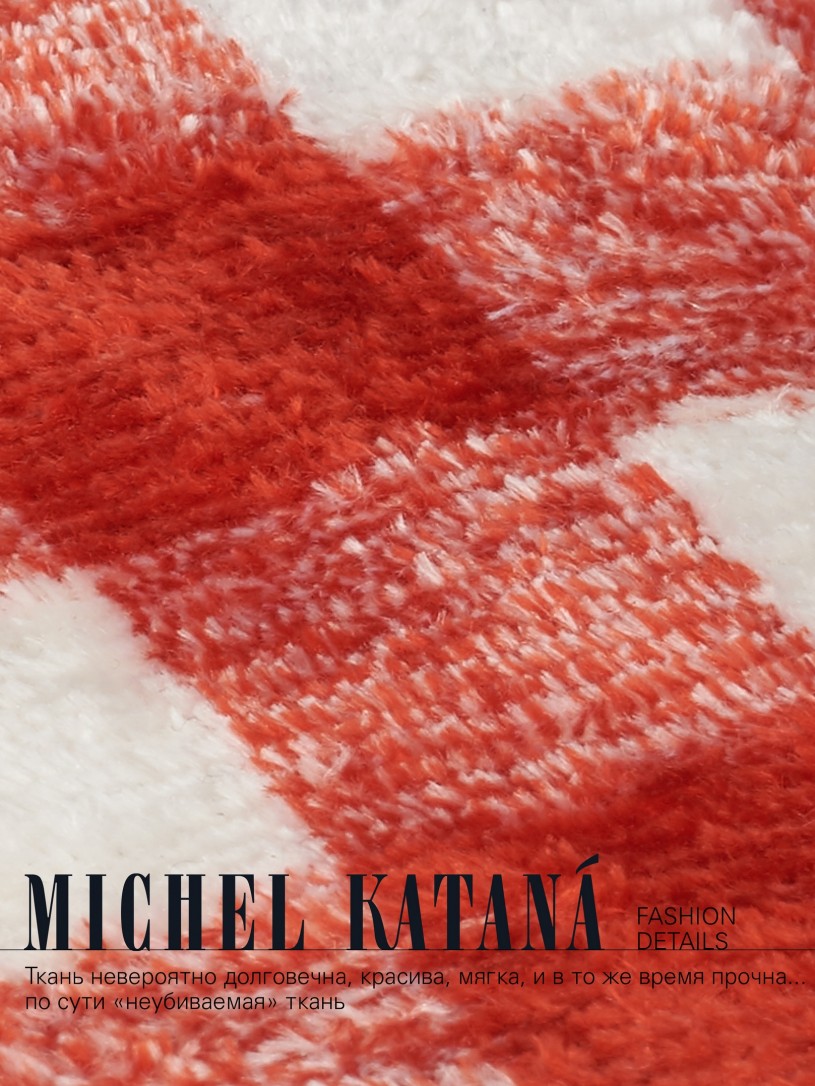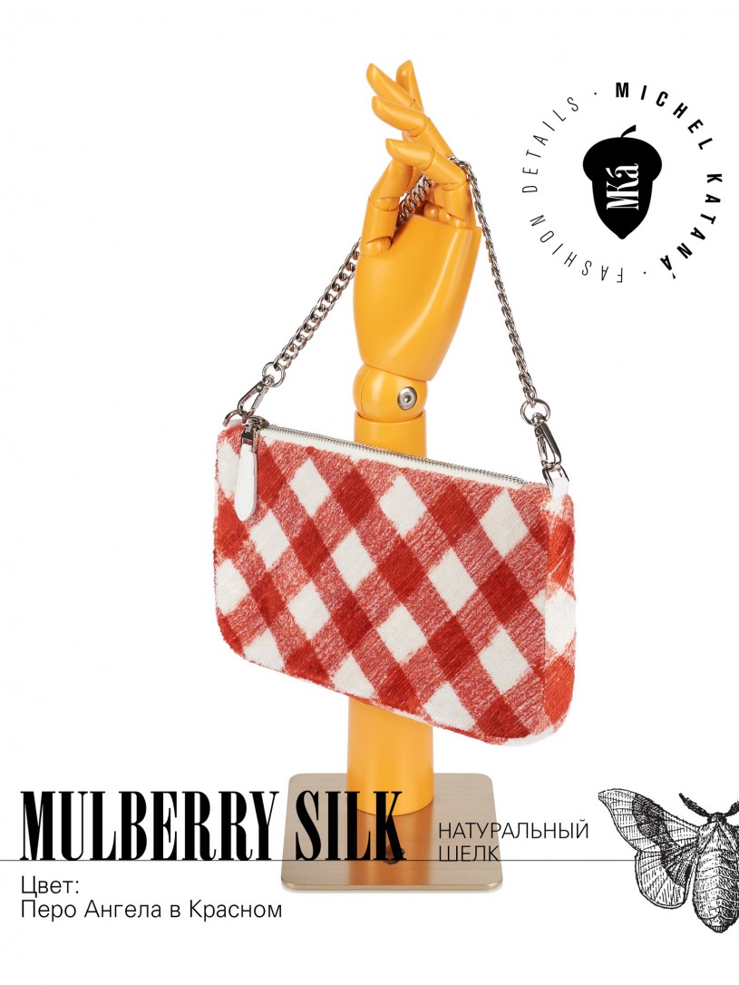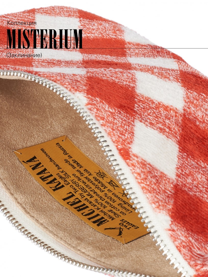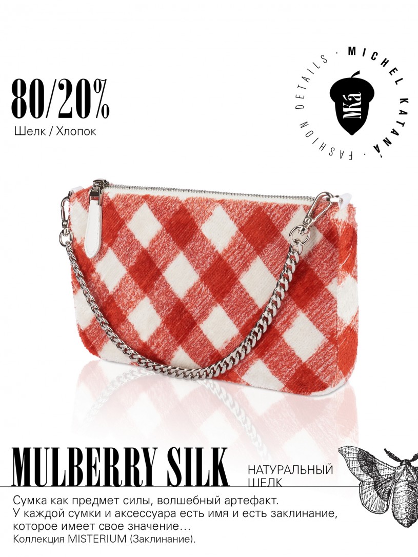 Натуральный шелк, сотканная вручную по традиционной и аутентичной технологии ручного ткачества в Ферганской долине Узбекистана (Маргилан) ткань Бахмаль. Из нитей шелка окрашенных также вручную натуральными красителями. Ткут ее именно крафтово, в домашних условиях на традиционных крафтовых ткацких станках. Нити шелка вотканы в структуру из нитей хлопка, в весовых пропорциях приблизительно 80/20% Шелк/Хлопок. Ткань невероятно долговечна, красива, мягка, и в то же время прочна... по сути "неубиваемая" ткань. Именно на перекрестке этого традиционного характерного, и эстетики дизайнерского восприятия от Michel Kataná и появилась эта коллекция сумок и аксессуаров к ним, на дальнейший пошив которых уходит еще не менее 72 часов работы мастеров для каждой.