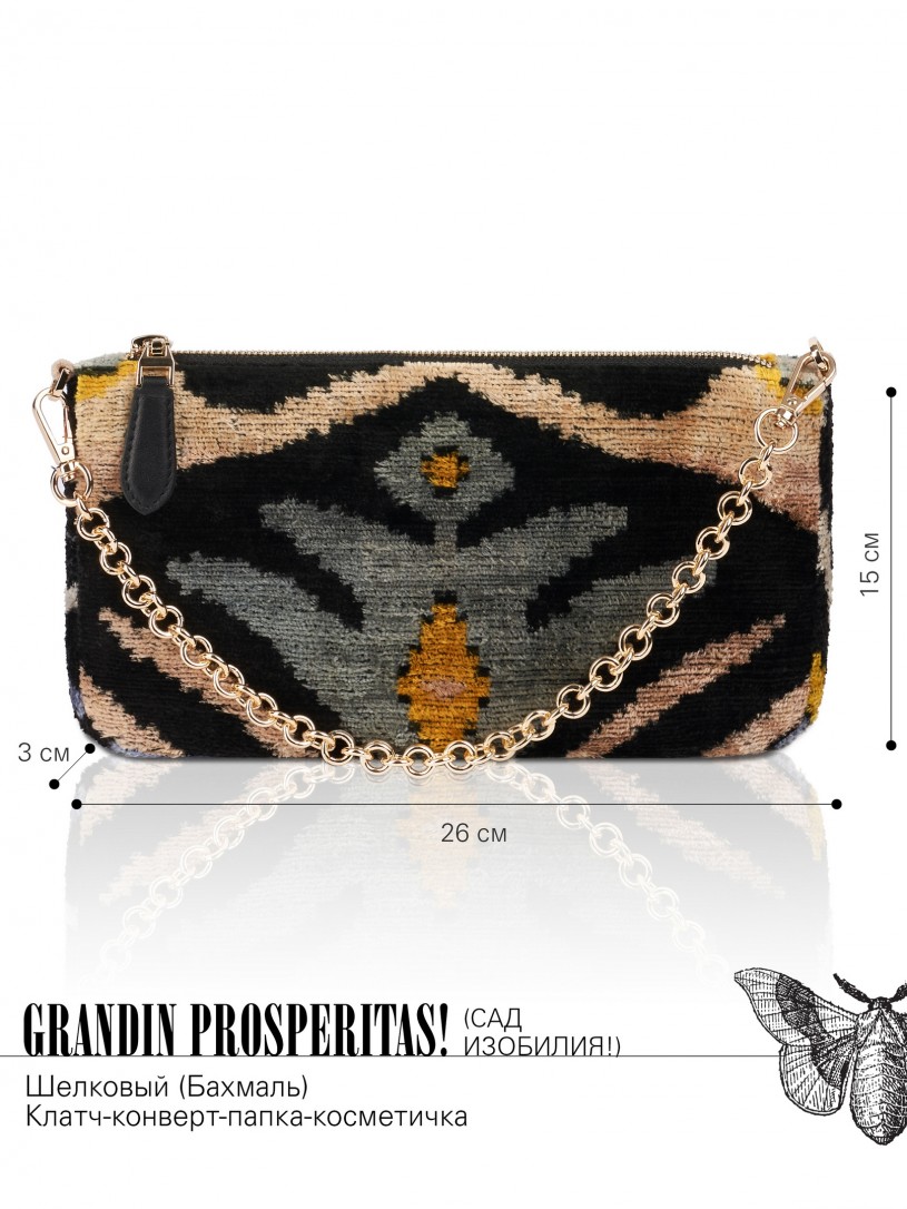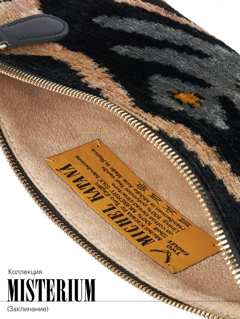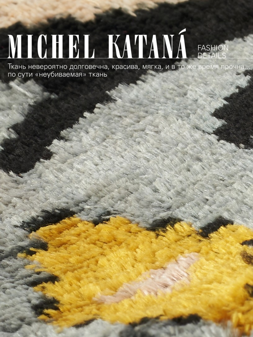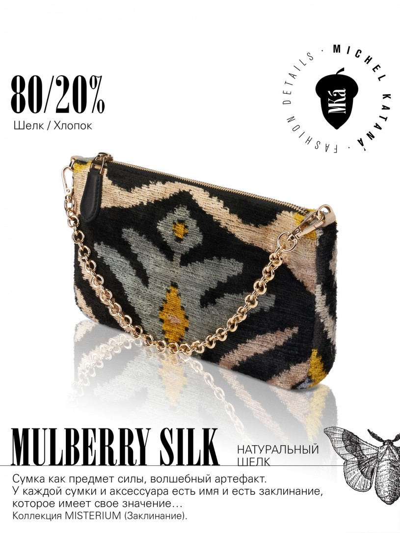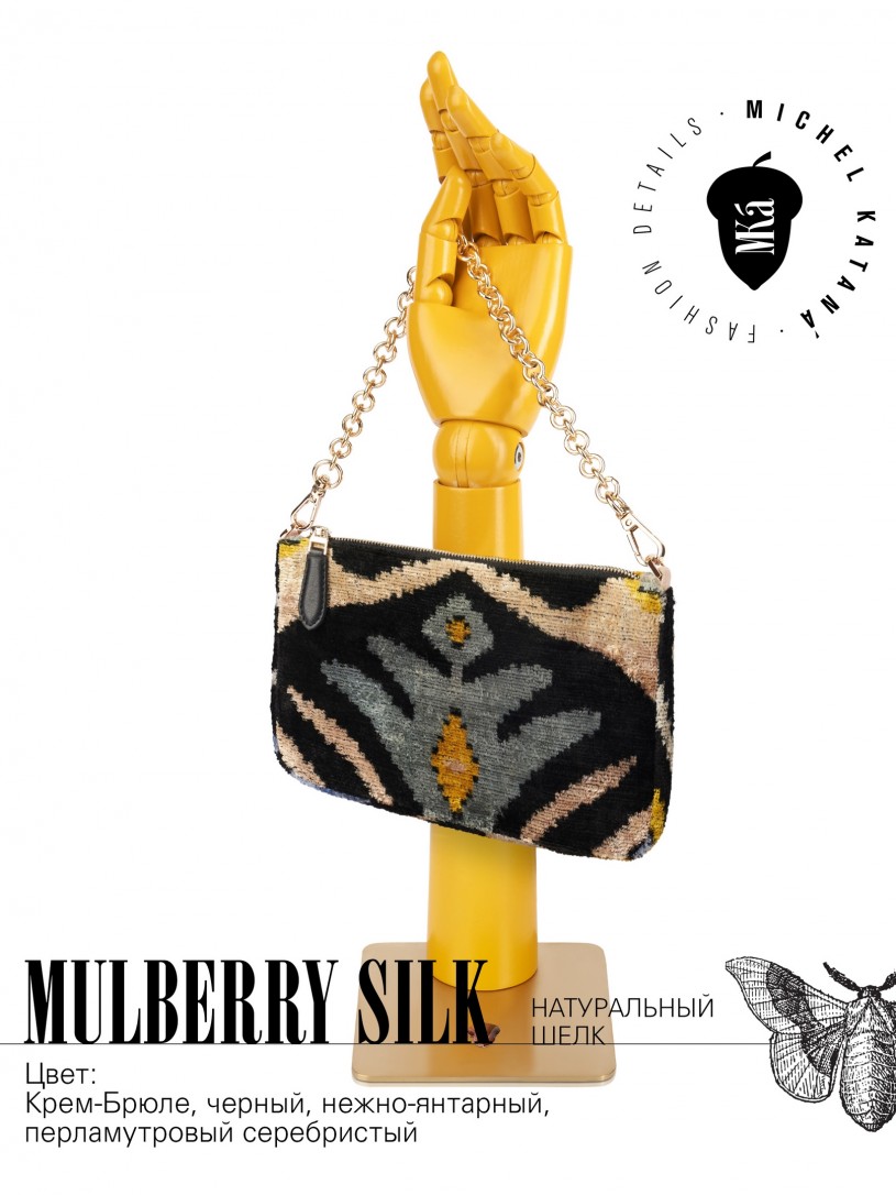 Натуральный шелк, сотканная вручную по традиционной и аутентичной технологии ручного ткачества в Ферганской долине Узбекистана (Маргилан) ткань Бахмаль. Из нитей шелка окрашенных также вручную натуральными красителями. Ткут ее именно крафтово, в домашних условиях на традиционных крафтовых ткацких станках. Нити шелка вотканы в структуру из нитей хлопка, в весовых пропорциях приблизительно 80/20% Шелк/Хлопок. Ткань невероятно долговечна, красива, мягка, и в то же время прочна... по сути "неубиваемая" ткань. Именно на перекрестке этого традиционного характерного, и эстетики дизайнерского восприятия от Michel Kataná и появилась эта коллекция сумок и аксессуаров к ним, на дальнейший пошив которых уходит еще не менее 72 часов работы мастеров для каждой.