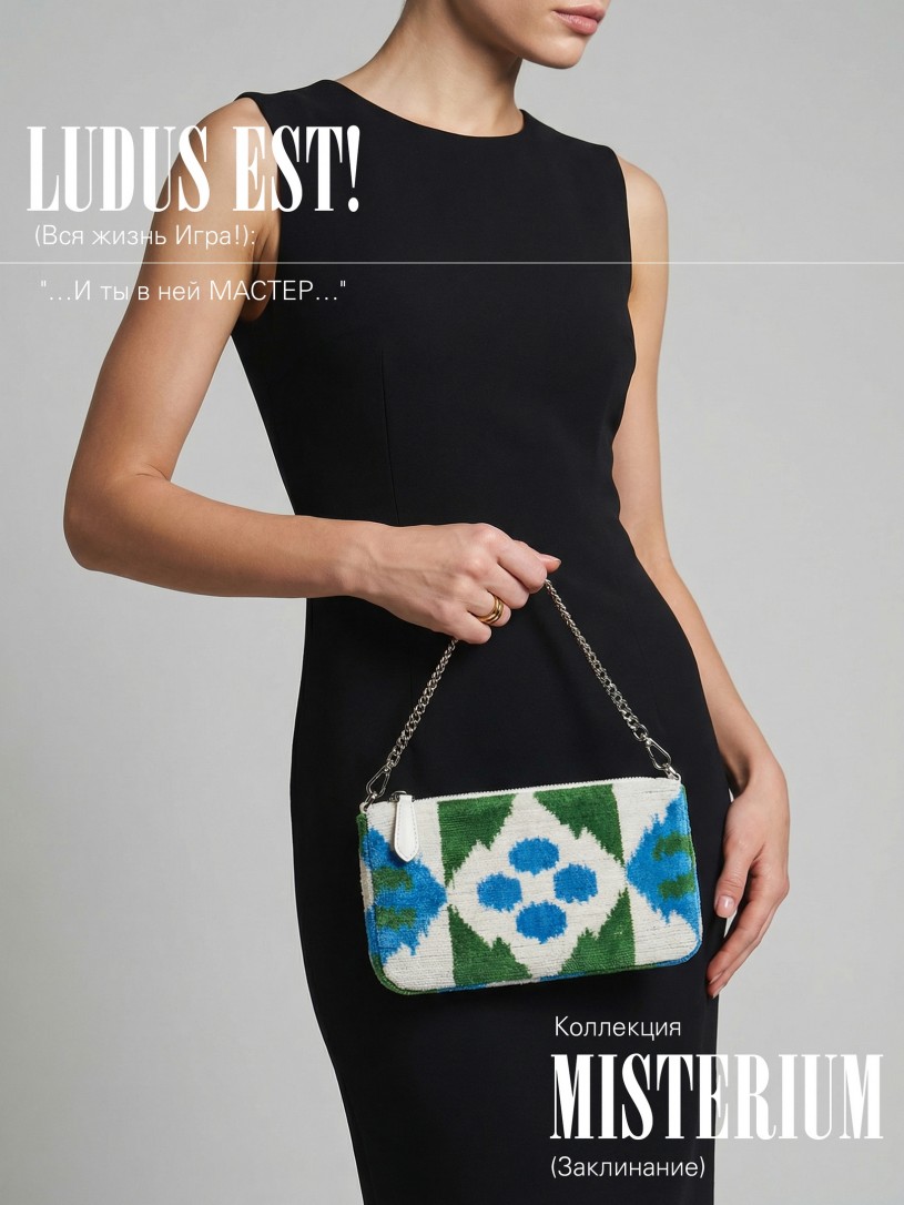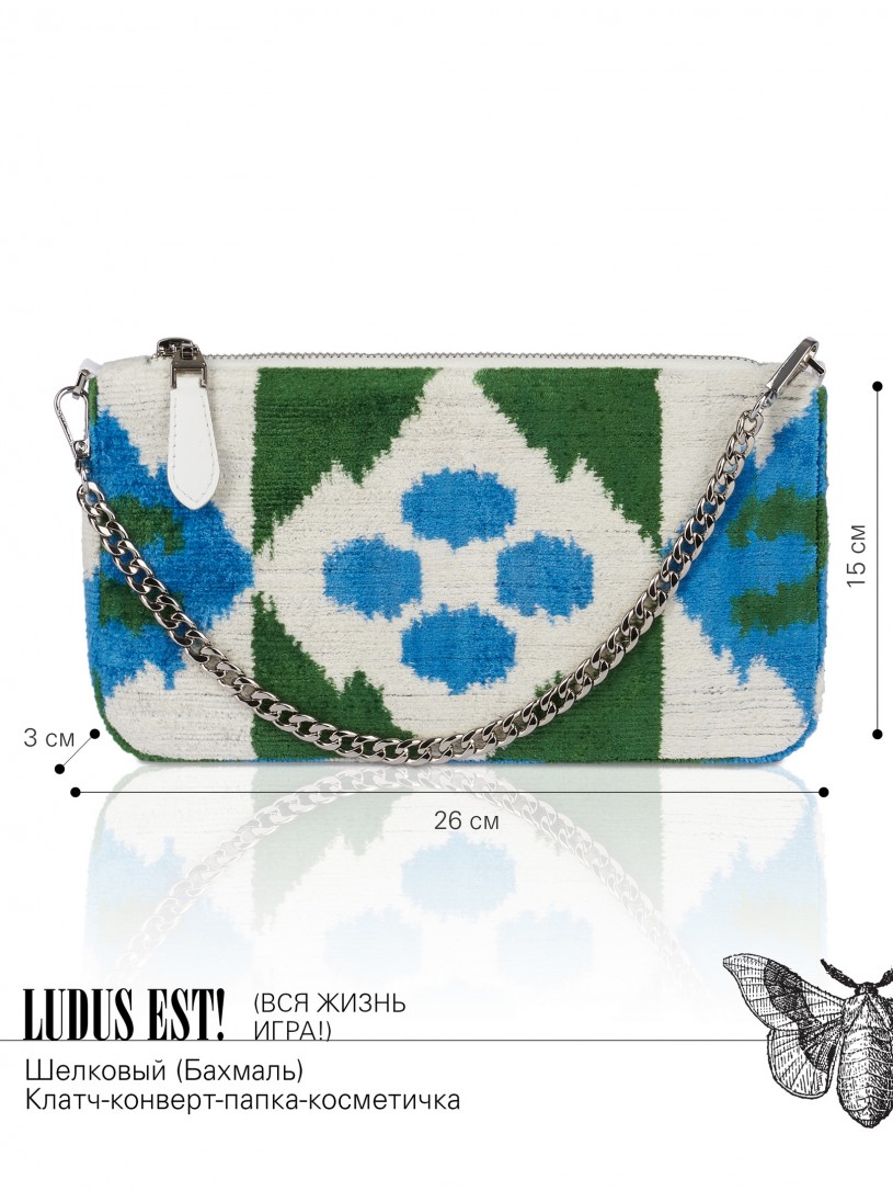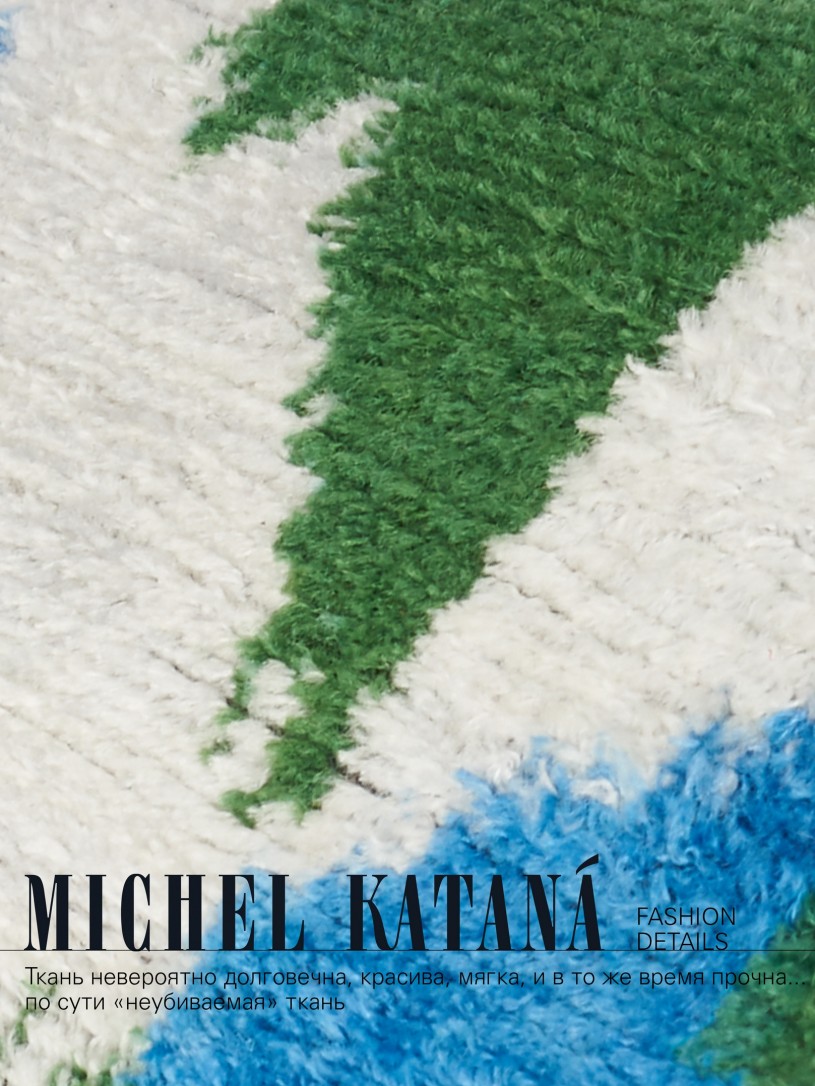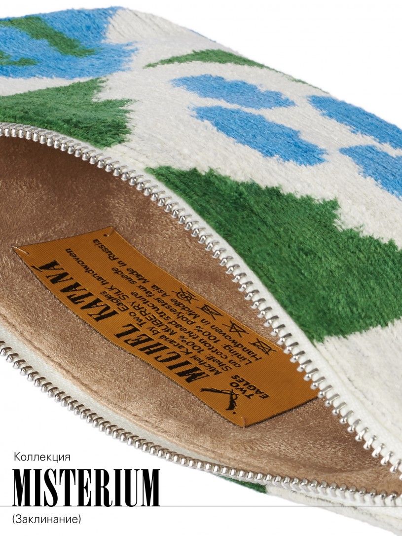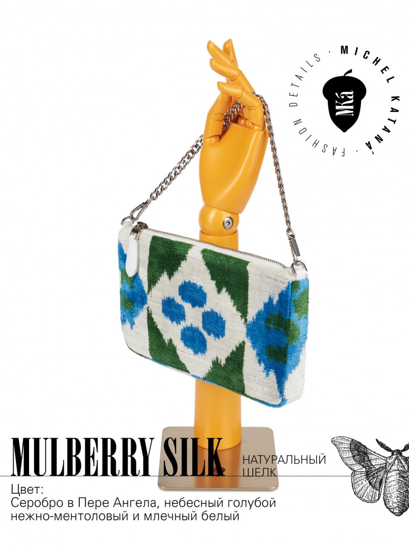 Натуральный шелк, сотканная вручную по традиционной и аутентичной технологии ручного ткачества в Ферганской долине Узбекистана (Маргилан) ткань Бахмаль. Из нитей шелка окрашенных также вручную натуральными красителями. Ткут ее именно крафтово, в домашних условиях на традиционных крафтовых ткацких станках. Нити шелка вотканы в структуру из нитей хлопка, в весовых пропорциях приблизительно 80/20% Шелк/Хлопок. Ткань невероятно долговечна, красива, мягка, и в то же время прочна... по сути "неубиваемая" ткань. Именно на перекрестке этого традиционного характерного, и эстетики дизайнерского восприятия от Michel Kataná и появилась эта коллекция сумок и аксессуаров к ним, на дальнейший пошив которых уходит еще не менее 72 часов работы мастеров для каждой.