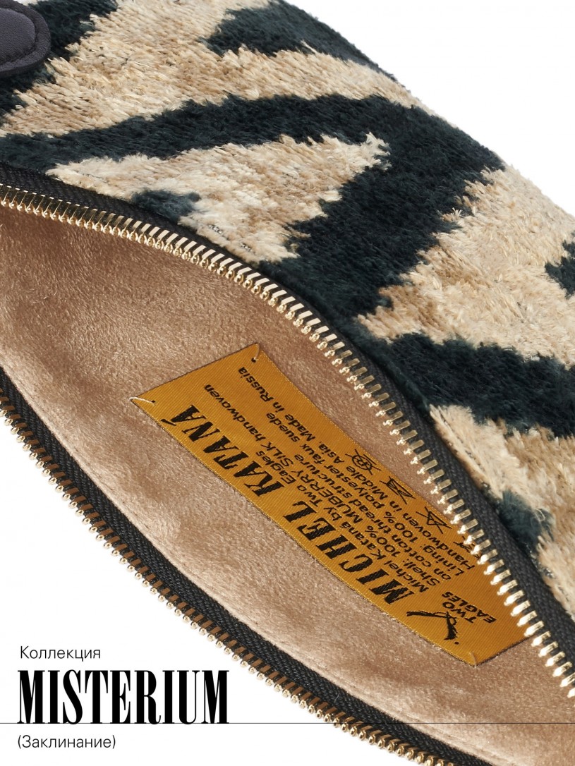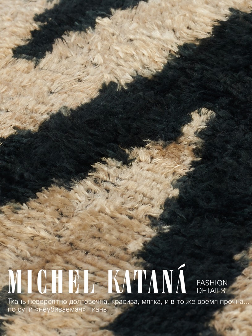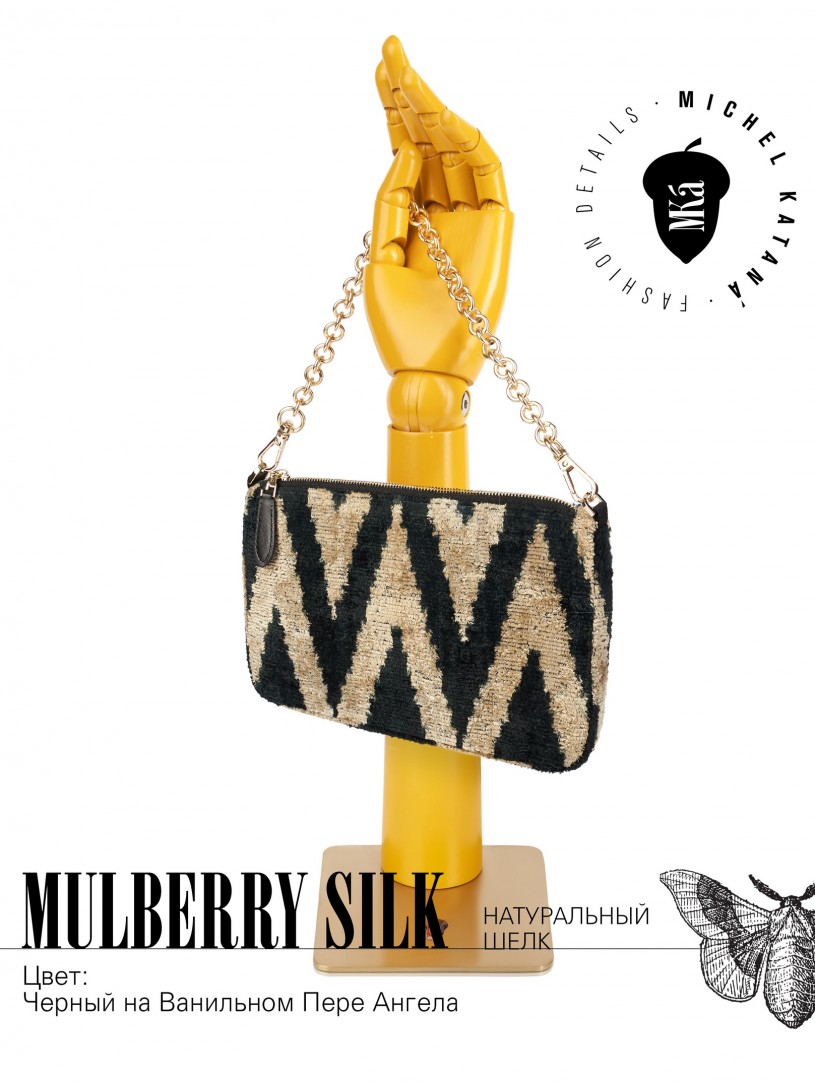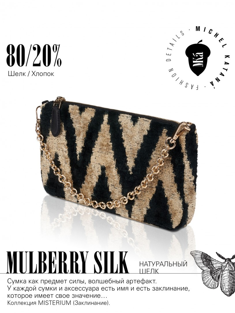 Натуральный шелк, сотканная вручную по традиционной и аутентичной технологии ручного ткачества в Ферганской долине Узбекистана (Маргилан) ткань Бахмаль. Из нитей шелка окрашенных также вручную натуральными красителями. Ткут ее именно крафтово, в домашних условиях на традиционных крафтовых ткацких станках. Нити шелка вотканы в структуру из нитей хлопка, в весовых пропорциях приблизительно 80/20% Шелк/Хлопок. Ткань невероятно долговечна, красива, мягка, и в то же время прочна... по сути "неубиваемая" ткань. Именно на перекрестке этого традиционного характерного, и эстетики дизайнерского восприятия от Michel Kataná и появилась эта коллекция сумок и аксессуаров к ним, на дальнейший пошив которых уходит еще не менее 72 часов работы мастеров для каждой.