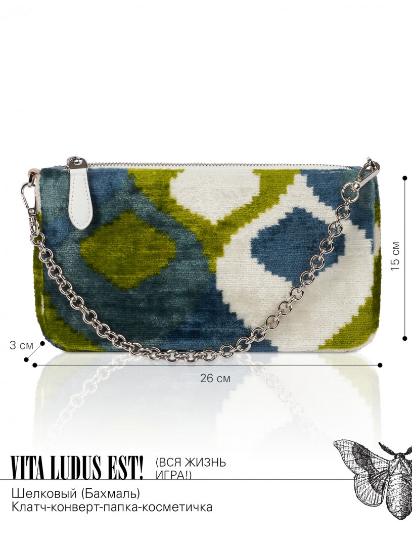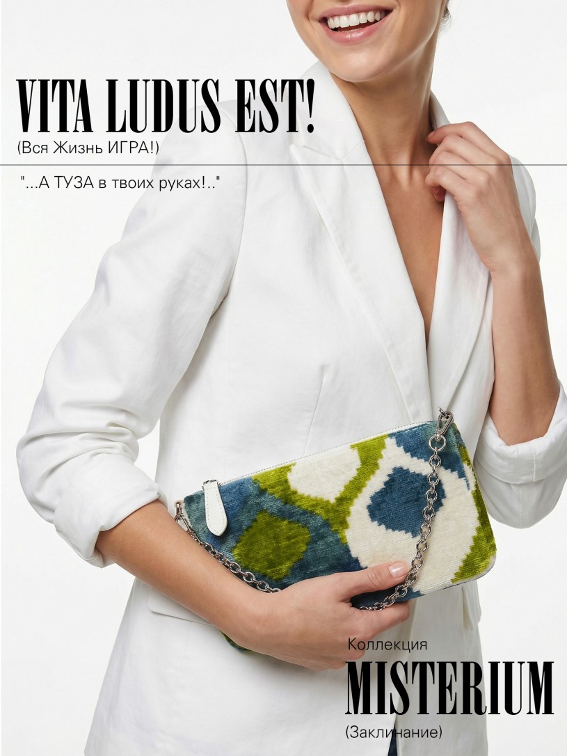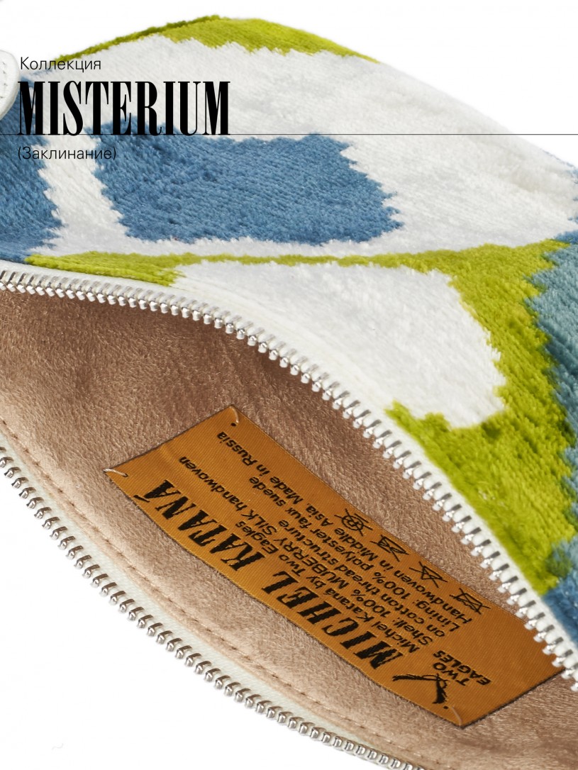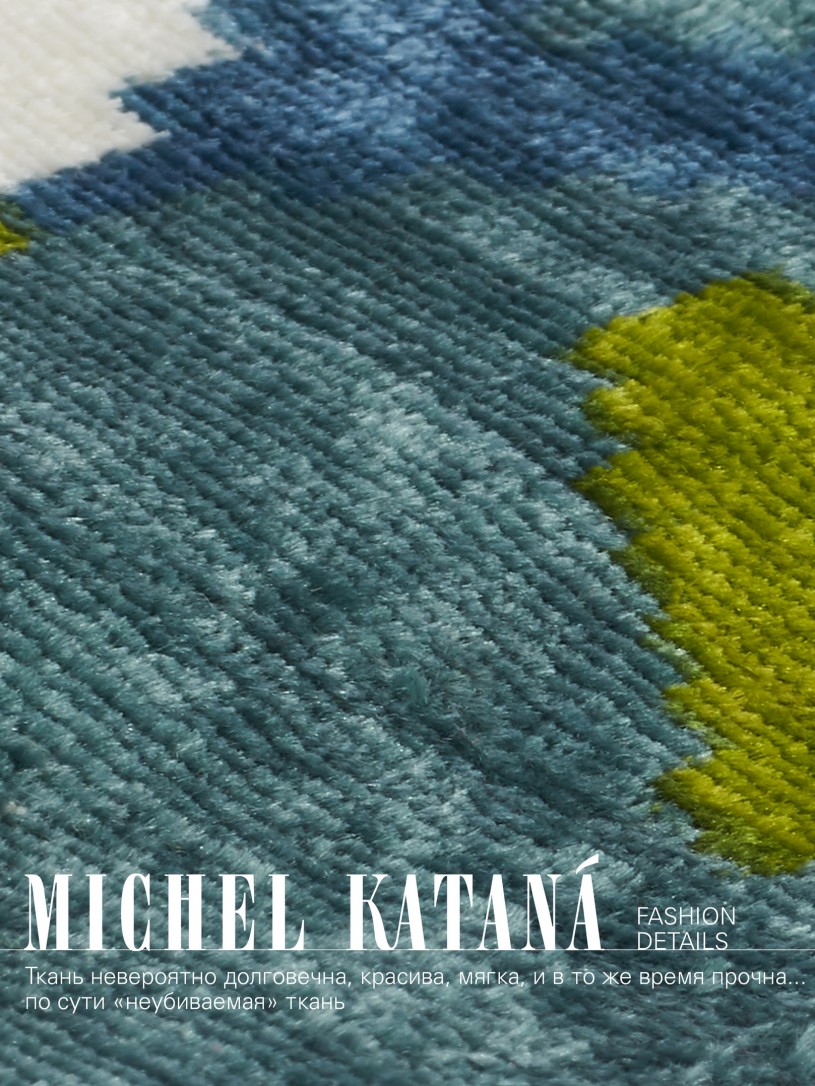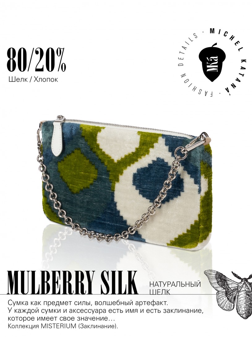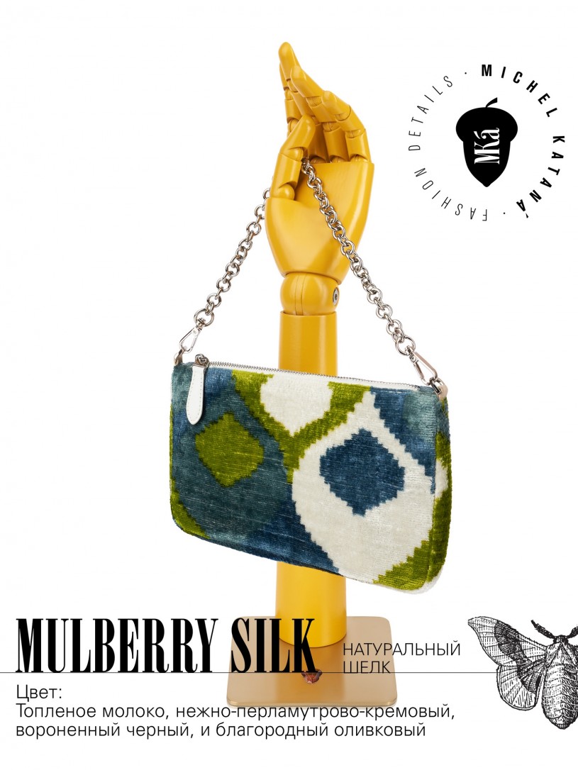 Натуральный шелк, сотканная вручную по традиционной и аутентичной технологии ручного ткачества в Ферганской долине Узбекистана (Маргилан) ткань Бахмаль. Из нитей шелка окрашенных также вручную натуральными красителями. Ткут ее именно крафтово, в домашних условиях на традиционных крафтовых ткацких станках. Нити шелка вотканы в структуру из нитей хлопка, в весовых пропорциях приблизительно 80/20% Шелк/Хлопок. Ткань невероятно долговечна, красива, мягка, и в то же время прочна... по сути "неубиваемая" ткань. Именно на перекрестке этого традиционного характерного, и эстетики дизайнерского восприятия от Michel Kataná и появилась эта коллекция сумок и аксессуаров к ним, на дальнейший пошив которых уходит еще не менее 72 часов работы мастеров для каждой.
