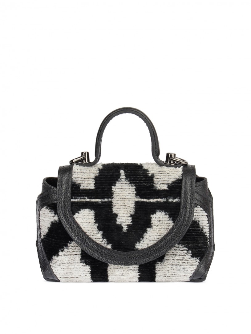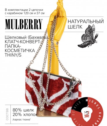 Натуральный шелк, сотканная вручную по традиционной и аутентичной технологии ручного ткачества в Ферганской долине Узбекистана (Маргилан) ткань Бахмаль. Из нитей шелка окрашенных также вручную натуральными красителями. Ткут ее именно крафтово, в домашних условиях на традиционных крафтовых ткацких станках. Нити шелка вотканы в структуру из нитей хлопка, в весовых пропорциях приблизительно 80/20% Шелк/Хлопок. Ткань невероятно долговечна, красива, мягка, и в то же время прочна... по сути "неубиваемая" ткань. Именно на перекрестке этого традиционного характерного, и эстетики дизайнерского восприятия от Michel Kataná и появилась эта коллекция сумок и аксессуаров к ним, на дальнейший пошив которых уходит еще не менее 72 часов работы мастеров для каждой.
